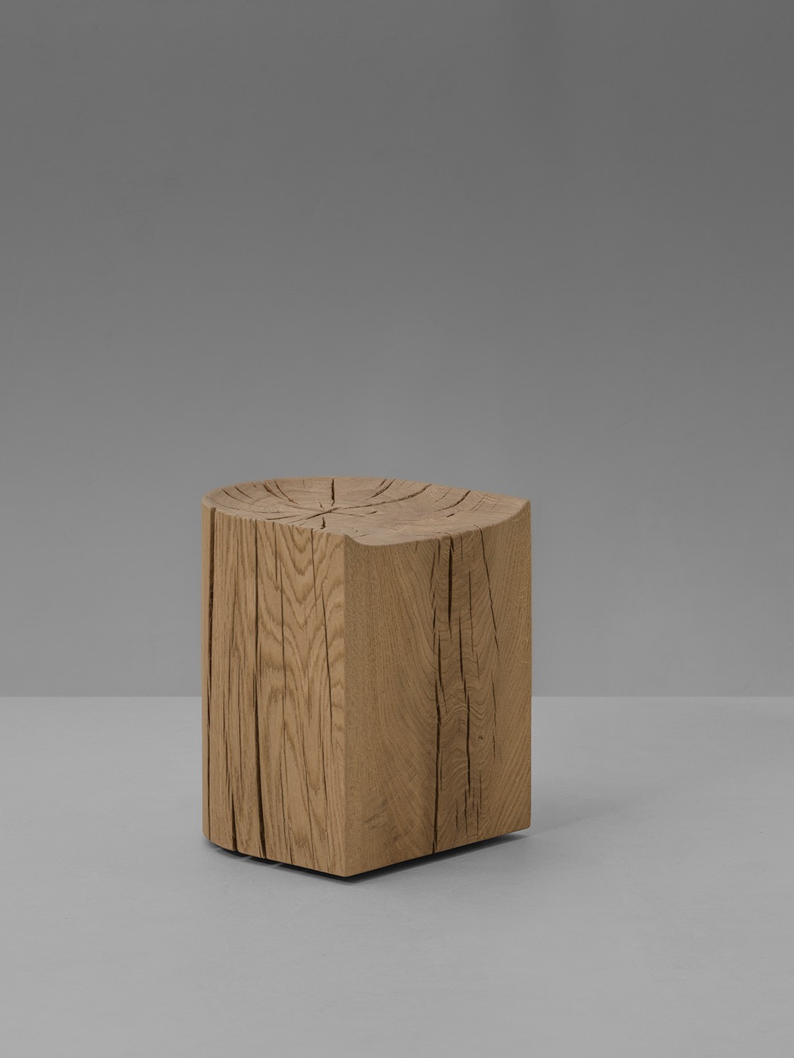 ADJACENCIES Stool to wyrazisty stołek o surowej, przypominającej blok formie, gdzie ostre kanciaste krawędzie spotykają się z zaokrąglonymi narożnikami z tyłu. Surowe wykończenie odsłania wrodzoną fakturę i słoje drewna, pozwalając naturalnemu materiałowi subtelnie kształtować mebel. Dostępny w dębie francuskim.