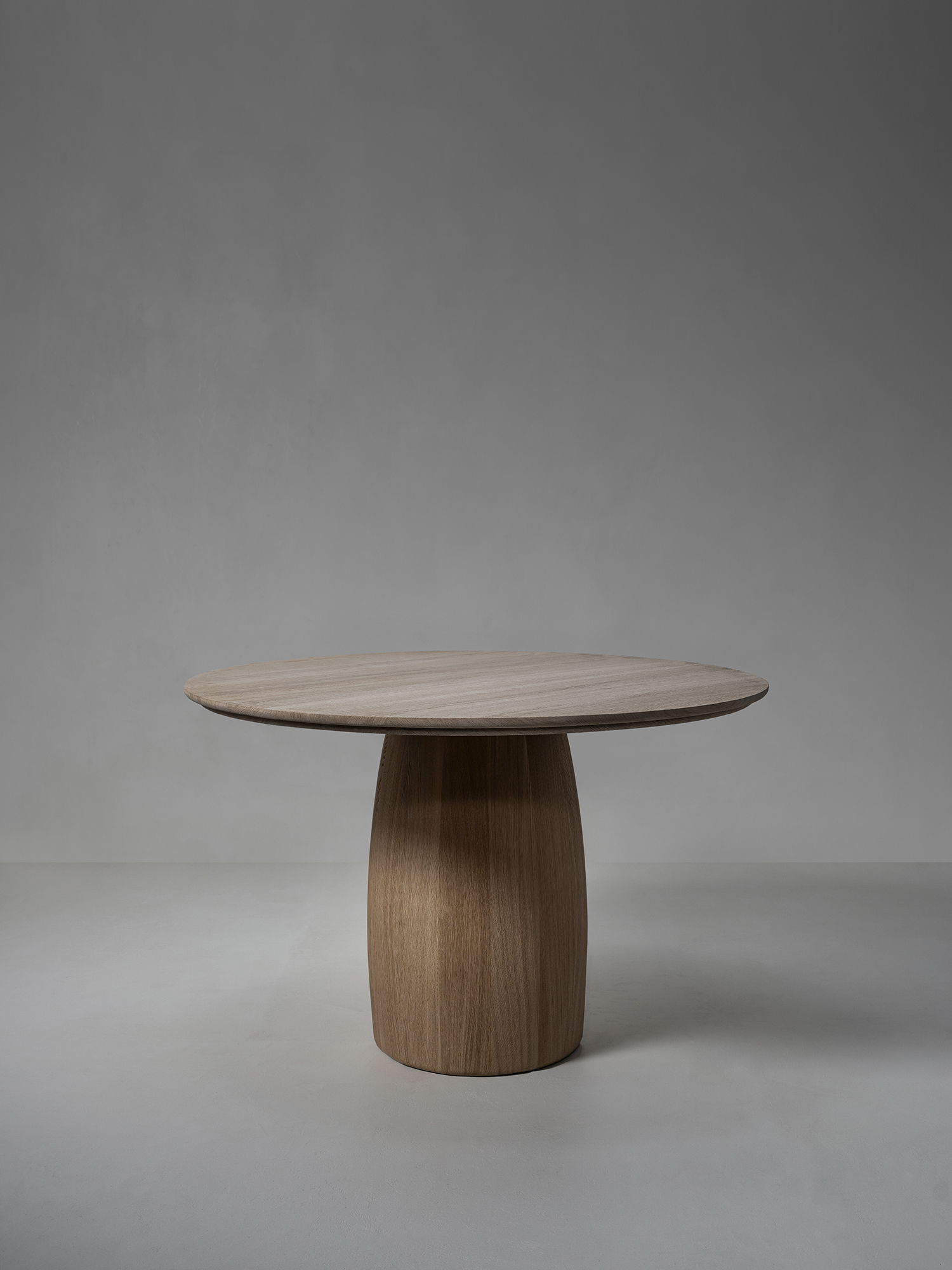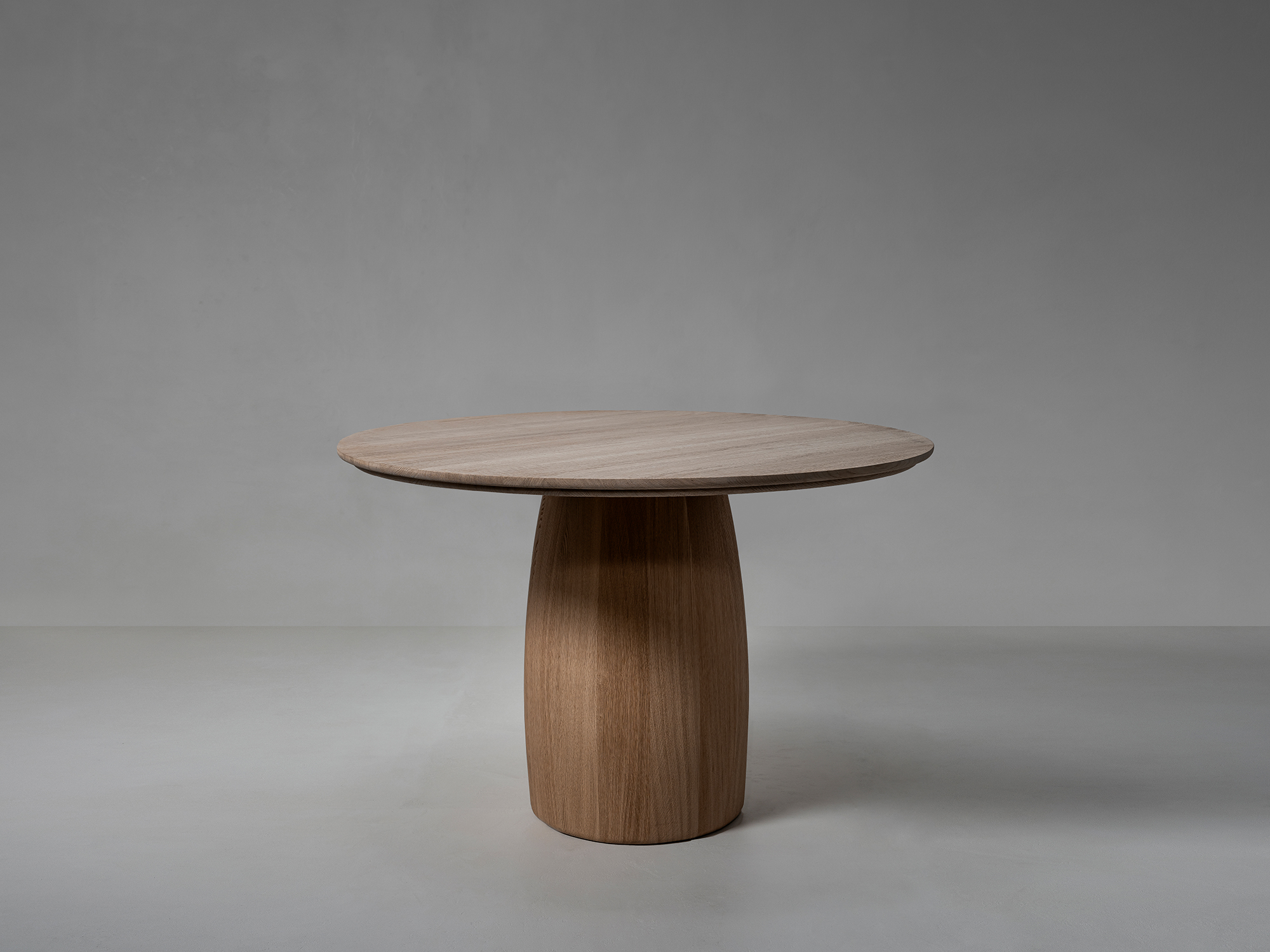 BARREL Bar Table Round to okrągły stół barowy z subtelnie profilowanym blatem, osadzony na rzeźbiarskiej nodze z litego dębu francuskiego lub orzecha. Masywna kolumna stanowi stabilną podstawę formy, podczas gdy delikatnie złagodzona krawędź nadaje bryle wizualnej lekkości.