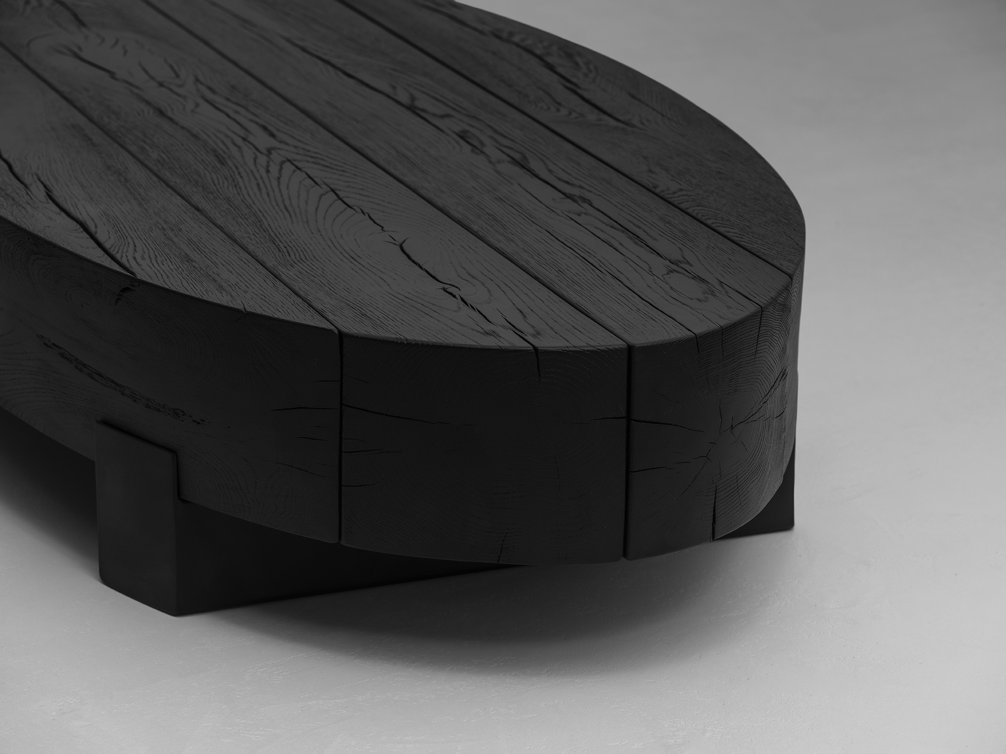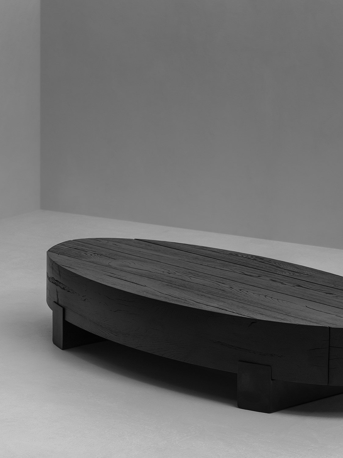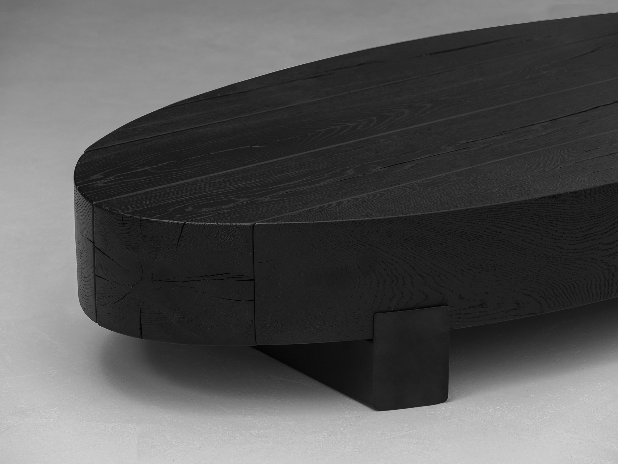 Niski owalny stolik kawowy BEAM z litych belek dębowych na metalowej podstawie. Belki drewniane mają naturalne i rustykalne wykończenie, z bogatym usłojeniem końcowym krawędzi. Solidny stolik szepczący sekrety lasu.