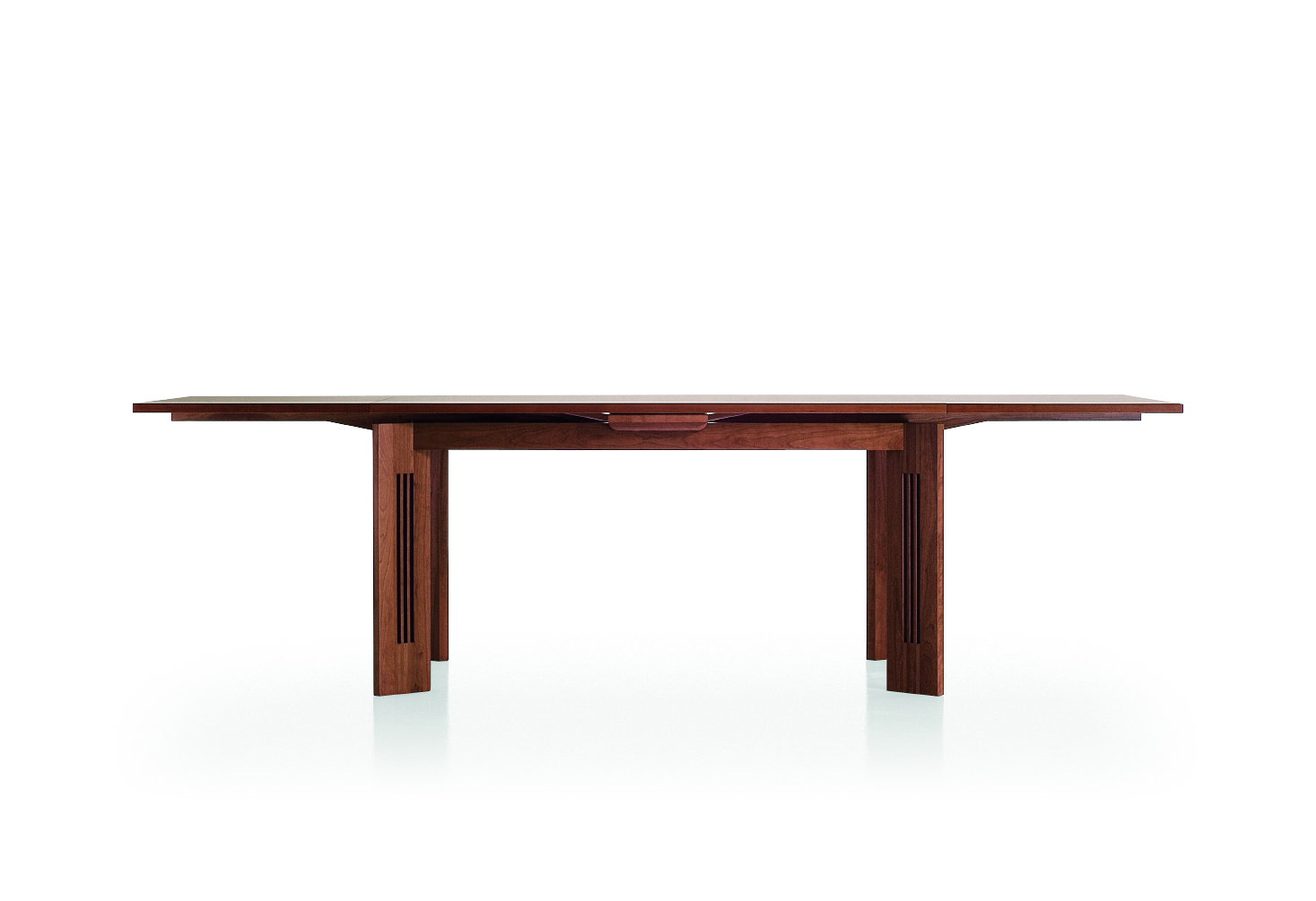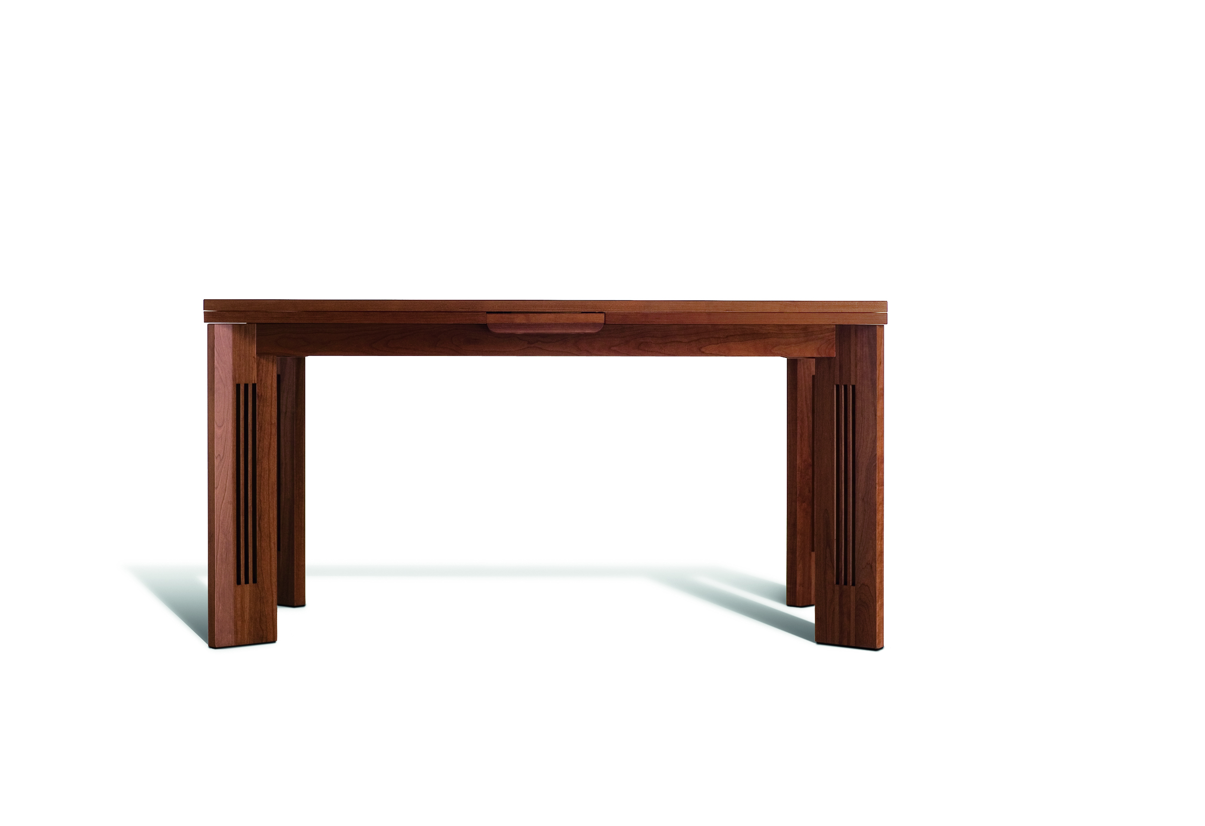 Wyjątkowość tego stołu z naturalnego drewna wiśniowego polega na mechanizmie znajdującym się pod blatem, który umożliwia jego wysuwanie, dzięki małej desce umieszczonej pośrodku najdłuższego boku blatu.
