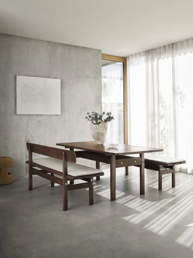 Ukształtowany z litego, olejowanego na ciemno eukaliptusa z certyfikatem FSC™, stół Asserbo BMO698 emanuje prostą surowością, która nawiązuje do stylu Shaker. Zaprojektowany w 1961 roku przez Børge Mogensena, aby spełnić jego własne potrzeby meblowe, jego delikatnie zaokrąglony kształt jest podkreślony szczotkowanymi mosiężnymi śrubami. Mebel o wysokich walorach użytkowych idealnie nadaje się do domów prywatnych i wakacyjnych, ale także do restauracji i przestrzeni publicznych jako miejsce spotkań, posiłków i rozmów.