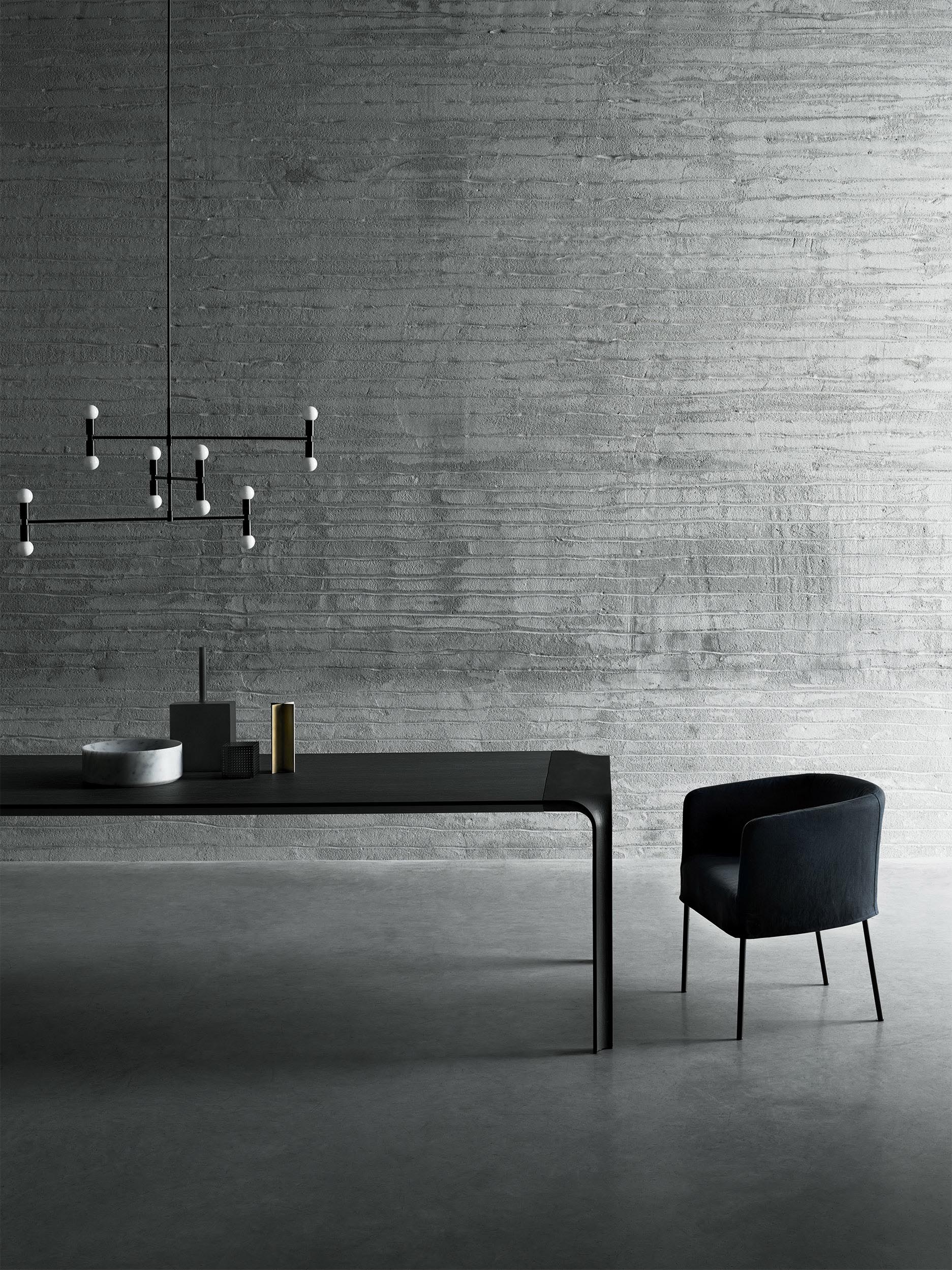 Wykończenie w matowej czerni farbą płynną lub wykończenie „efekt betonu” (kolor jasny/chiaro lub ciemny/scuro) . Blat dostępny również w okleinie Stone Oak® lub dębu barwionego na węgiel drzewny, z nogami w wykończeniu „efektu betonu” kolor ciemny/scuro.