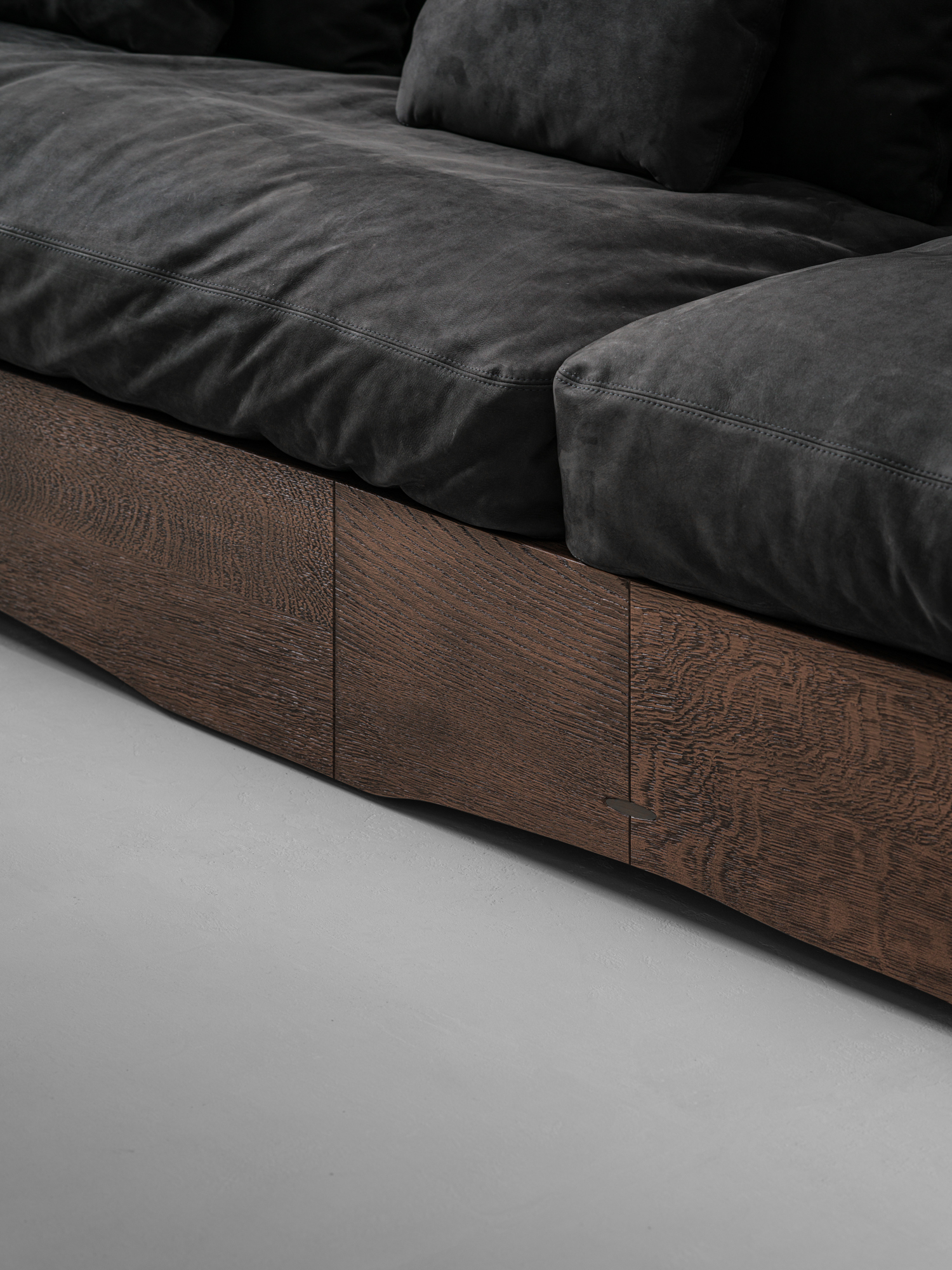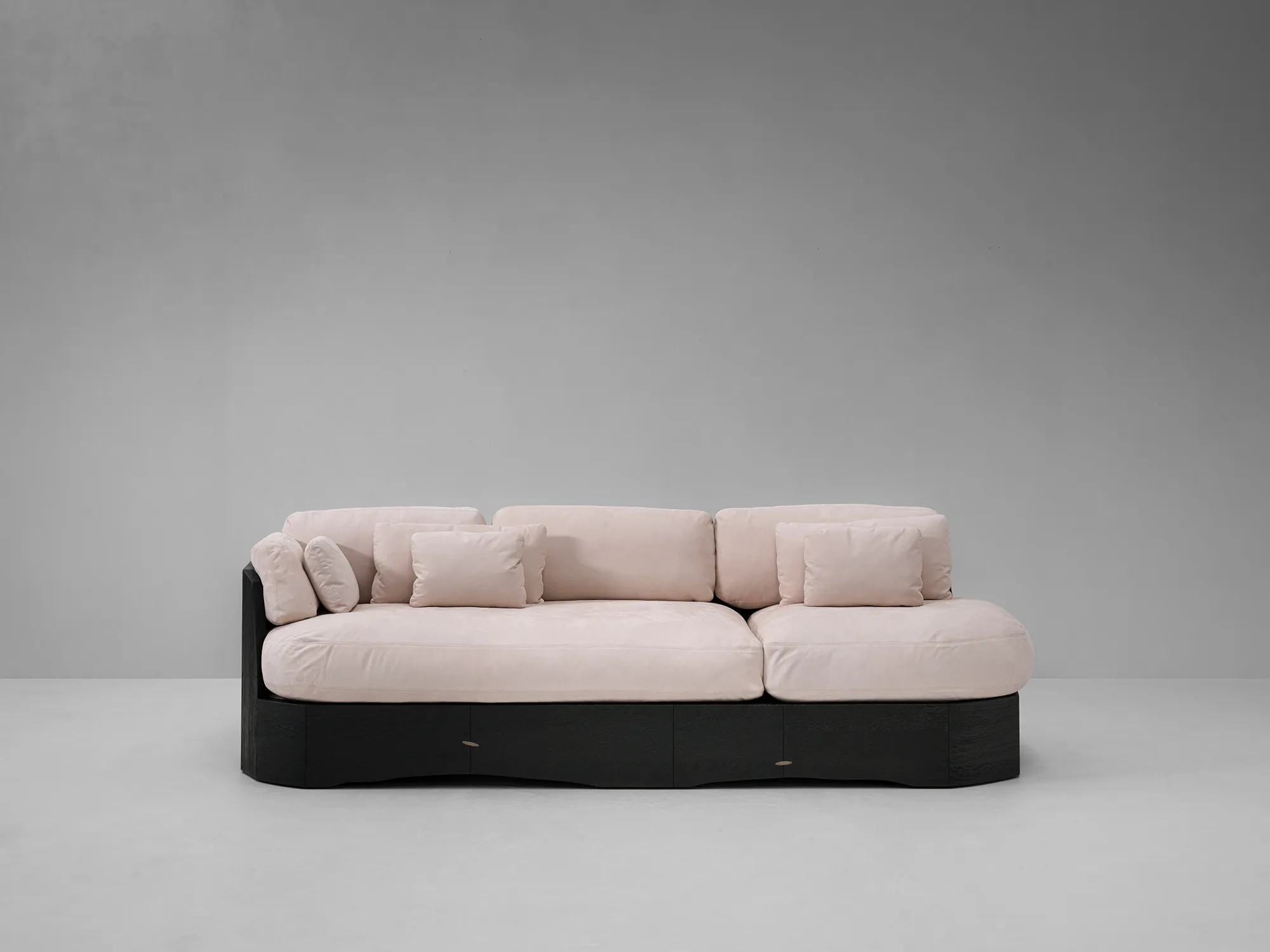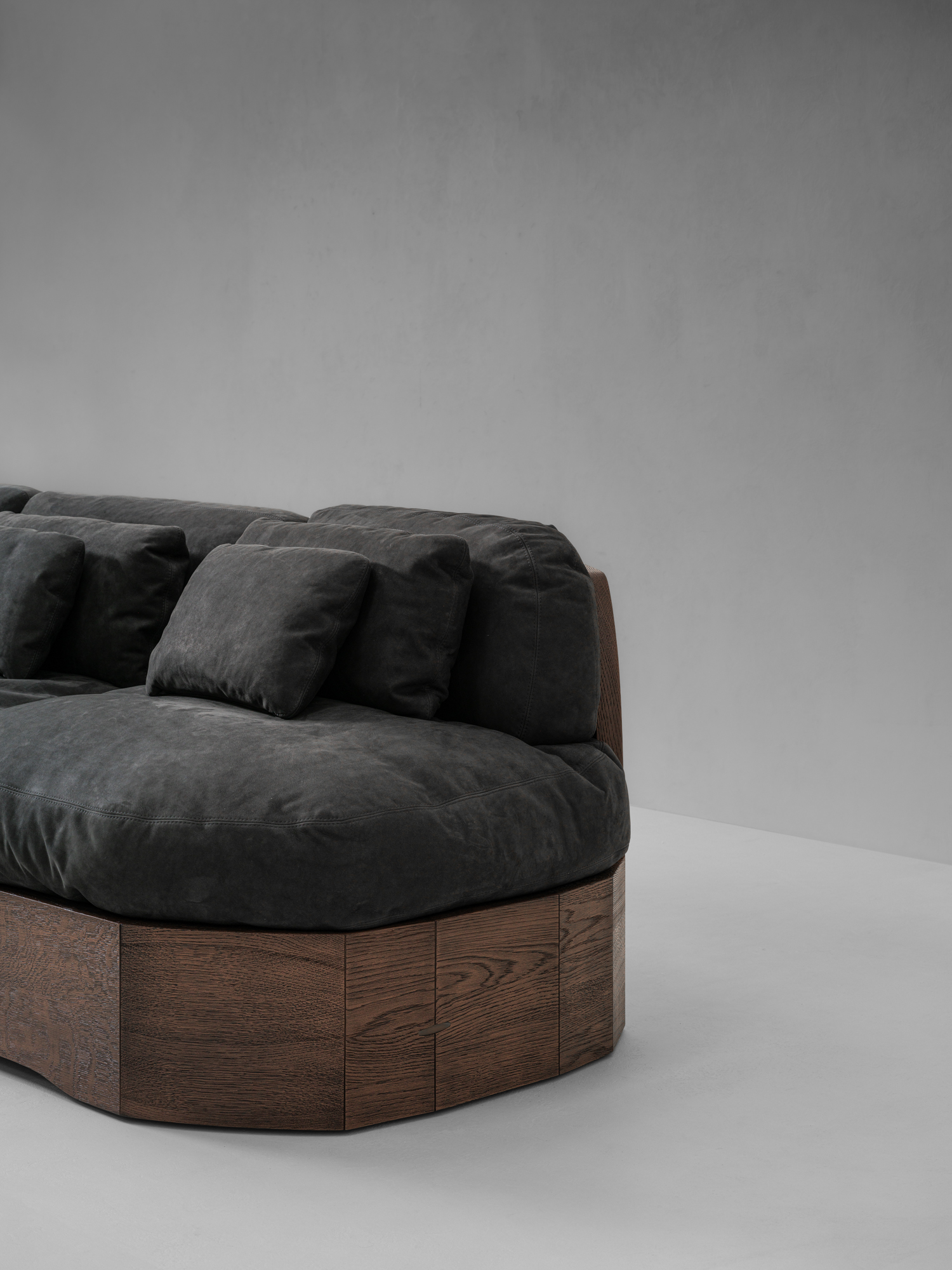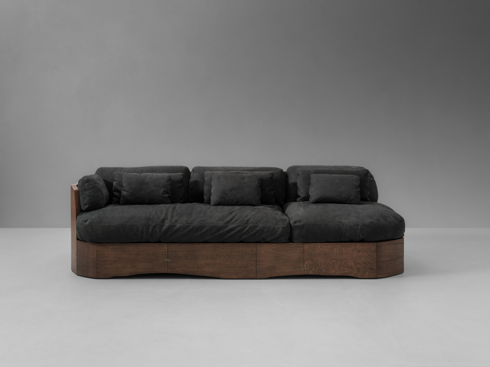 CAIRN Sofa H to przestronna, asymetryczna sofa z solidną drewnianą ramą i pluszową tapicerką, zapewniająca wygodne i wspierające siedzenie. Jej organiczna, nieregularna forma przywołuje płynność natury, gdzie nieregularność wydaje się zarówno niewymuszona, jak i celowa.