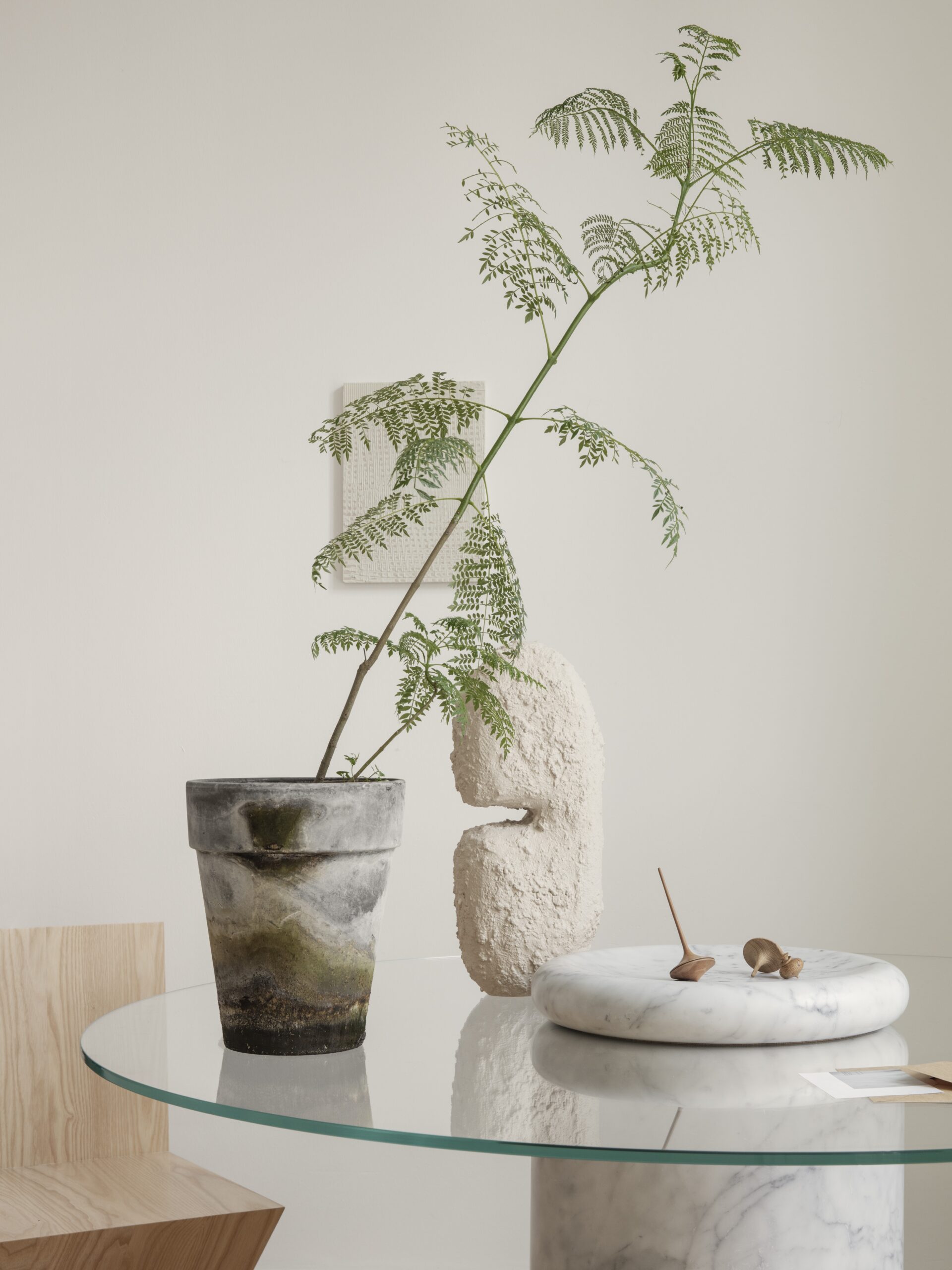 Okrągły szklany blat spoczywa na ciężkiej marmurowej kolumnie, a Mangiarotti chciał, aby wizualnie wyglądało to tak, jakby jedynie mała marmurowa misa na szklanej płycie podtrzymywała go na miejscu. Zaokrąglone rogi zarówno kolumny, jak i misy dodają miękkości i ciężkości marmurowej estetyce. Marmurową misę można zdemontować i używać jako pojedynczego elementu. Jednak zachowując ją jako integralną część projektu, można cieszyć się dodatkowymi zaokrąglonymi narożnikami, ponieważ misa odbija się w szklanym blacie.