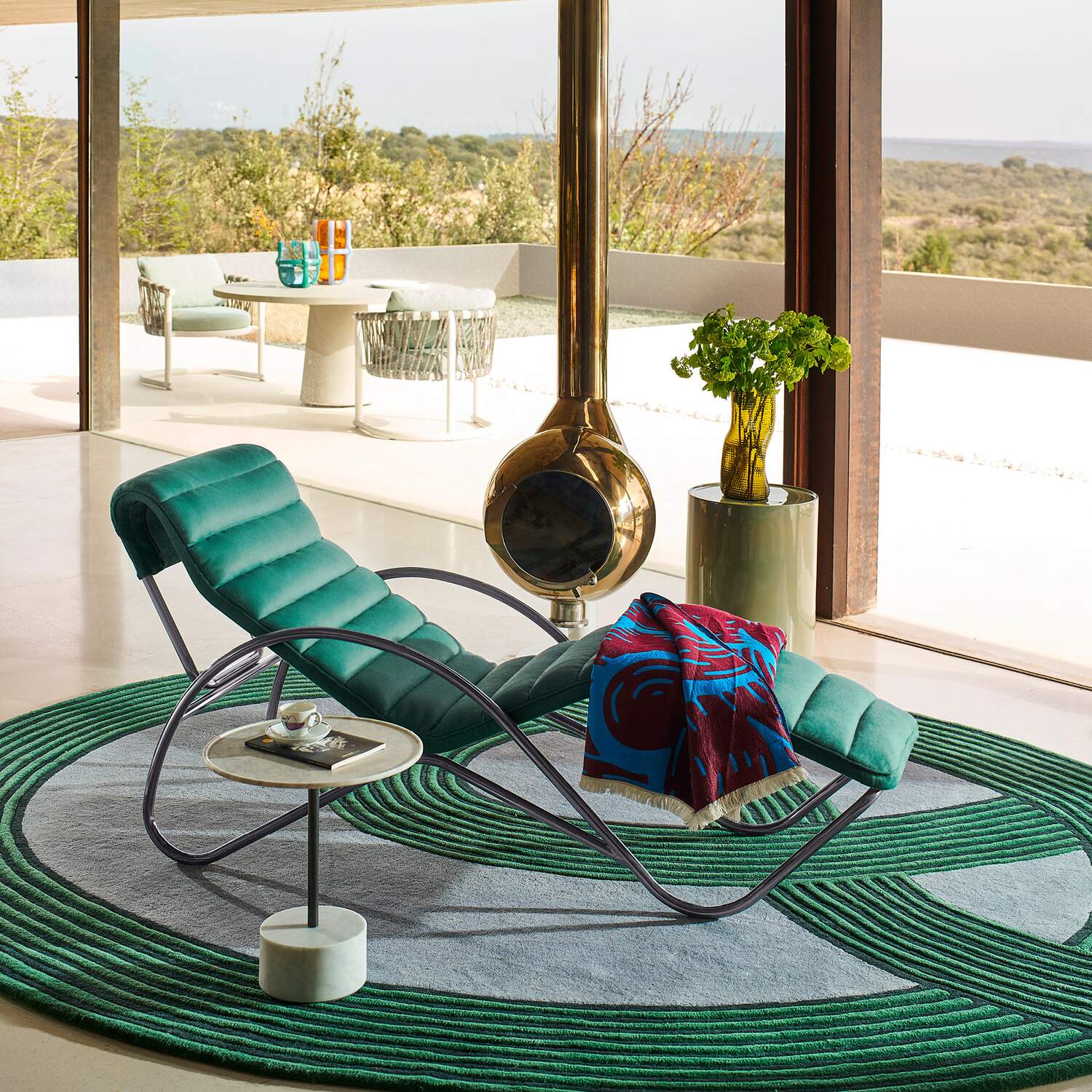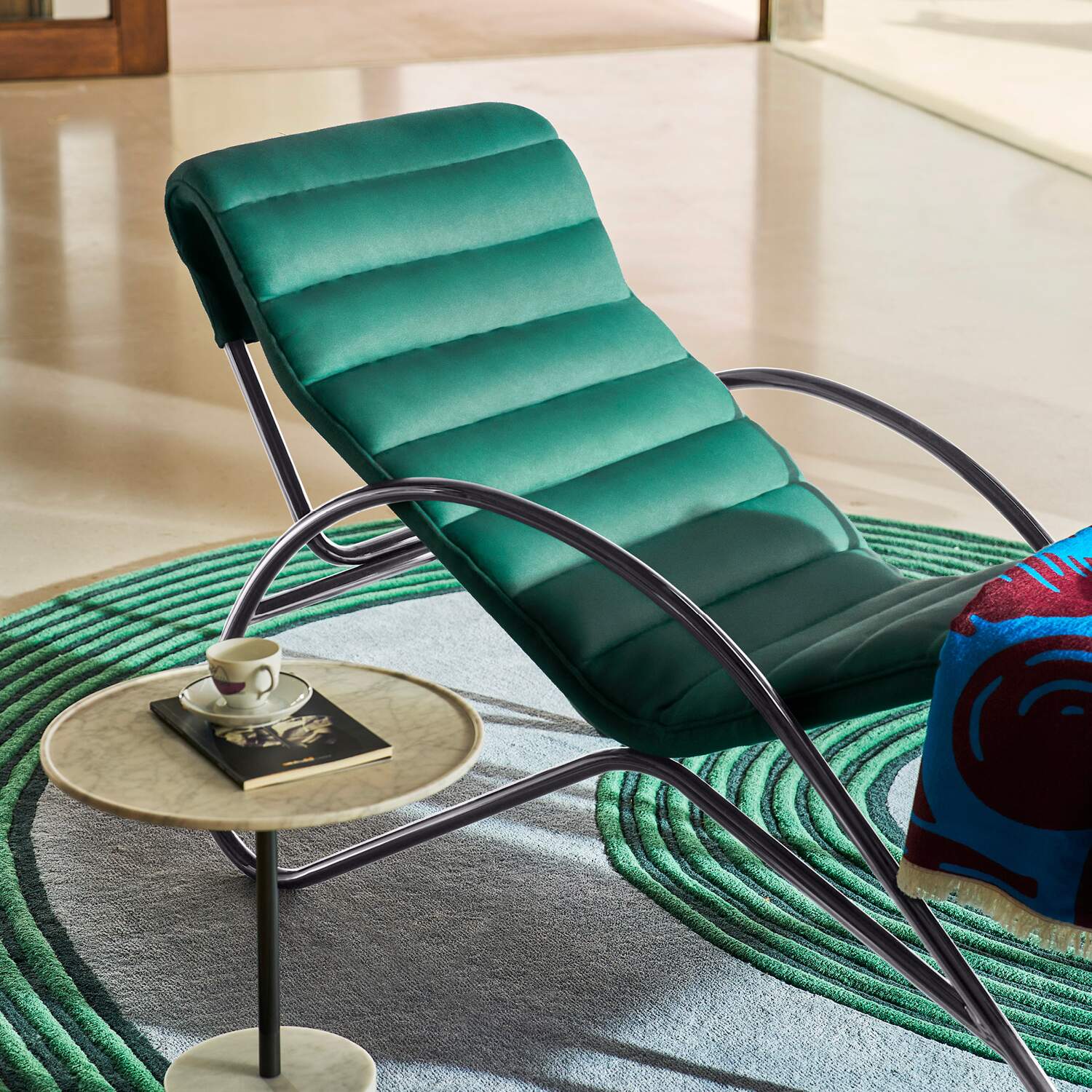 Chaise Longue Indochine to symfonia nowoczesnych linii – wyposażona w podłokietniki, idealna do czytania, pisania i pracy w pełnym relaksie. Charlotte Perriand zaprojektowała Indochine w listopadzie 1943 roku, podczas swojej kadencji jako Dyrektor Rzemiosła w Wietnamie. Przykuta do łóżka pod koniec ciąży, zaprojektowała leżankę z podłokietnikami, które pozwoliły jej kontynuować czytanie, pisanie i projektowanie. Pierwszy egzemplarz był wykonany z rattanu, z powodu braku stali z powodu wojny na Pacyfiku. We współpracy z Pernette Perriand-Barsac, Cassina odzyskuje pierwotny pomysł pionierki i produkuje Indochine z malowanego metalu rurowego. Trzy zakrzywione segmenty połączone łącznikami przecinają się, tworząc aerodynamiczną sylwetkę mebla, w którym podłokietniki stanowią naturalną kontynuację podstawy. Kołyska leżanki jest wyposażona w elastyczną taśmę, która zapewnia wsparcie siedziska, optymalizując jego komfort. Nakładka z zdejmowaną tapicerką otula konstrukcję. Jej miękka wyściółka wykonana jest z włókien PET pochodzących z recyklingu, ozdobiona pikowanym motywem, przeszytym od krawędzi do krawędzi.