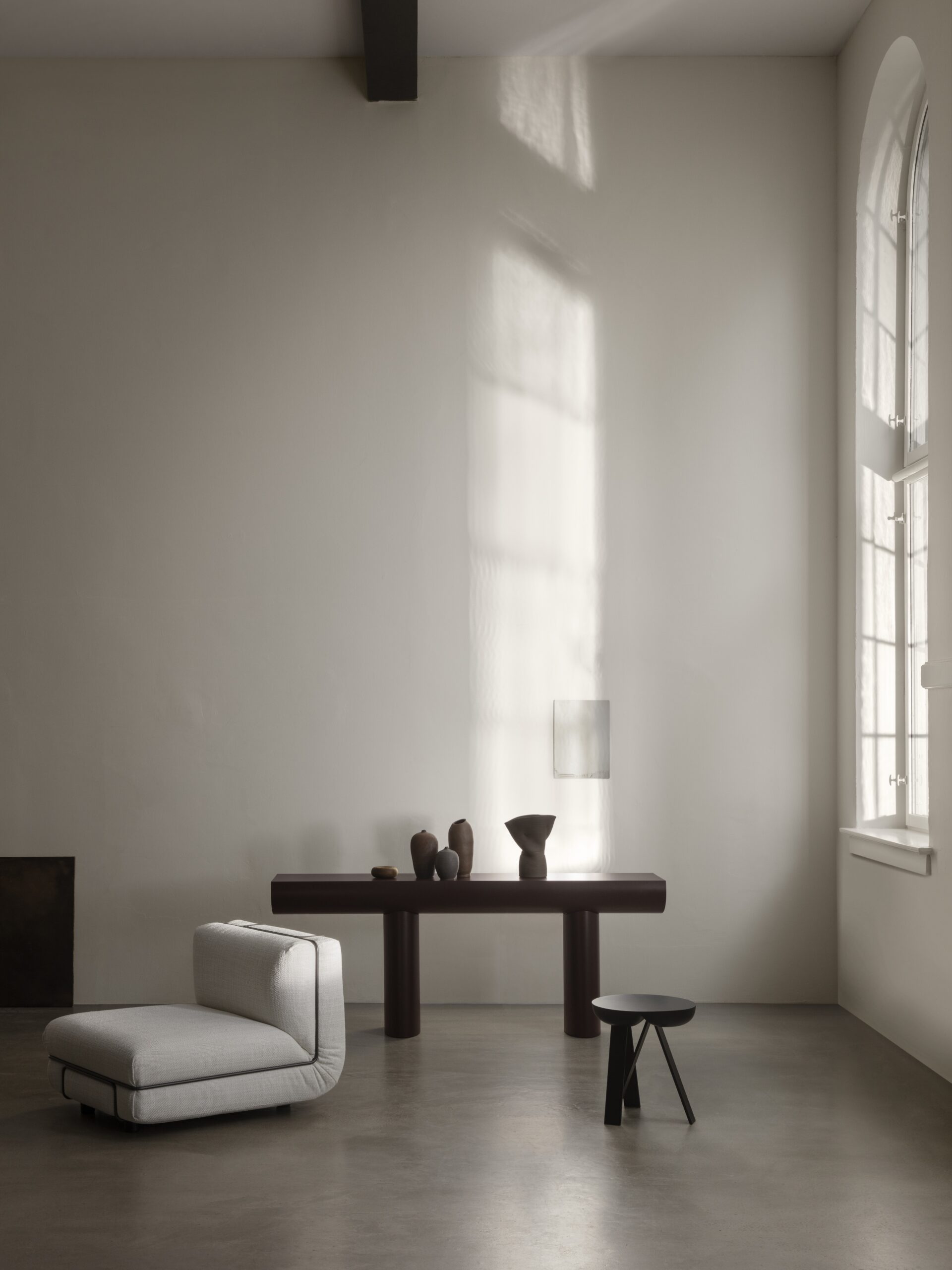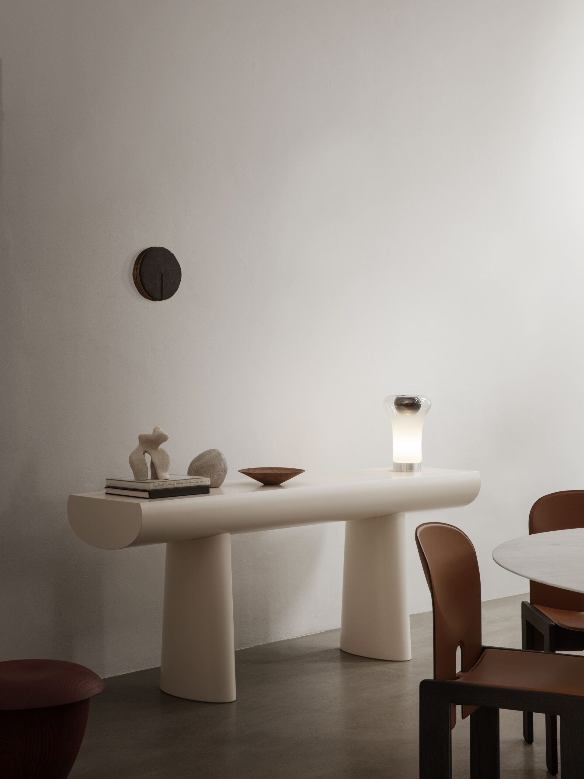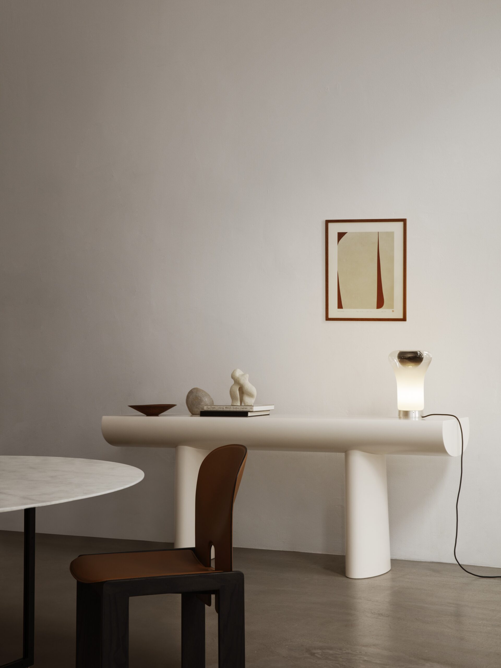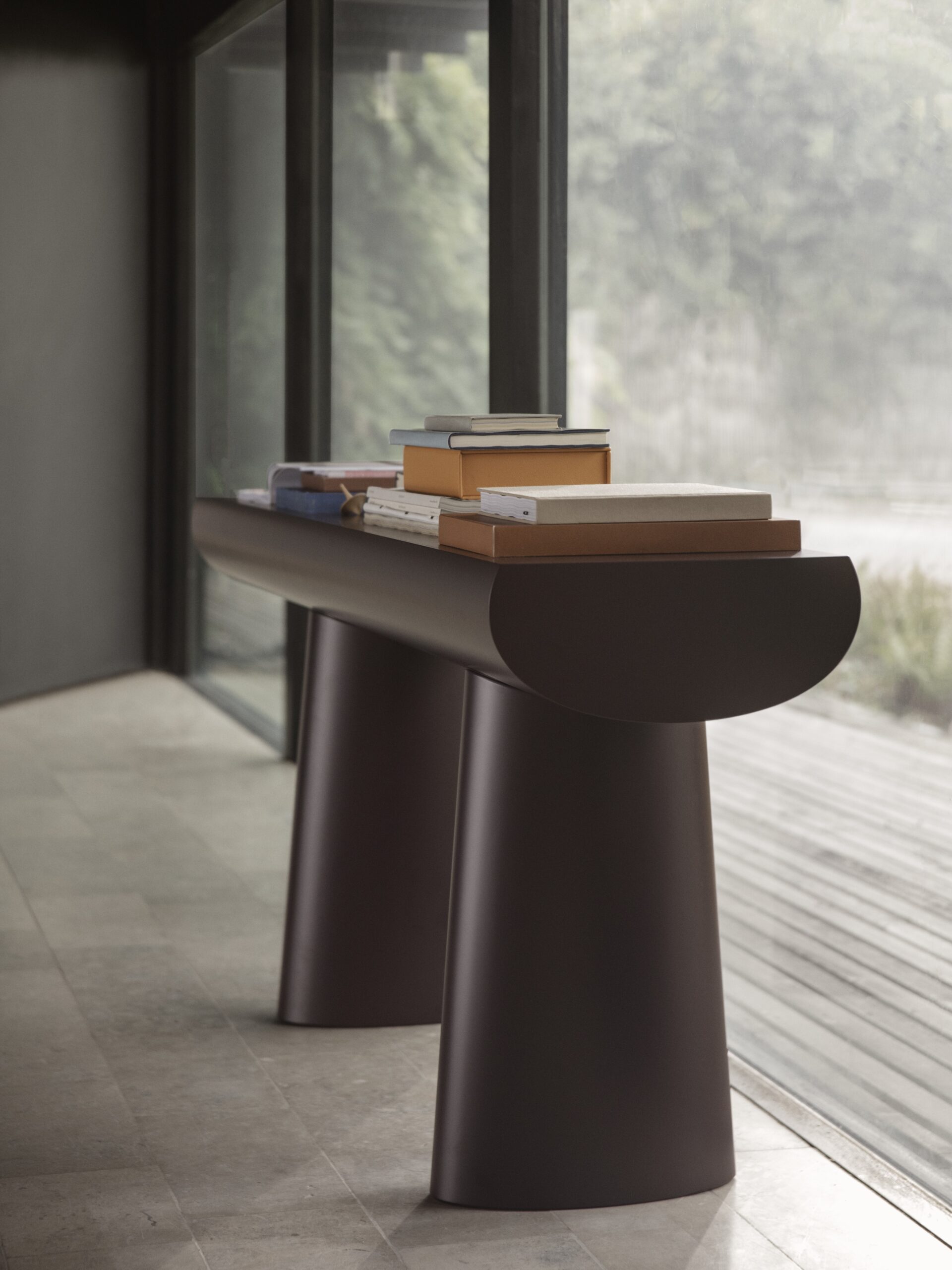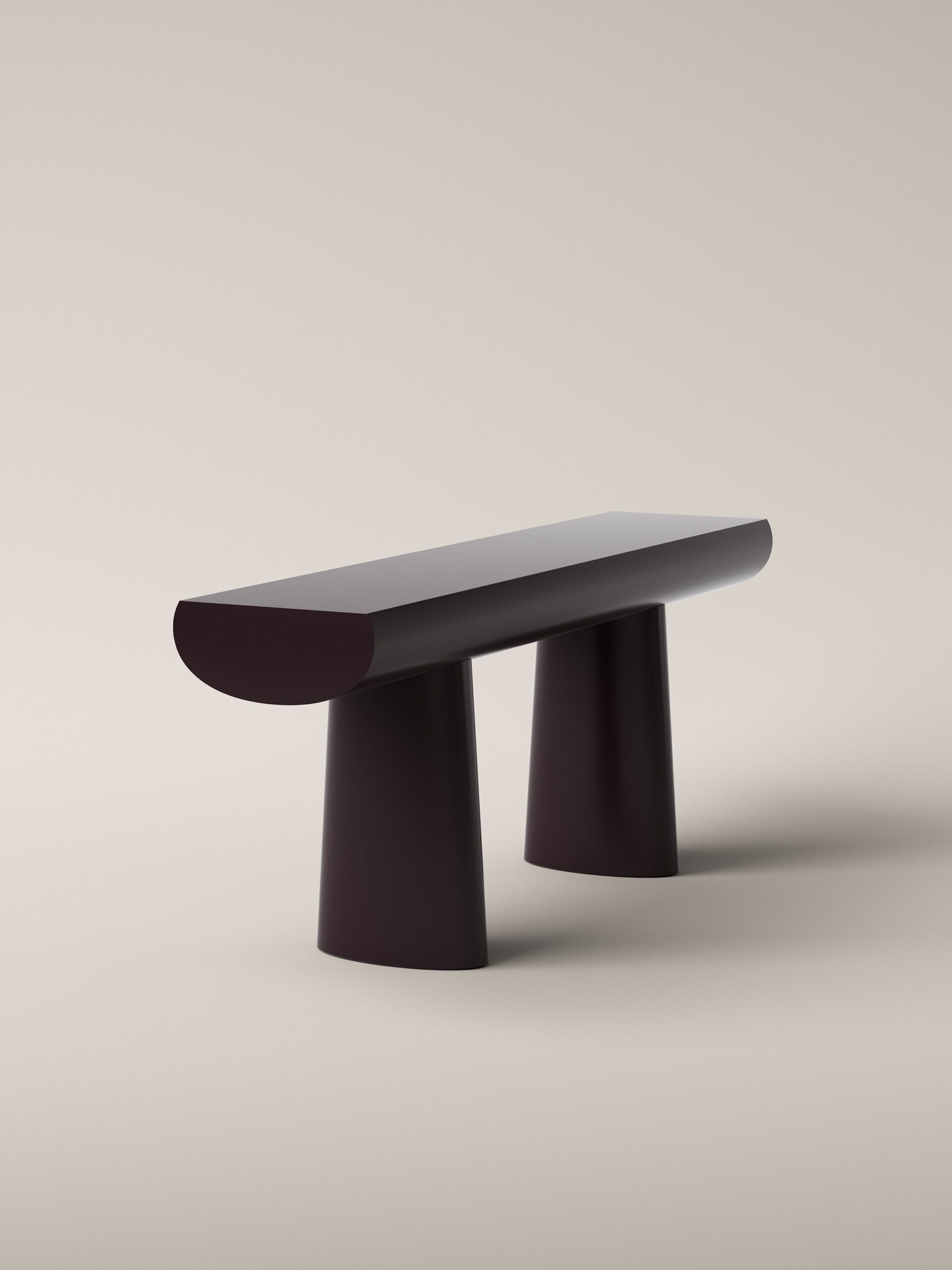Spokojna i uwodzicielska, konsola Aldo Bakkera w znakomity sposób unosi się między rzeźbą a meblem. Przedstawia najprostszą koncepcję konsoli: dwie kolumny i blat. Nogi stanowią przedłużenie linii utworzonej przez blat. Blat i podstawa nóg mają tę samą szerokość, co czyni je równie ważnymi dla projektu. Odległość między nóg nie jest stała, ale można ją zmieniać według uznania, co dodaje rzeźbiarskiego charakteru temu dziełu.