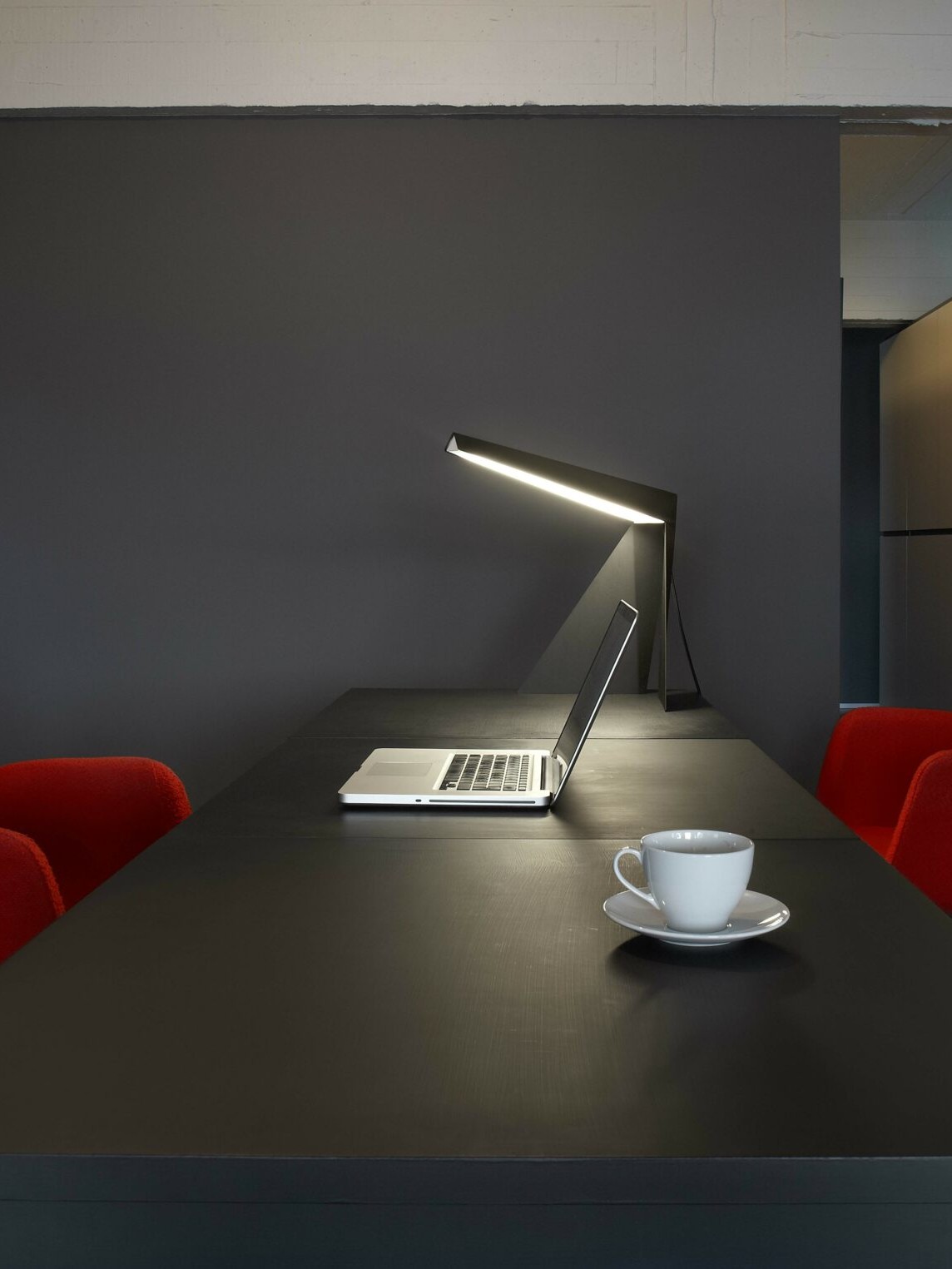 Stopa została złożona pod kątem prostym, aby zminimalizować utratę przestrzeni roboczej. Dlatego Crane doskonale nadaje się do umieszczenia na rogu biurka.