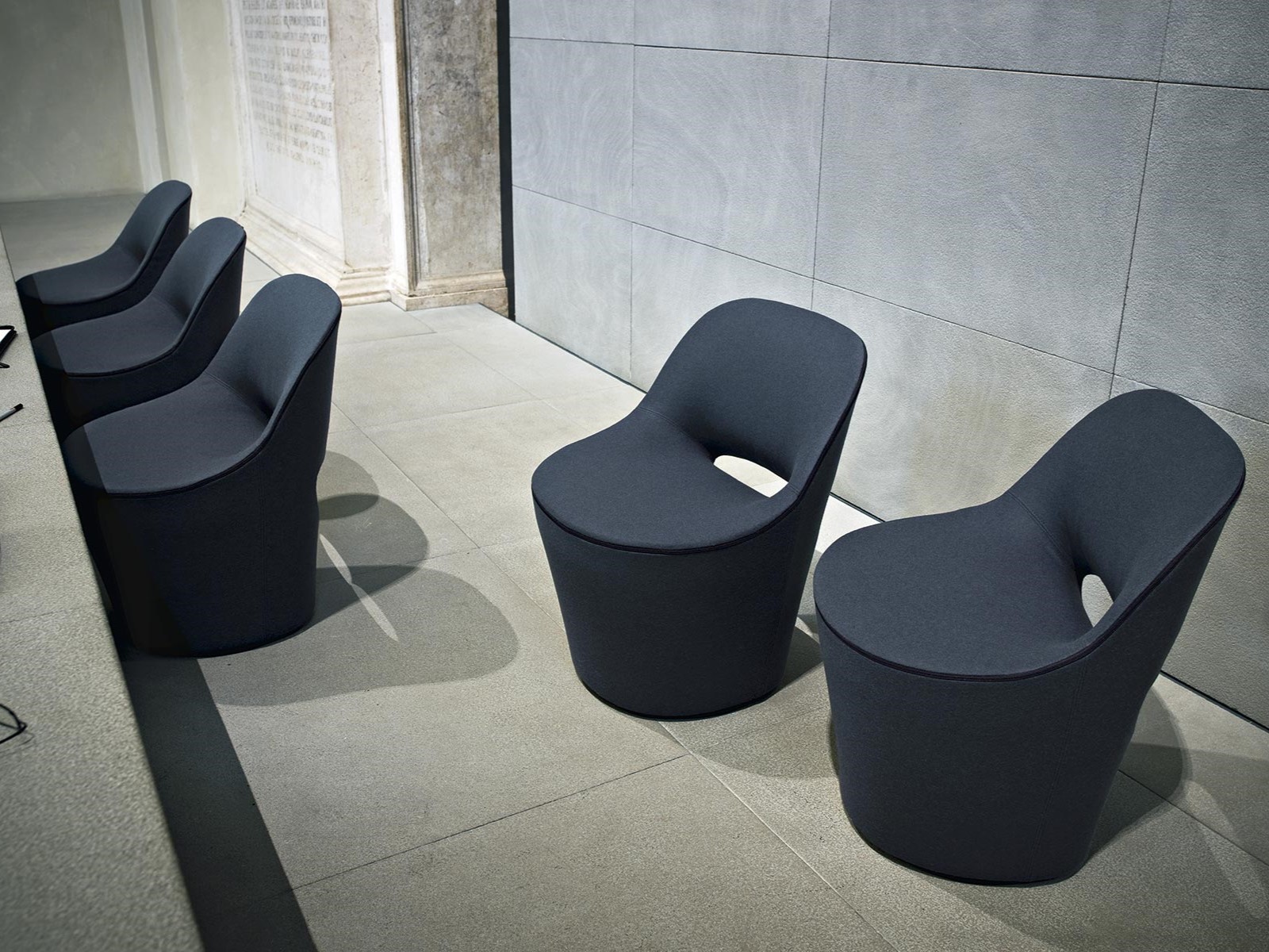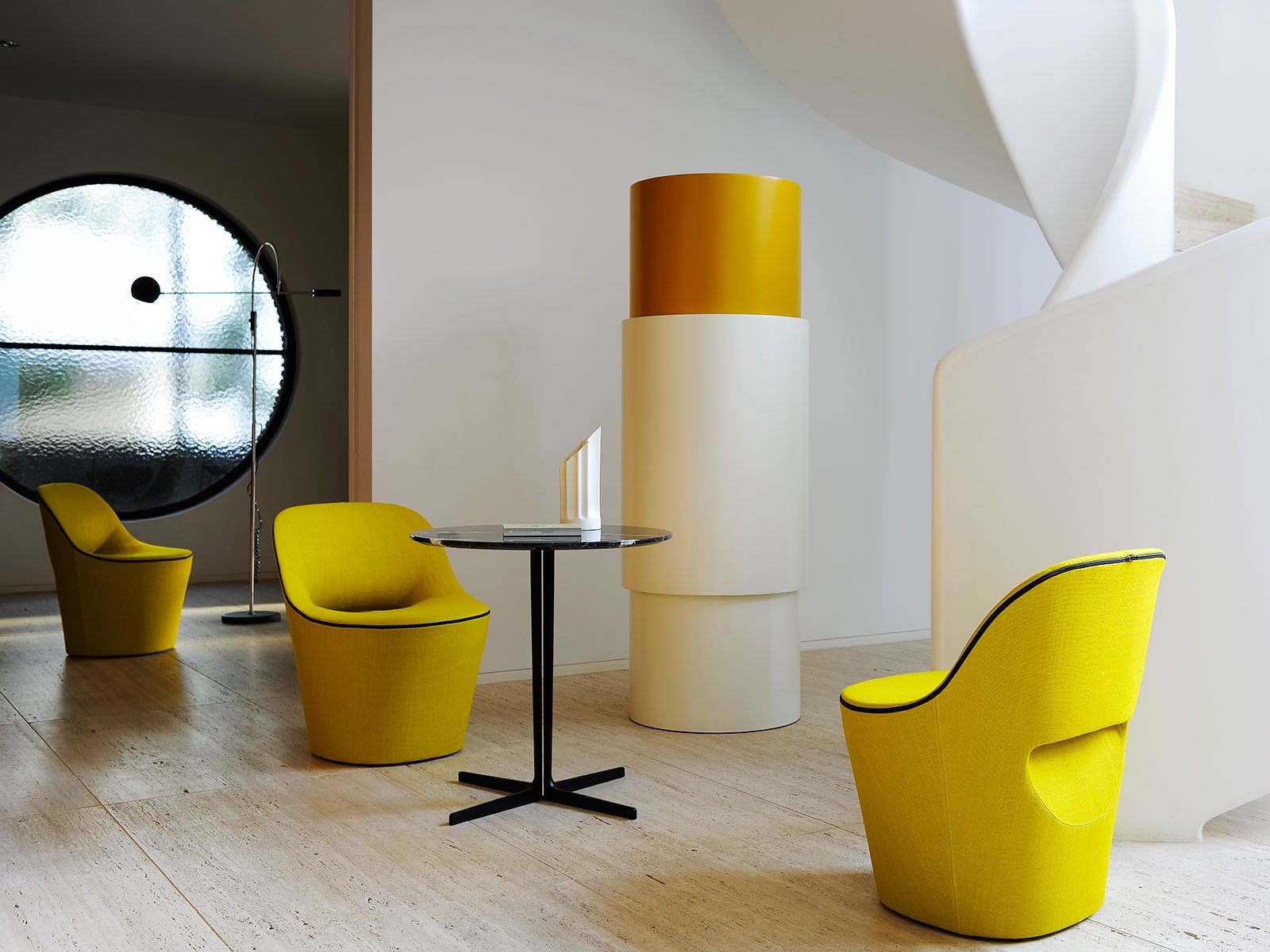 Zaprojektowany przez brytyjskie studio PearsonLloyd, Eddy wyróżnia się wyrazistymi liniami. Jego zaokrąglony kształt przerywa jedynie charakterystyczne wycięcie między oparciem a siedziskiem, które stanowi centralny punkt w niezakłóconej estetyce modelu, a jednocześnie zapewnia funkcjonalny uchwyt do przesuwania fotela. Dostępny w dwóch wersjach: z nogami lub obrotową, okrągłą podstawą, oferuje szeroką paletę kolorów, pozwalającą na eksperymentowanie z kontrastującymi profilami lub zestawieniami ton w ton.