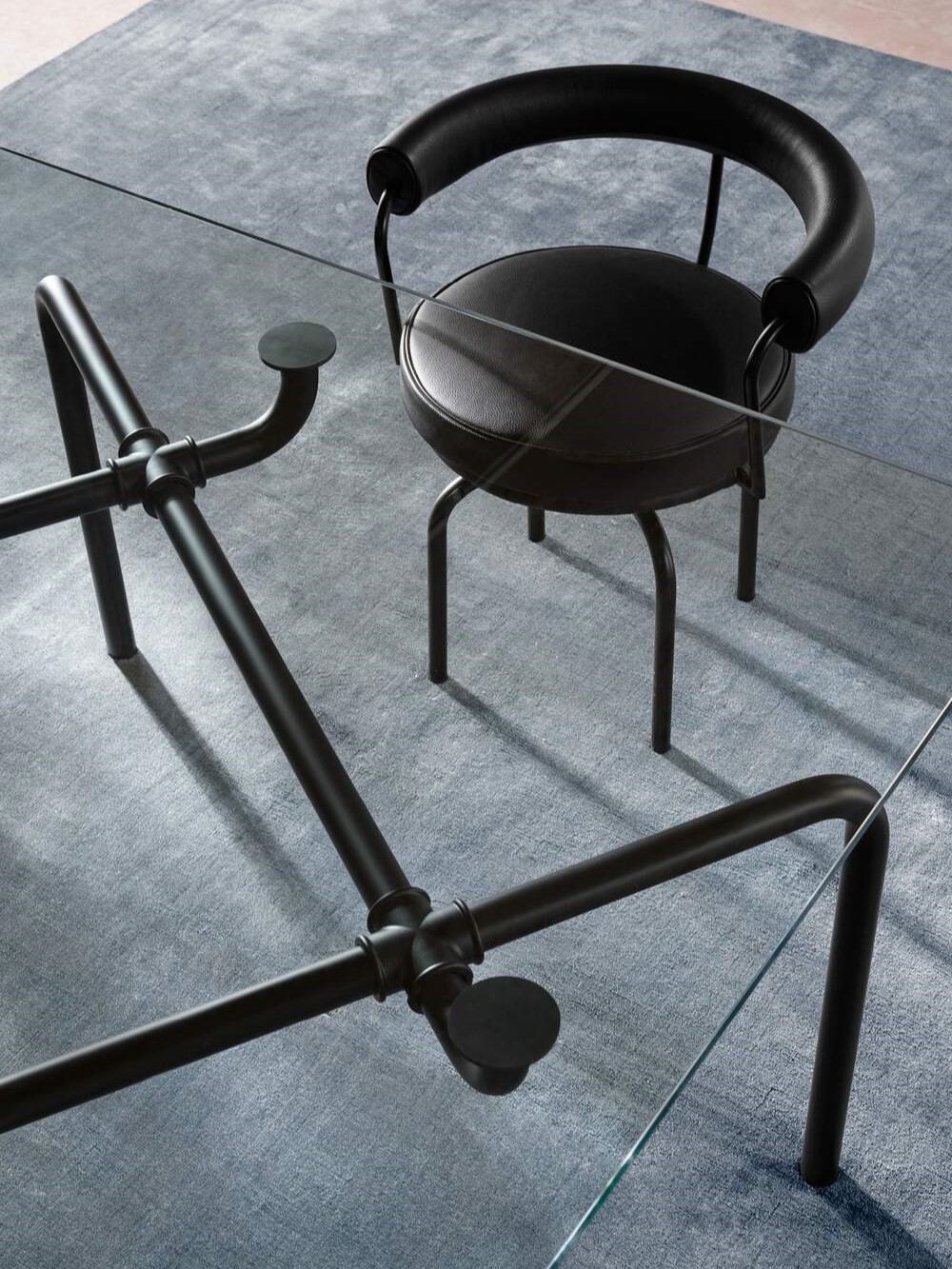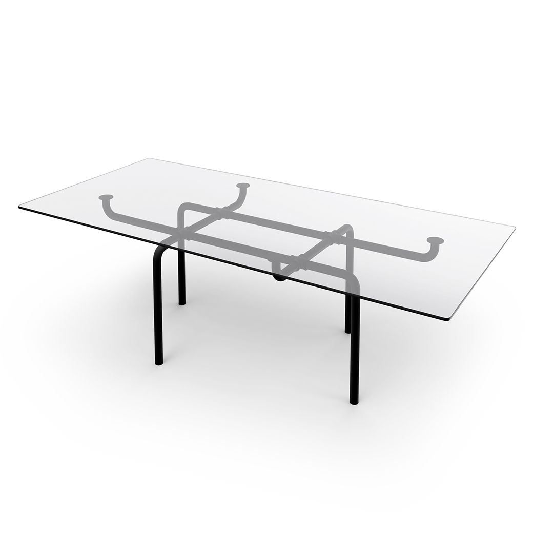 Edison to stół z blatem z hartowanego szkła float i malowaną stalową konstrukcją, zaprojektowany przez Vico Magistretti dla Cassina.