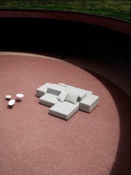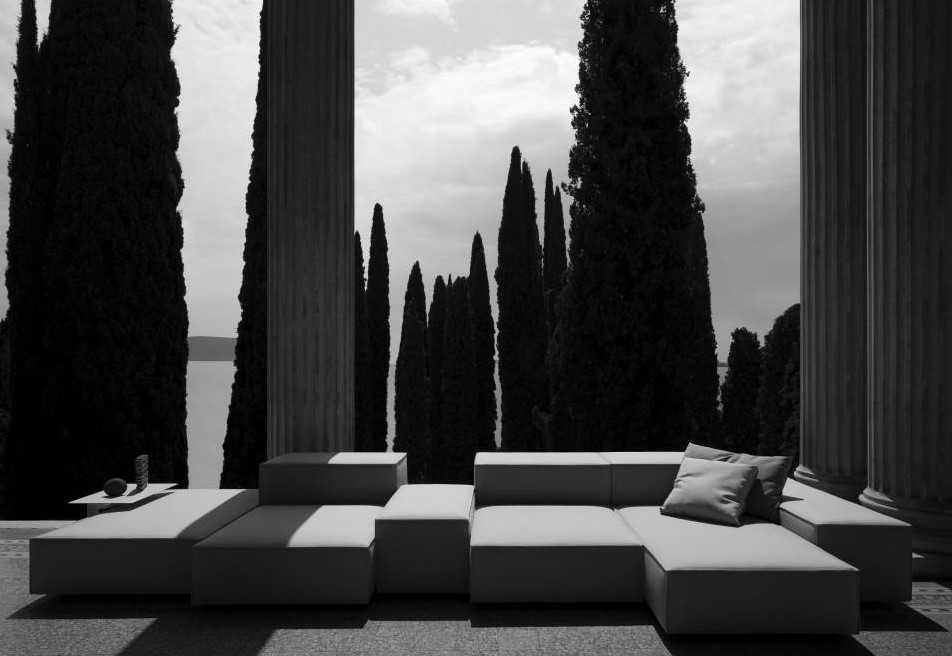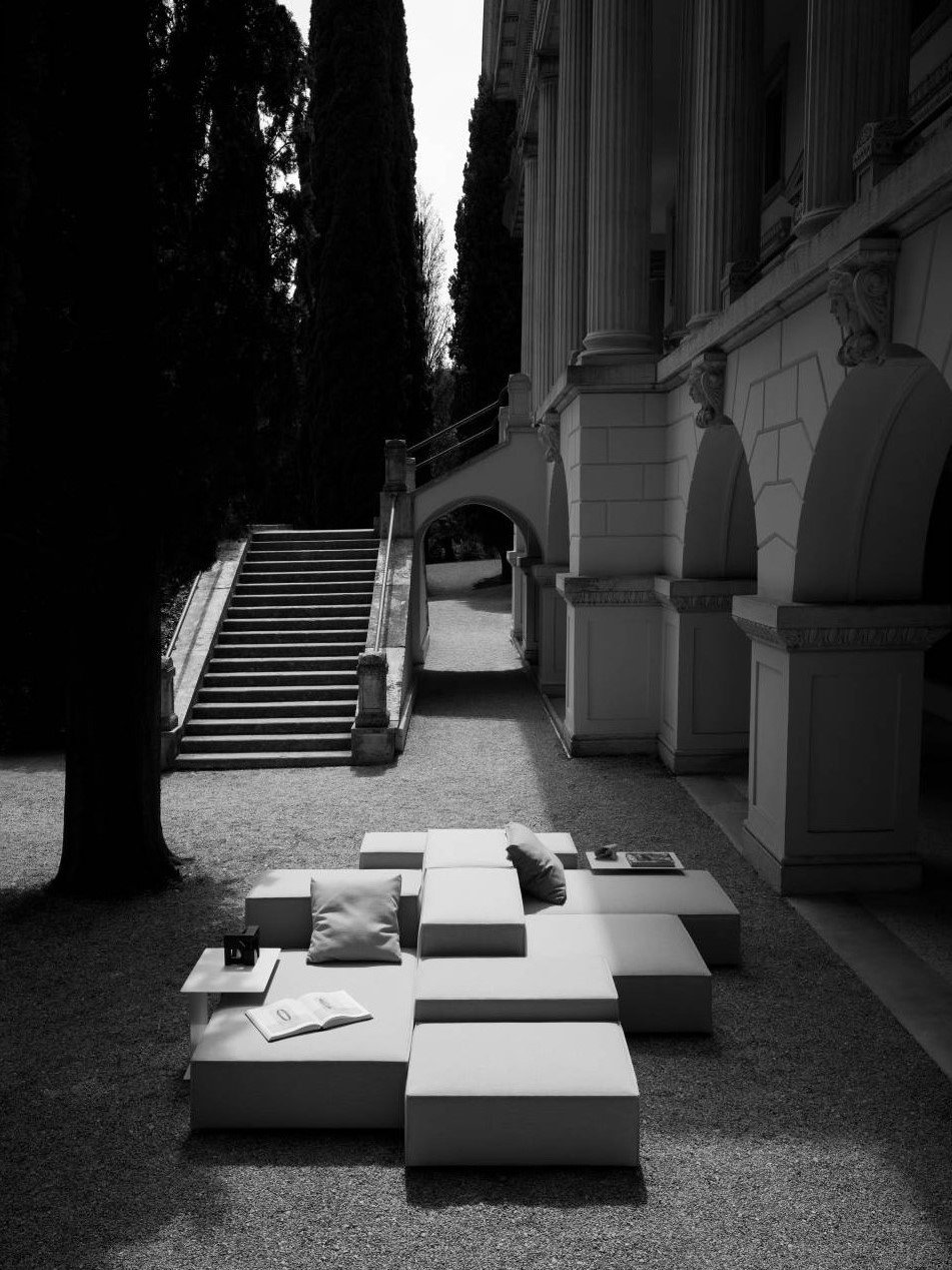 Modułowość i nieskończone kompozycje sofy Extrasoft pozwalają na wkomponowanie jej z klasą również w obszary zielone.