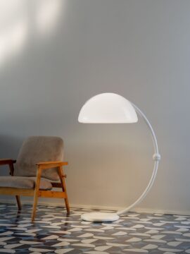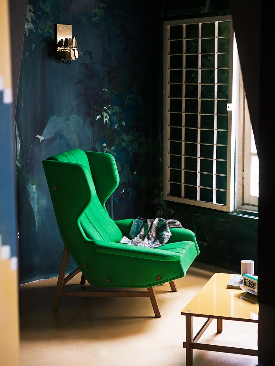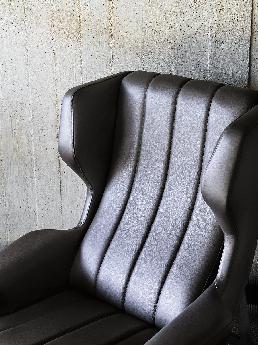 Giulia to reedycja słynnego modelu 877 autorstwa Gianfranco Frattiniego, dedykowanego żonie jego wielkiego mistrza, Gio Pontiego. Miękkość, która wyróżnia fotel typu bergère – szeroki i głęboki, z wysokim oparciem i bocznymi zagłówkami – przekłada się na ostre, geometryczne linie, które definiują bryłę z podłokietnikami w kształcie skrzydeł, spoczywającą na drewnianej ramie. Elementy konstrukcyjne stają się w ten sposób częścią estetyki mebla, co widać w detalach odsłoniętych drewnianych śrub.