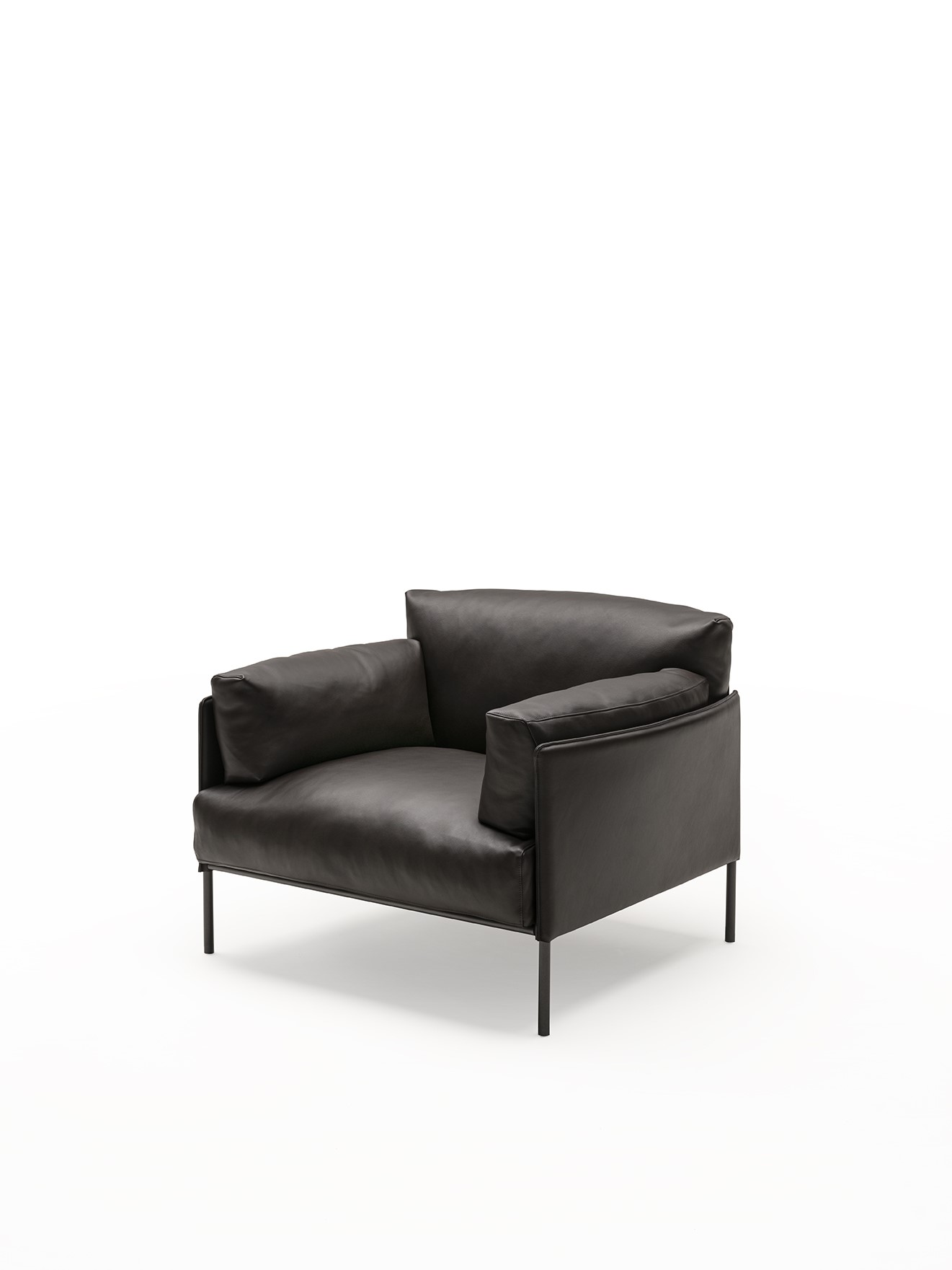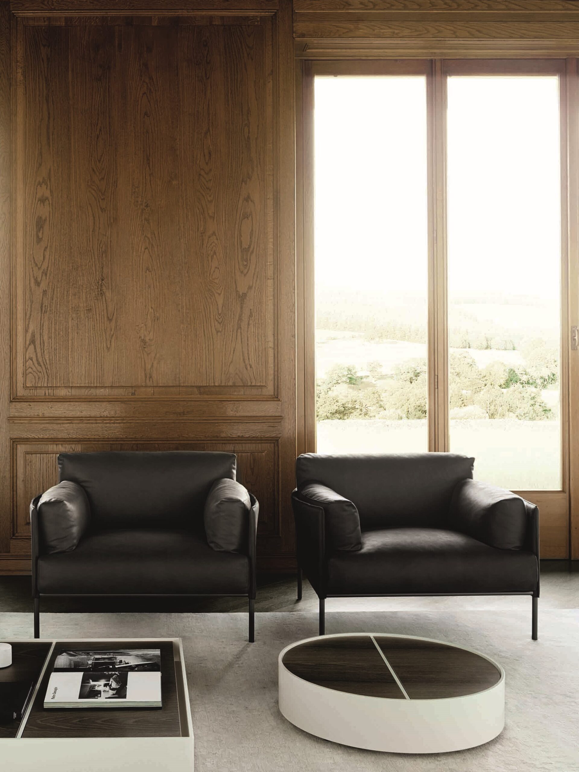 Fotel charakteryzujący się delikatnymi krzywiznami, które tworzą zrelaksowaną i swobodną kompozycję: strukturalna, ale miękka rama wypełniona obszernymi poduszkami, stojący na smukłych nogach, ponownie zwracający uwagę na każdy najmniejszy szczegół.
