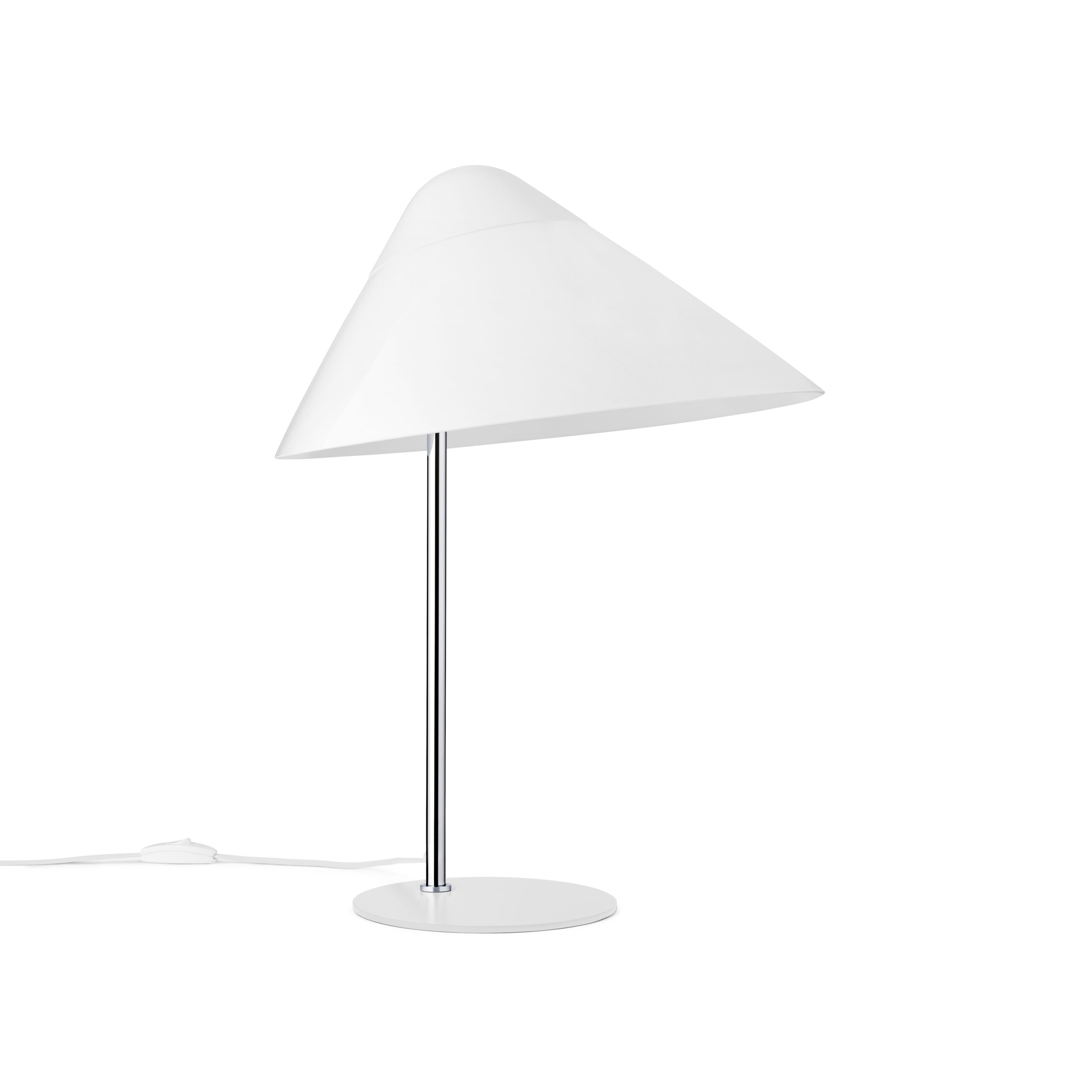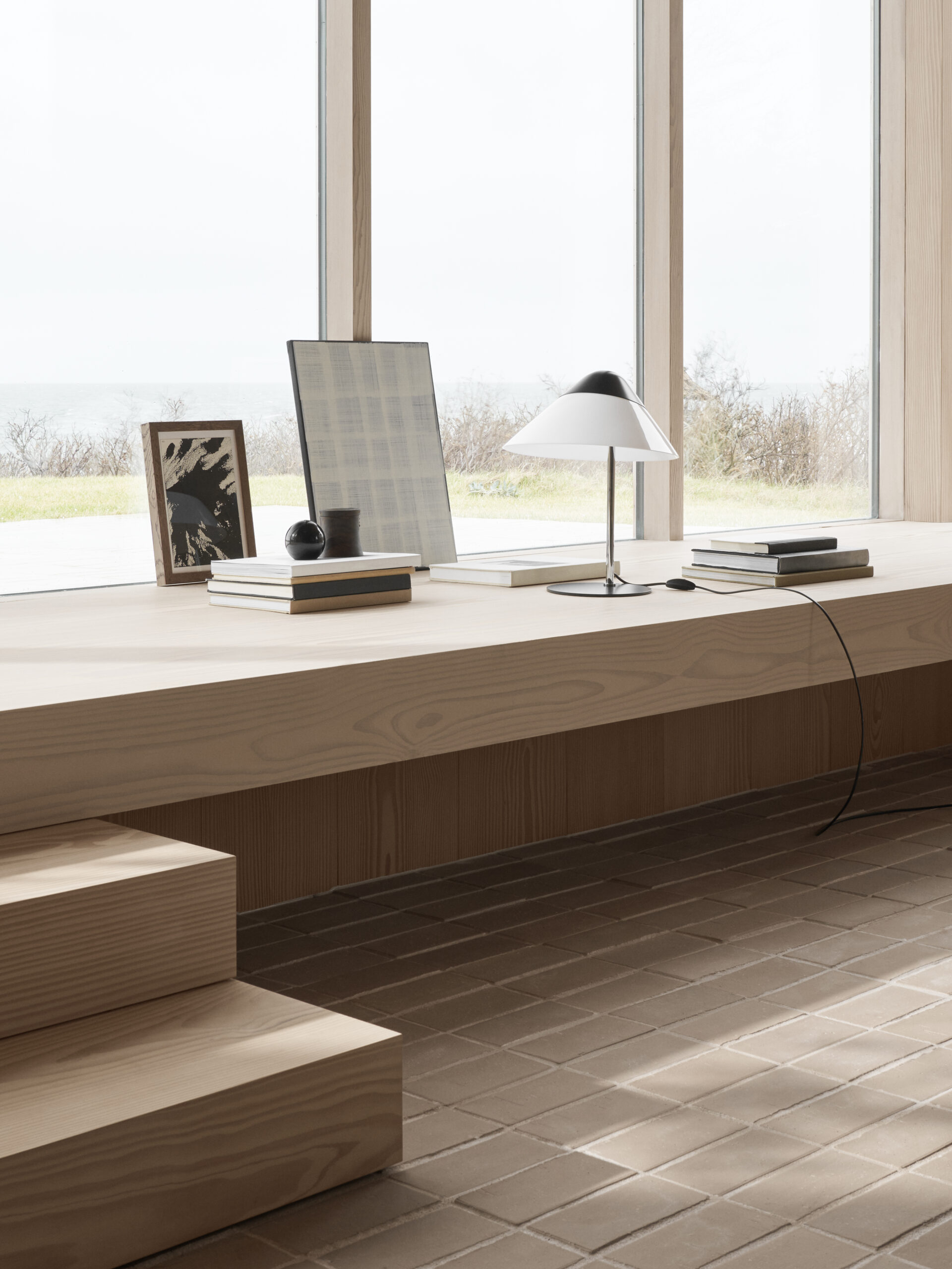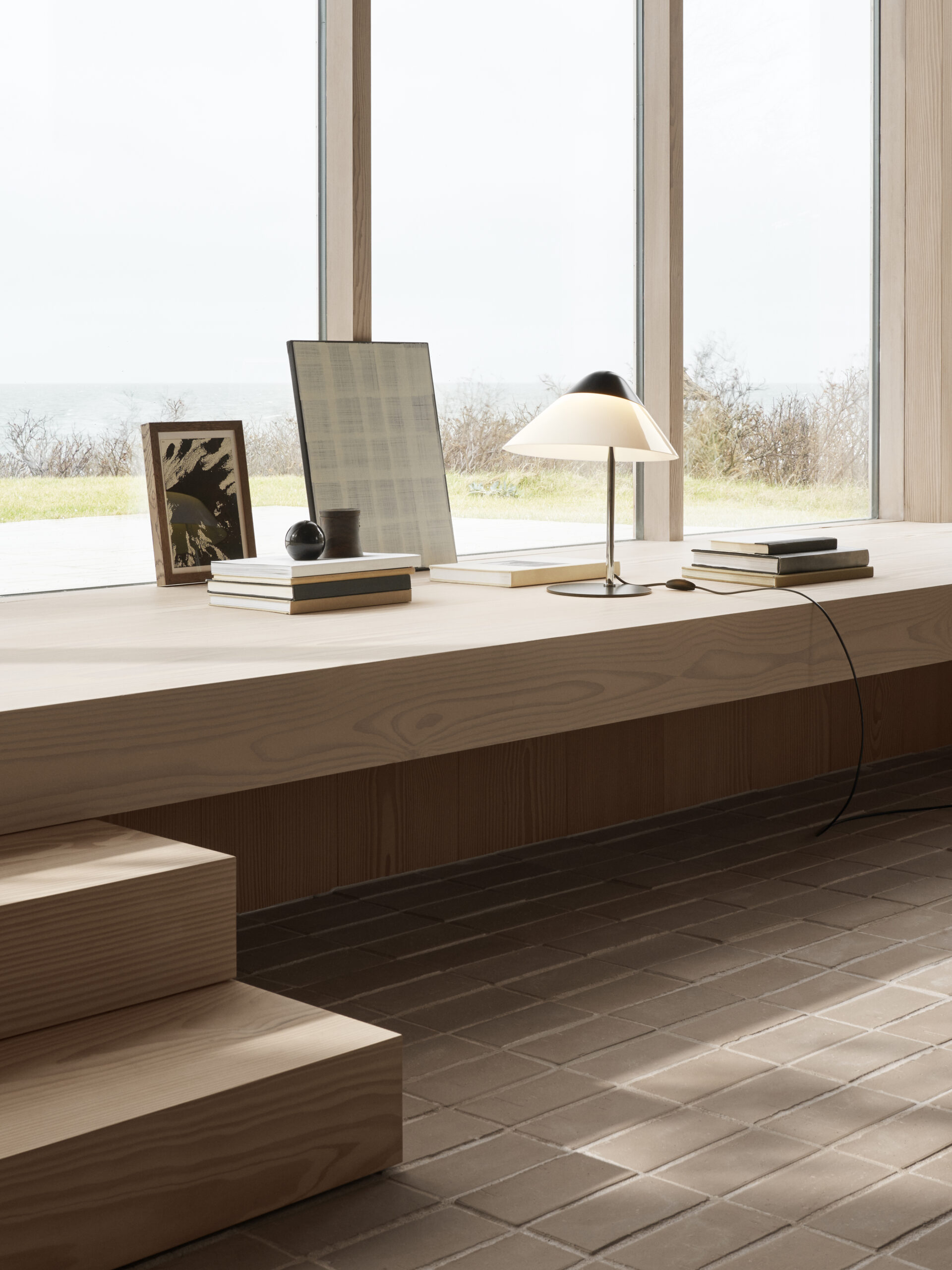 Lampa stołowa HJW02 Opala Midi została zaprojektowana przez Hansa J. Wegnera w 1973 roku jako część większej serii oświetlenia stworzonej dla hotelu Scandinavia w Kopenhadze. Seria ta wyróżnia się charakterystycznym, niemal futurystycznym wyrazem, z lekko nachylonymi kloszami i prostymi liniami.