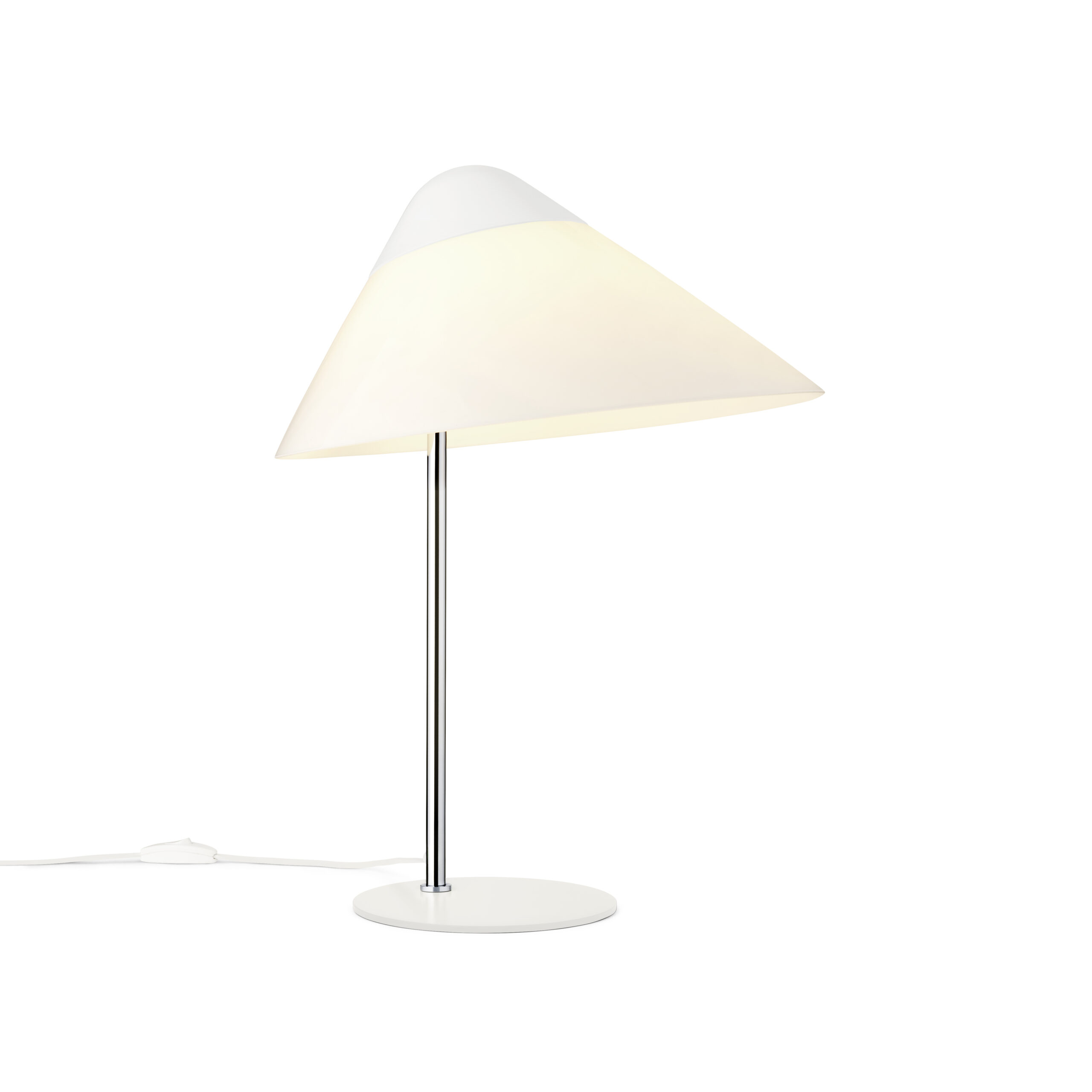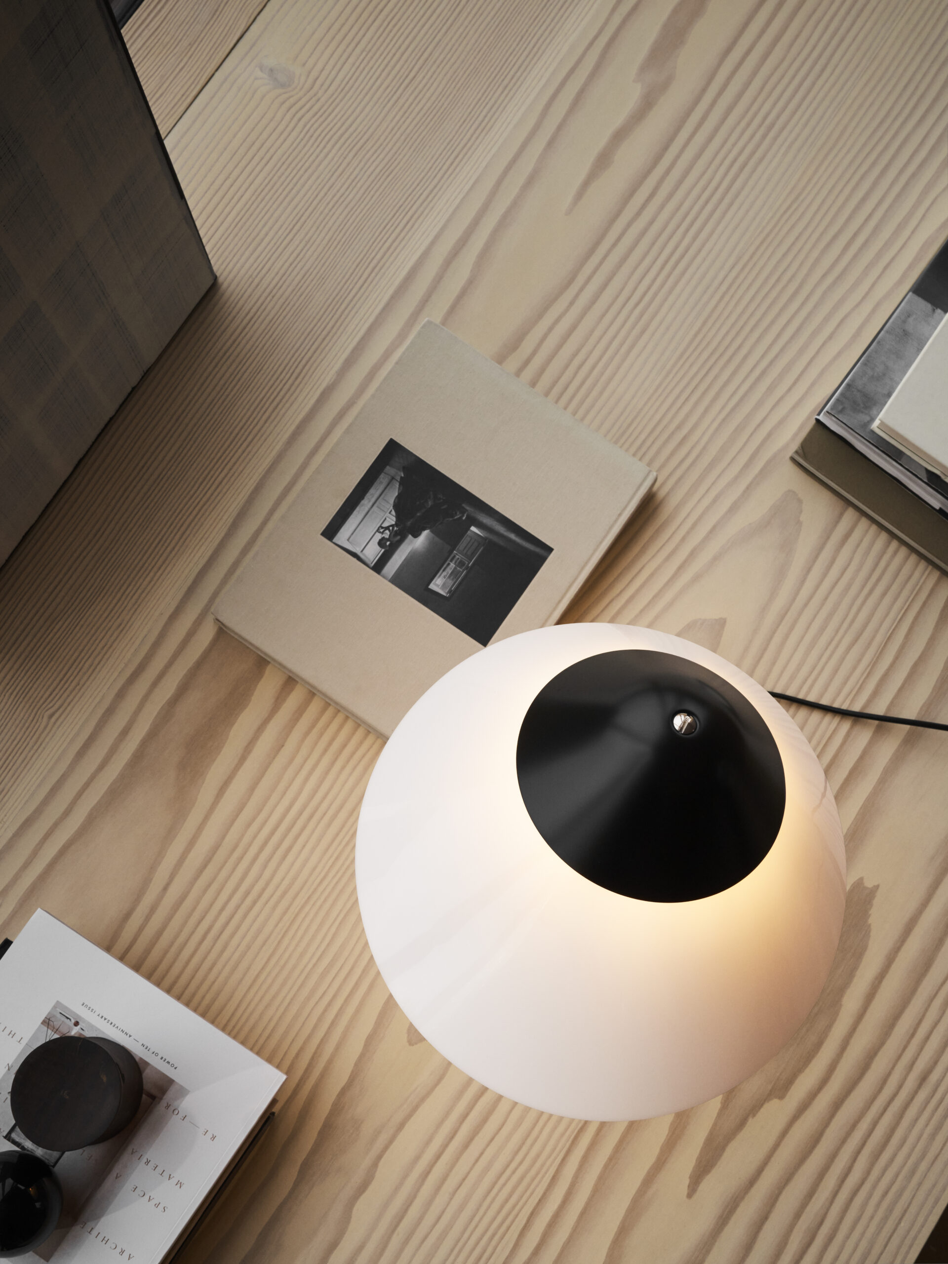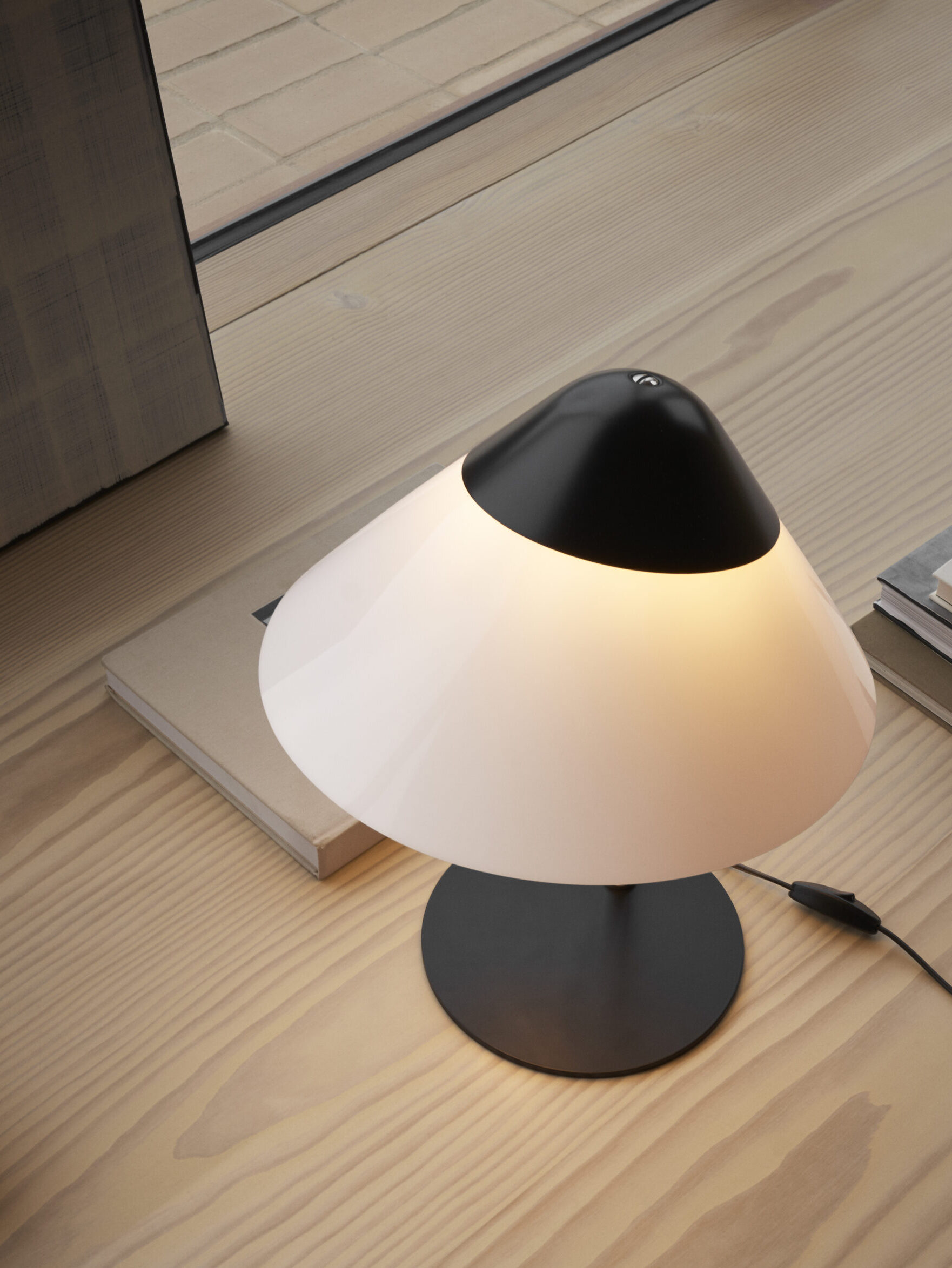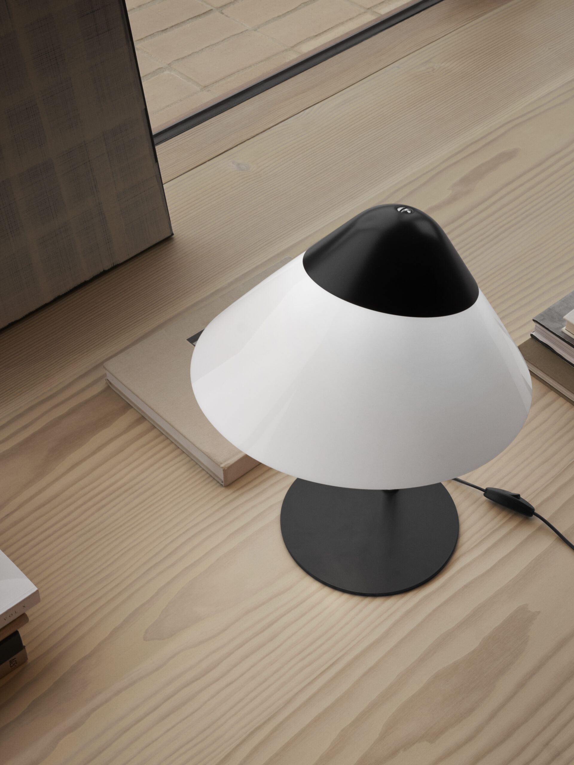 Lampa stołowa Opala posiada asymetryczny klosz z opalowego akrylu oraz lakierowaną aluminiową górę, emitując przyjemne, skupione światło, a jednocześnie delikatnie rozświetlając otoczenie poprzez klosz. Doskonale nadaje się zarówno do biura, jak i salonu.