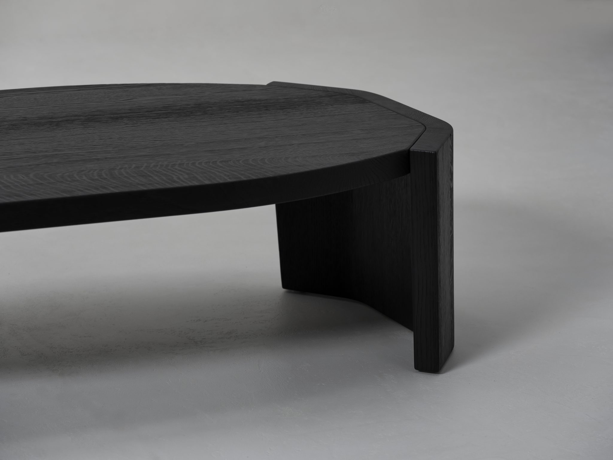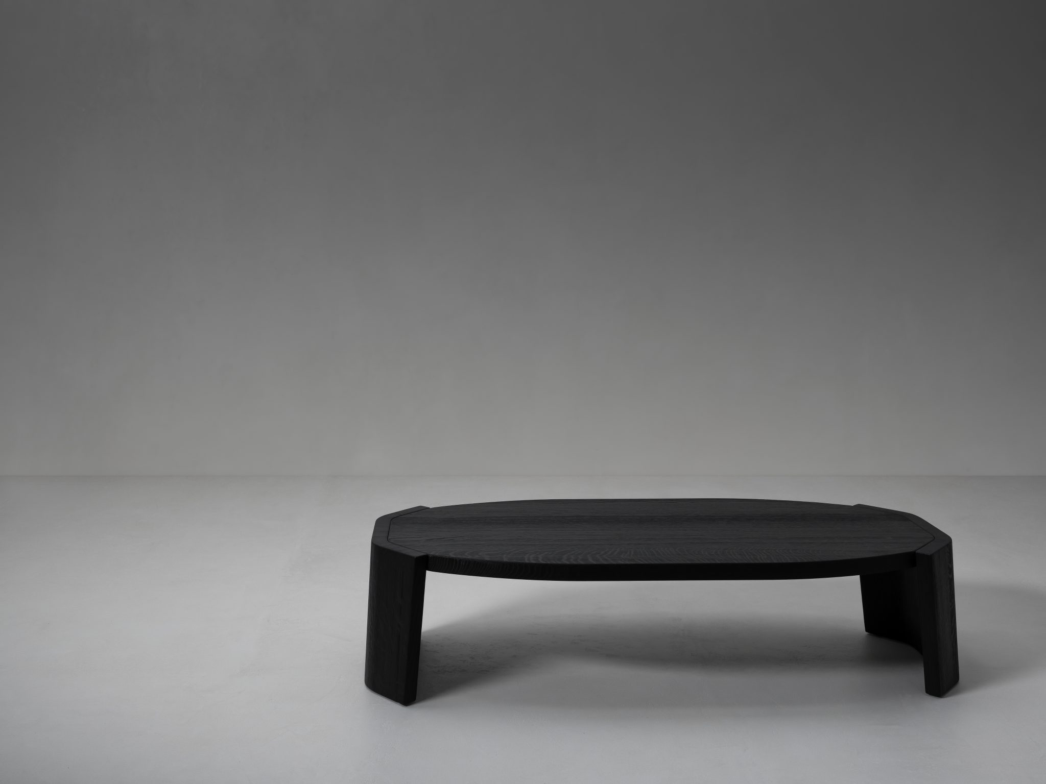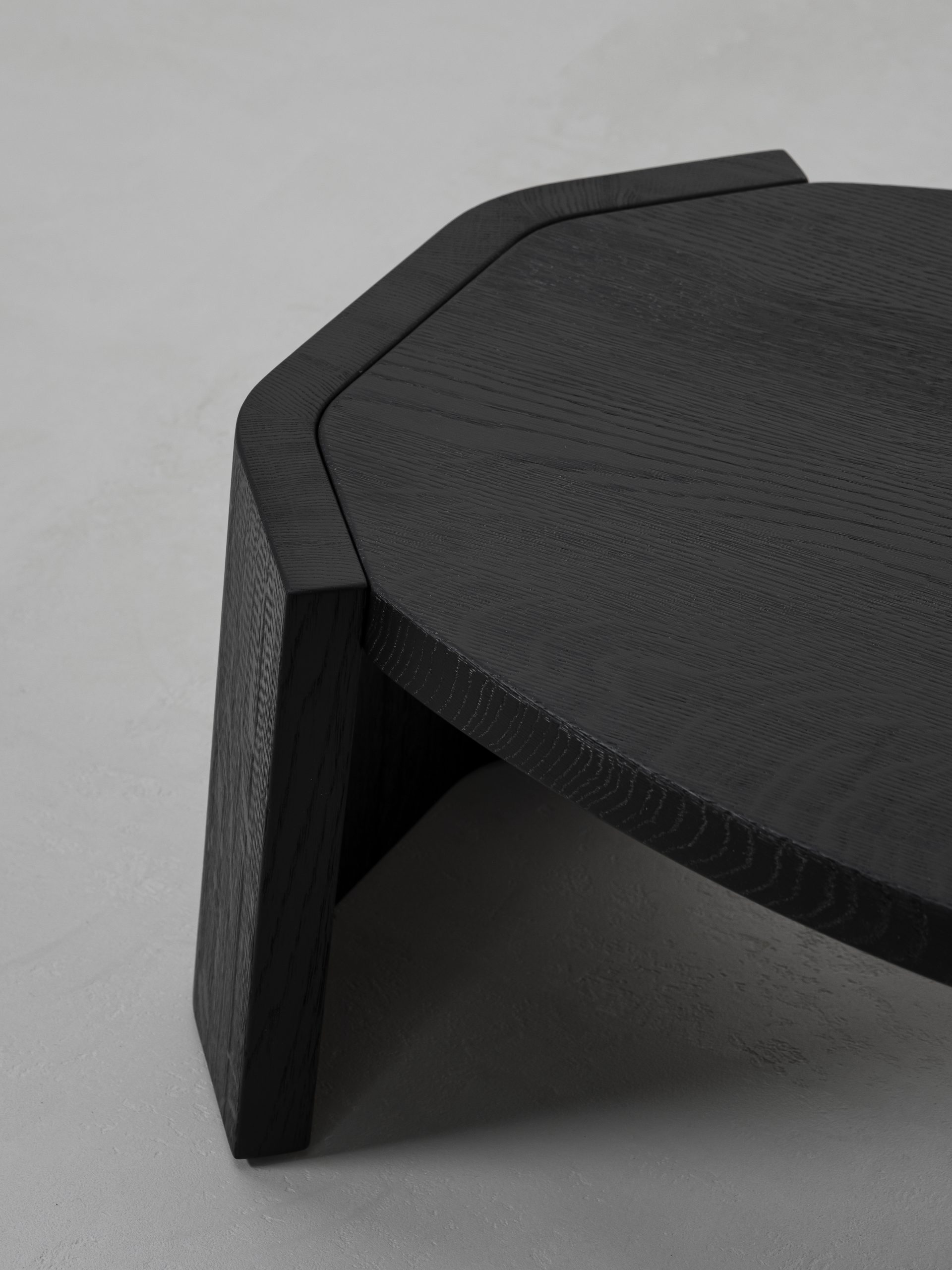 JAK Coffe Table to stolik kawowy z ośmiokątnym blatem o miękkich krawędziach, podtrzymywany przez dwie półksiężycowate nogi. Dostępny w kolorze francuskiego dębu. Mebel, który uchwyca harmonijny kontrast między solidnością a płynnością, zapraszając do kontemplacji i introspekcji poprzez swoją rzeźbiarską formę.