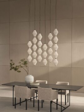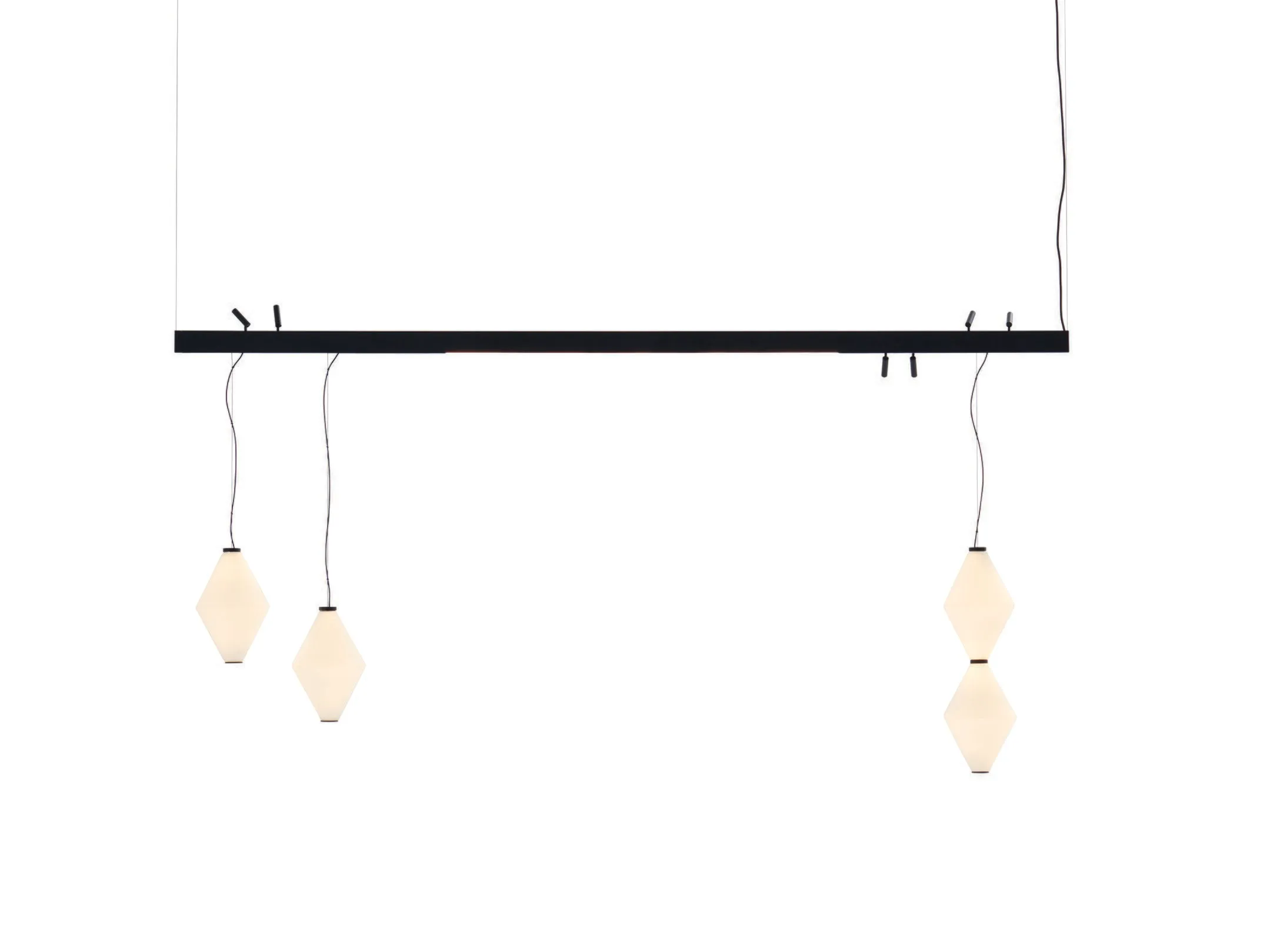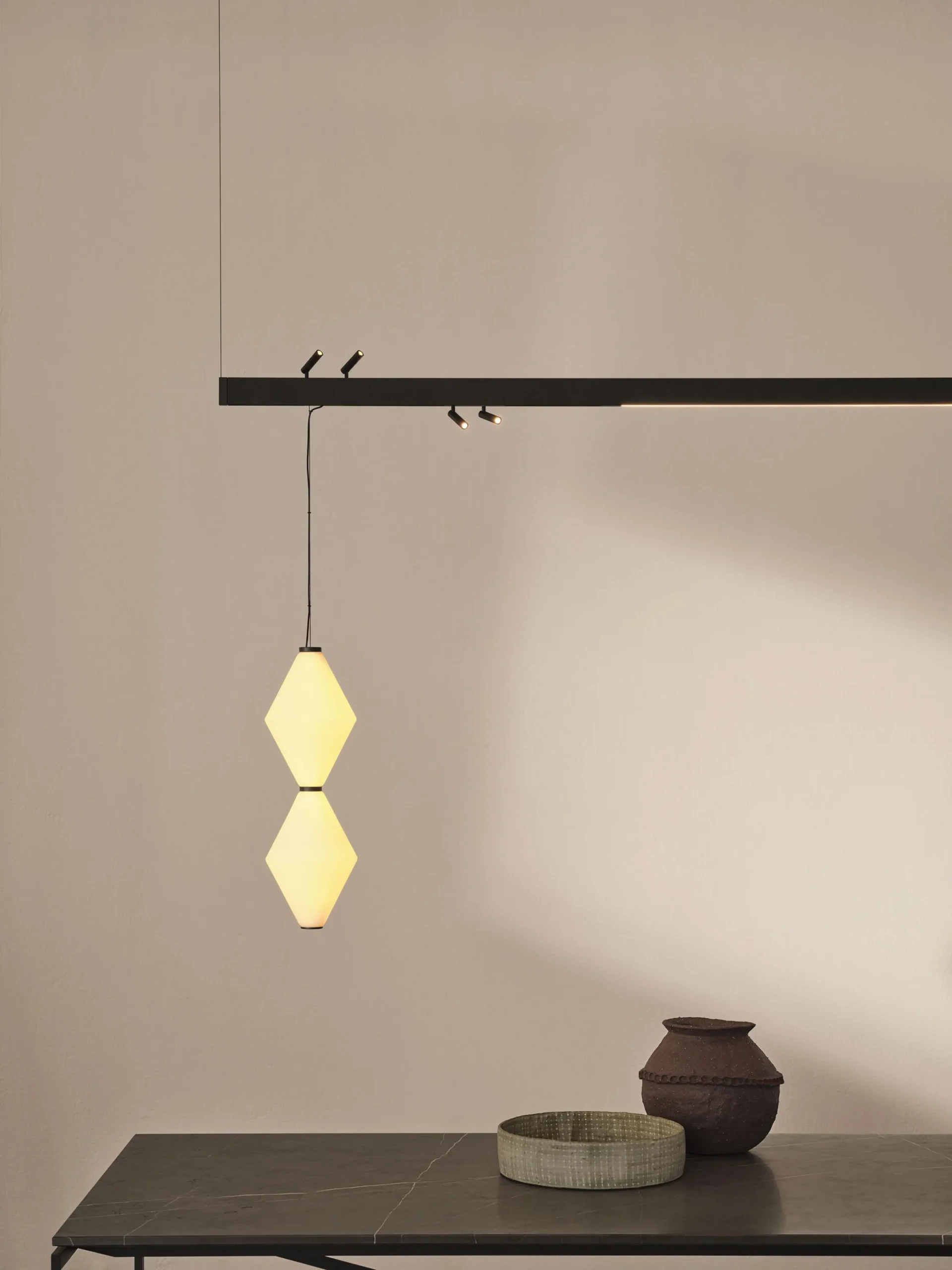 System składa się ze smukłych szyn zawieszonych na czarnych stalowych linkach, na których można zamontować dekoracyjne źródła światła, takie jak Nota i Helium Mini — już będące częścią kolekcji De Padova — co pozwala na tworzenie konfigurowalnych i adaptowalnych projektów oświetleniowych.