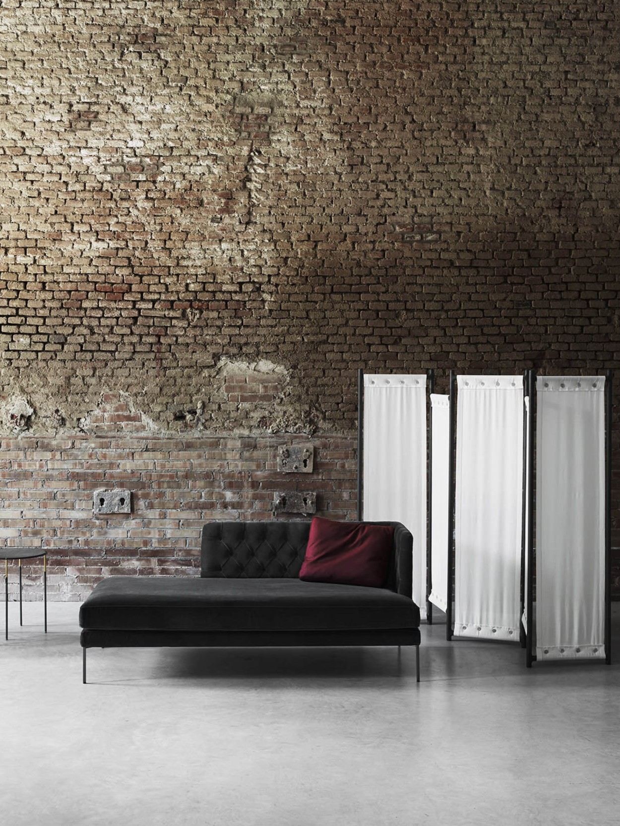 asymetryczny kształt i elementy retro nadają uroku tej eleganckiej leżance, która łączy smukłą linię z elegancko pikowanym oparciem i podłokietnikiem.
