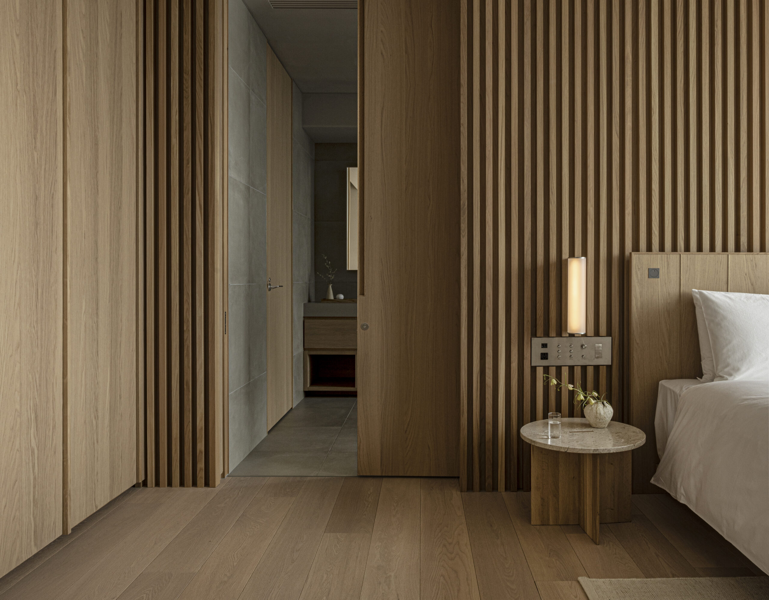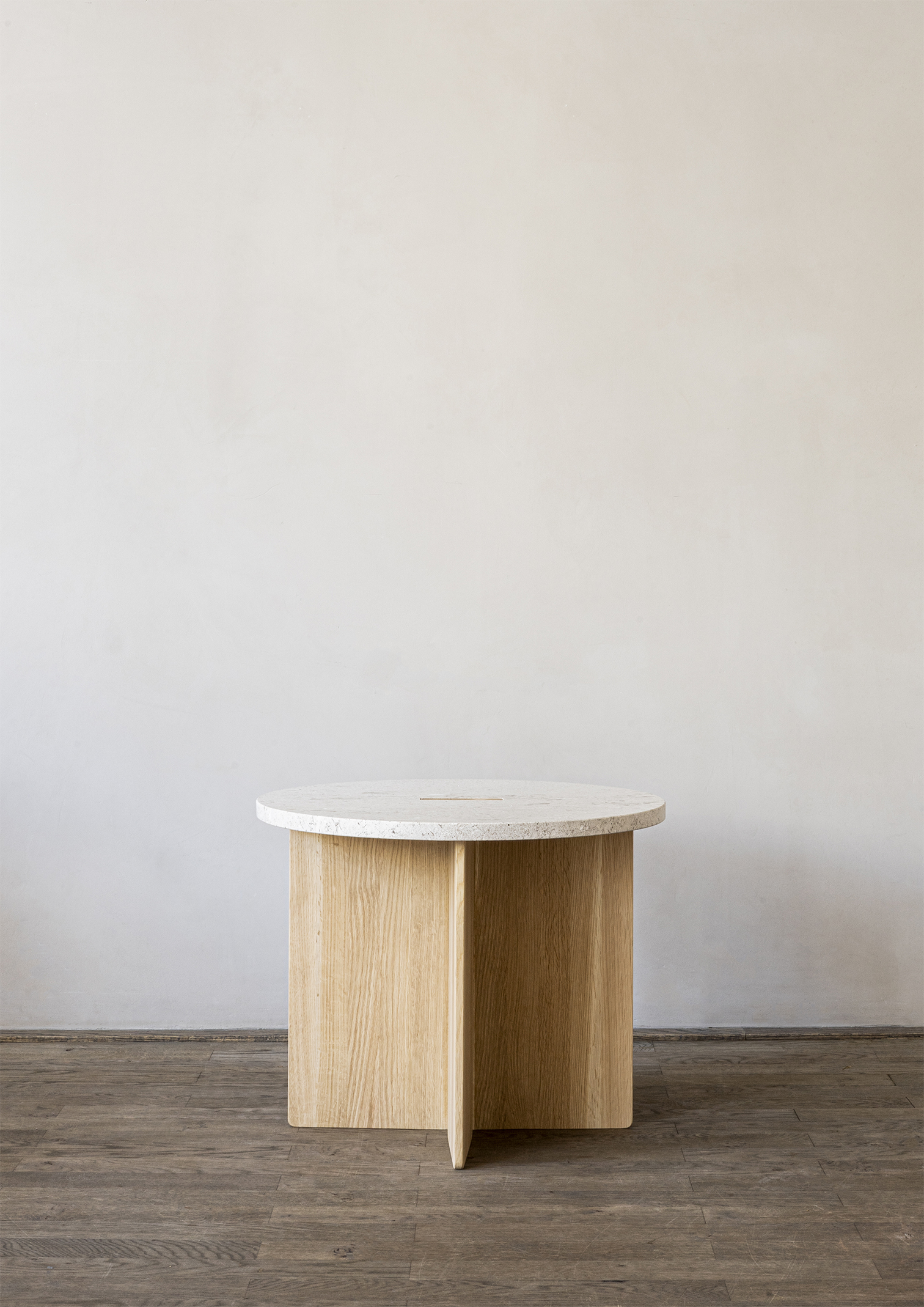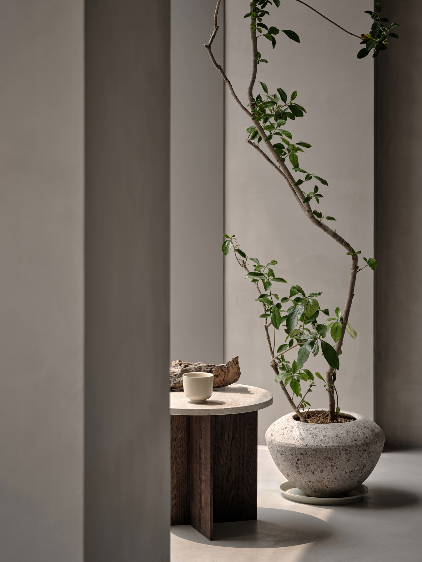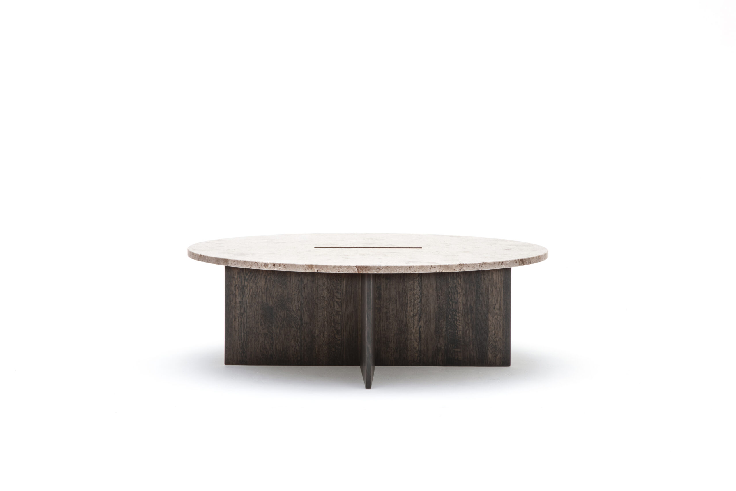Stół N-ST01 bada relację między lekkością a solidnością. Masywna drewniana podstawa zmienia swoją grubość w zależności od wymagań konstrukcyjnych — jest najbardziej wyrazista w centralnej części, gdzie łączą się elementy, i stopniowo wysmukla się ku końcom. Taki zabieg nadaje formie wizualną lekkość, nie odbierając jej jednocześnie wytrzymałości. Zaokrąglony blat z marmuru odsłania drewnianą podstawę poprzez subtelne wycięcie, podkreślając relację między materiałami oraz delikatnie sugerując kierunek.