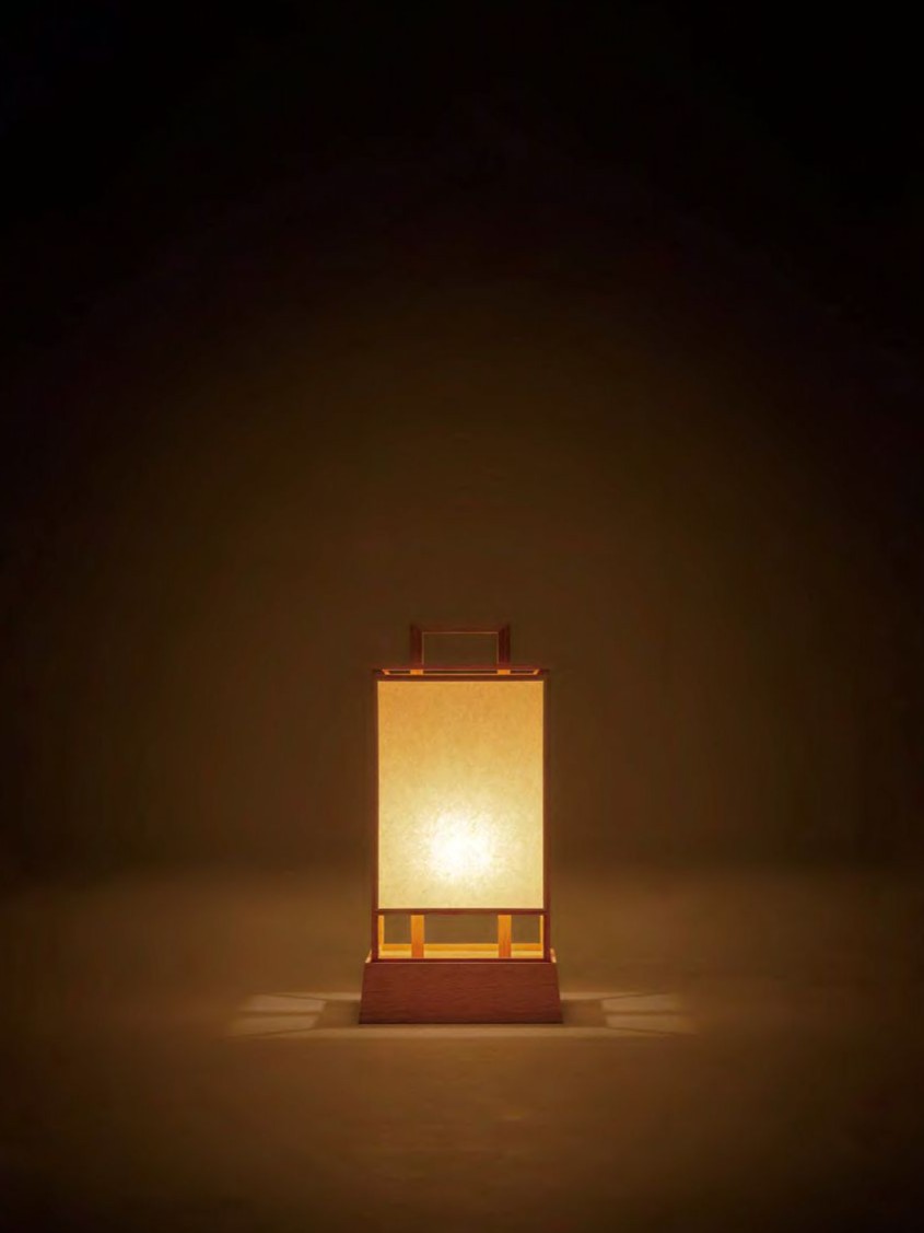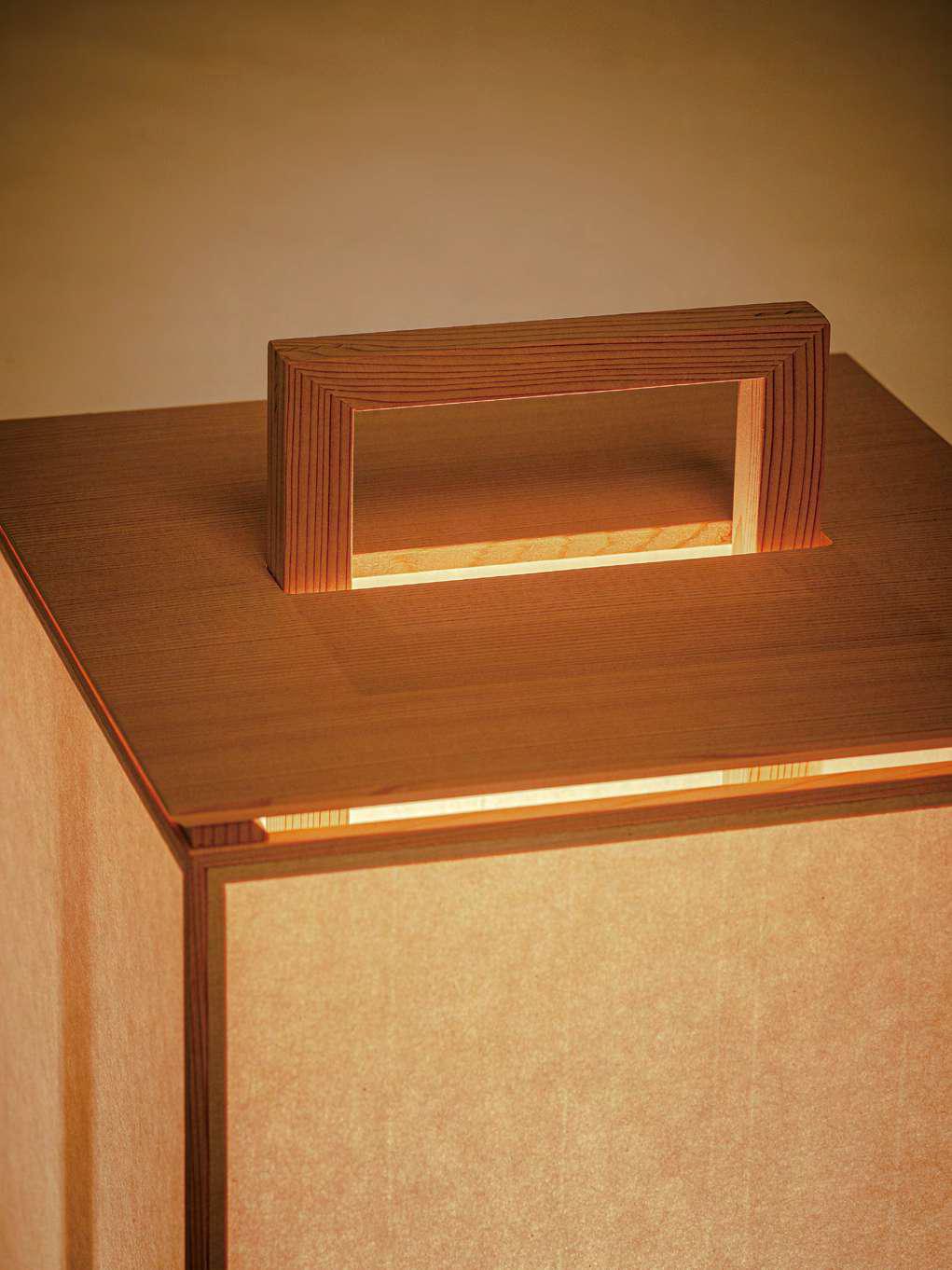 Nagoya to wykonany z rzadkiego i pięknego, ręcznie robionego papieru washi oraz cedru Akita i Mino. Projekt na nowo interpretuje tradycyjną prostokątną lampę używaną w połowie okresu Edo i jest wynikiem dokładnych badań przeprowadzonych na wielu historycznych książkach i starych narzędziach. Cedr Akita nadaje się do produkcji lamp, ponieważ nie pęka, nie wypacza się, nie rozszerza ani nie kurczy, a także jest łatwy w obróbce. Rama jest montowana przez mistrza rzemiosła specjalizującego się w stolarce do oświetlenia, przy użyciu wyłącznie wyszukanych łączeń i stolarki bez żadnych metalowych okuć.