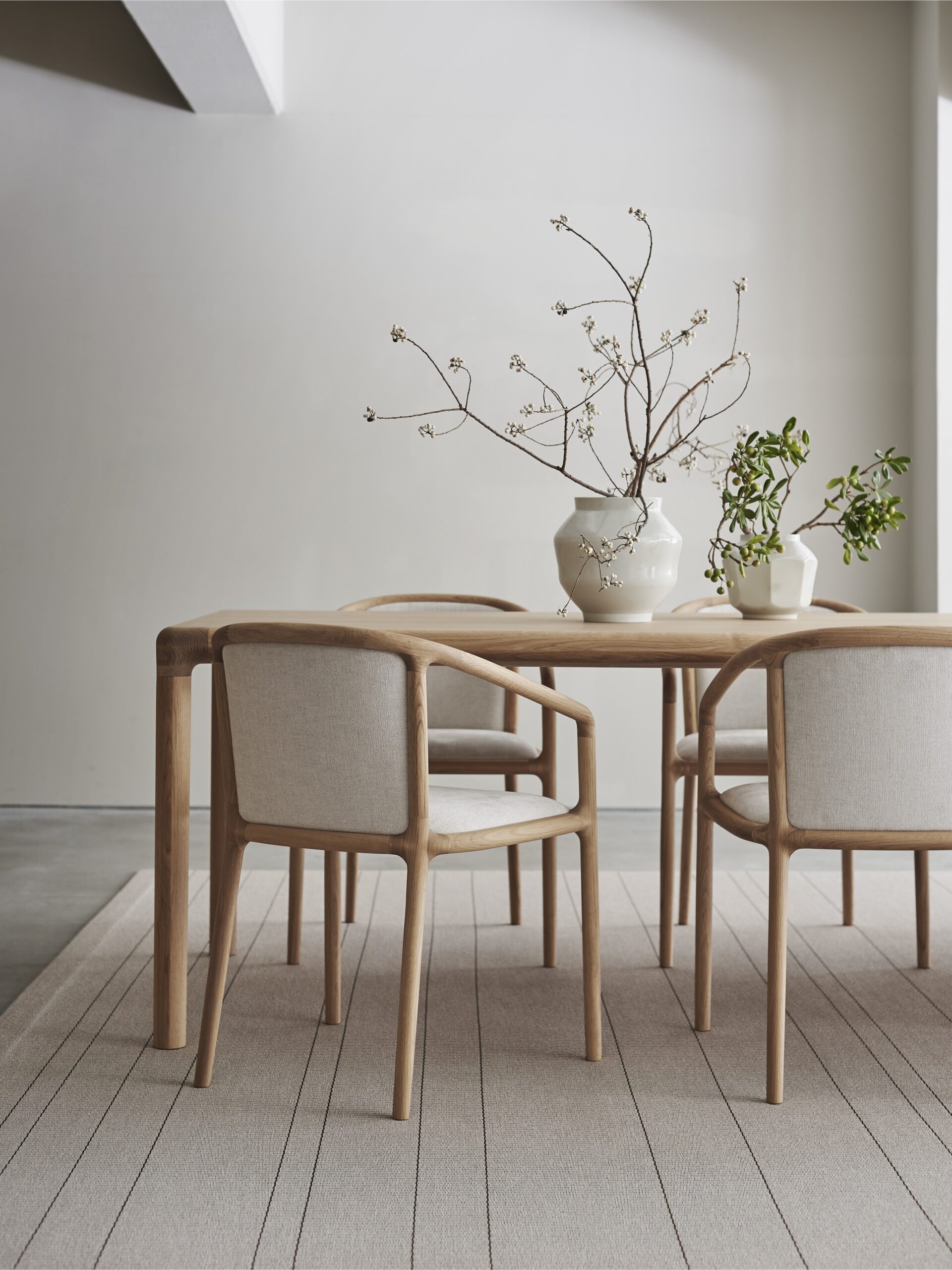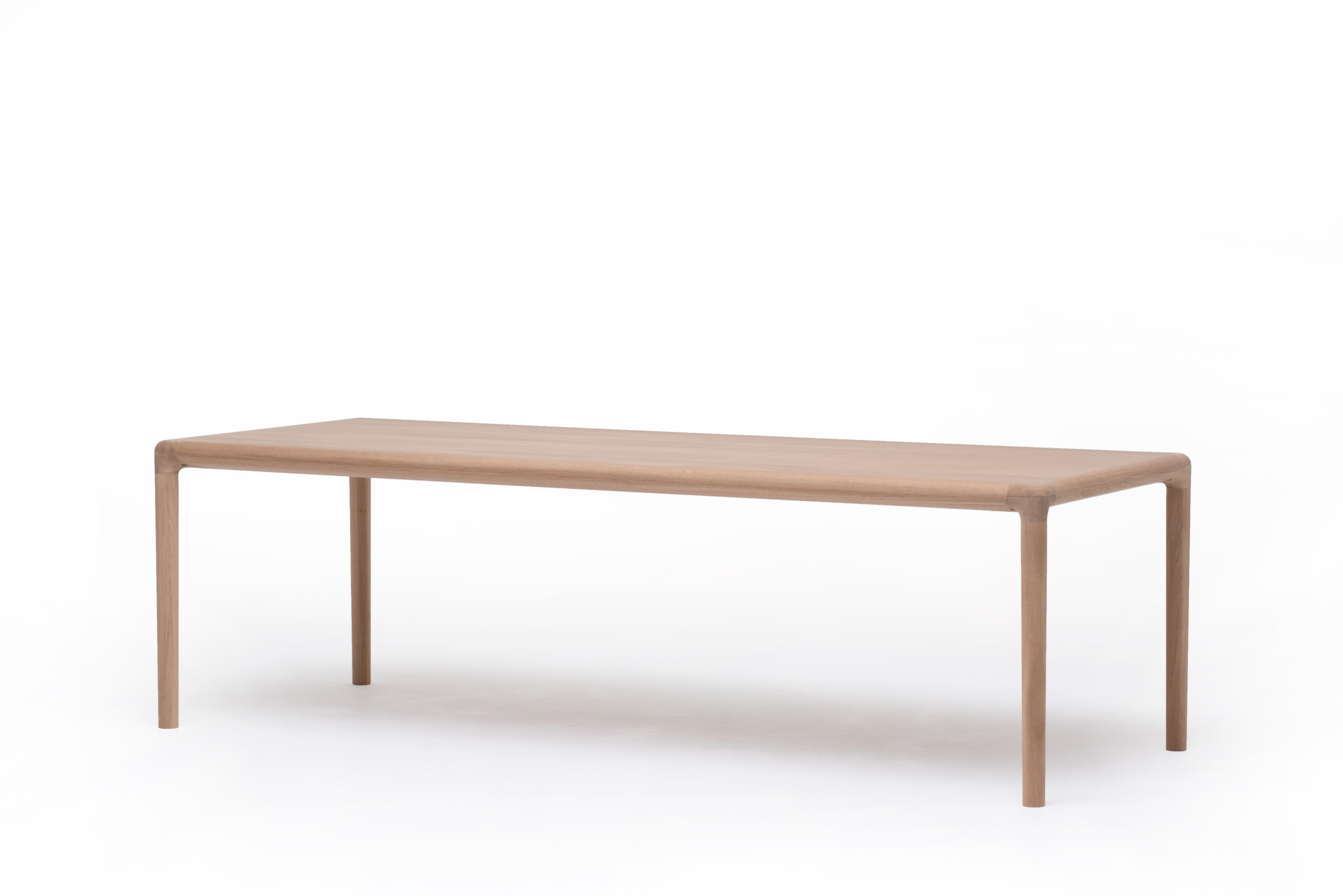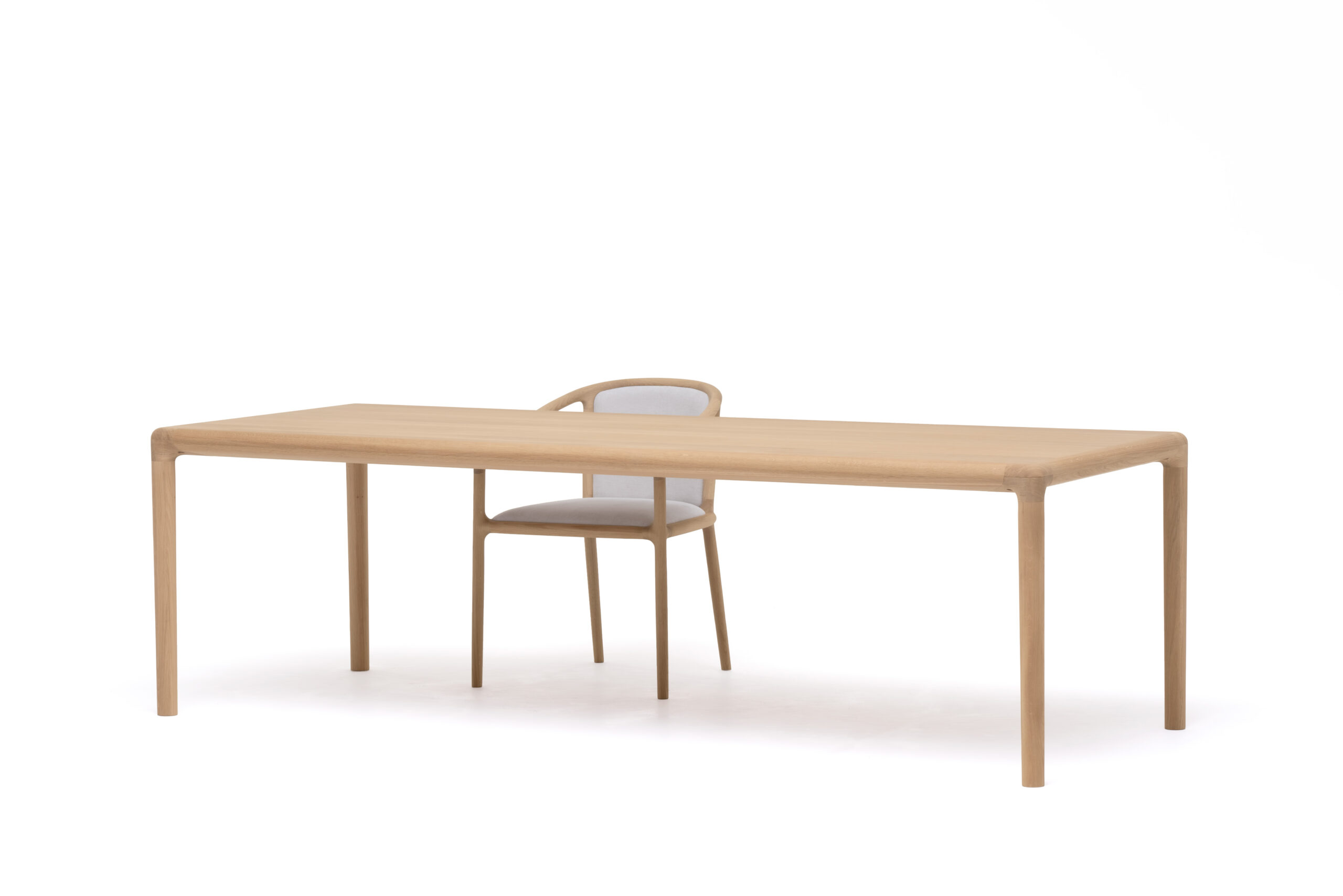 Stół jadalniany NF-DT01 charakteryzuje się prostą sylwetką i wyrafinowaną geometrią, typowymi dla kolekcji NF. Miękko zaokrąglone narożniki nawiązują do języka projektowego krzesła NF-DC01 | Dining Chair, którego opadające podłokietniki harmonijnie wsuwają się w odpowiadający im kąt na spodniej stronie blatu.