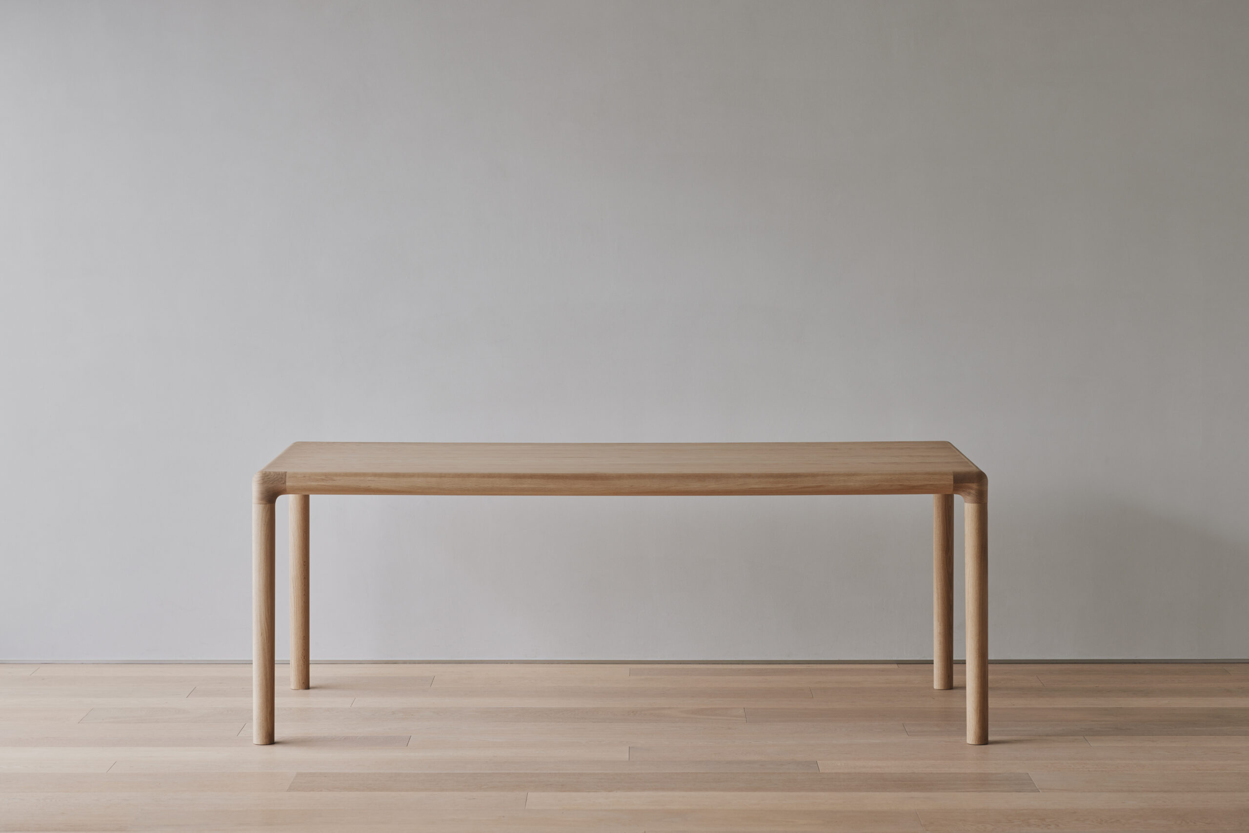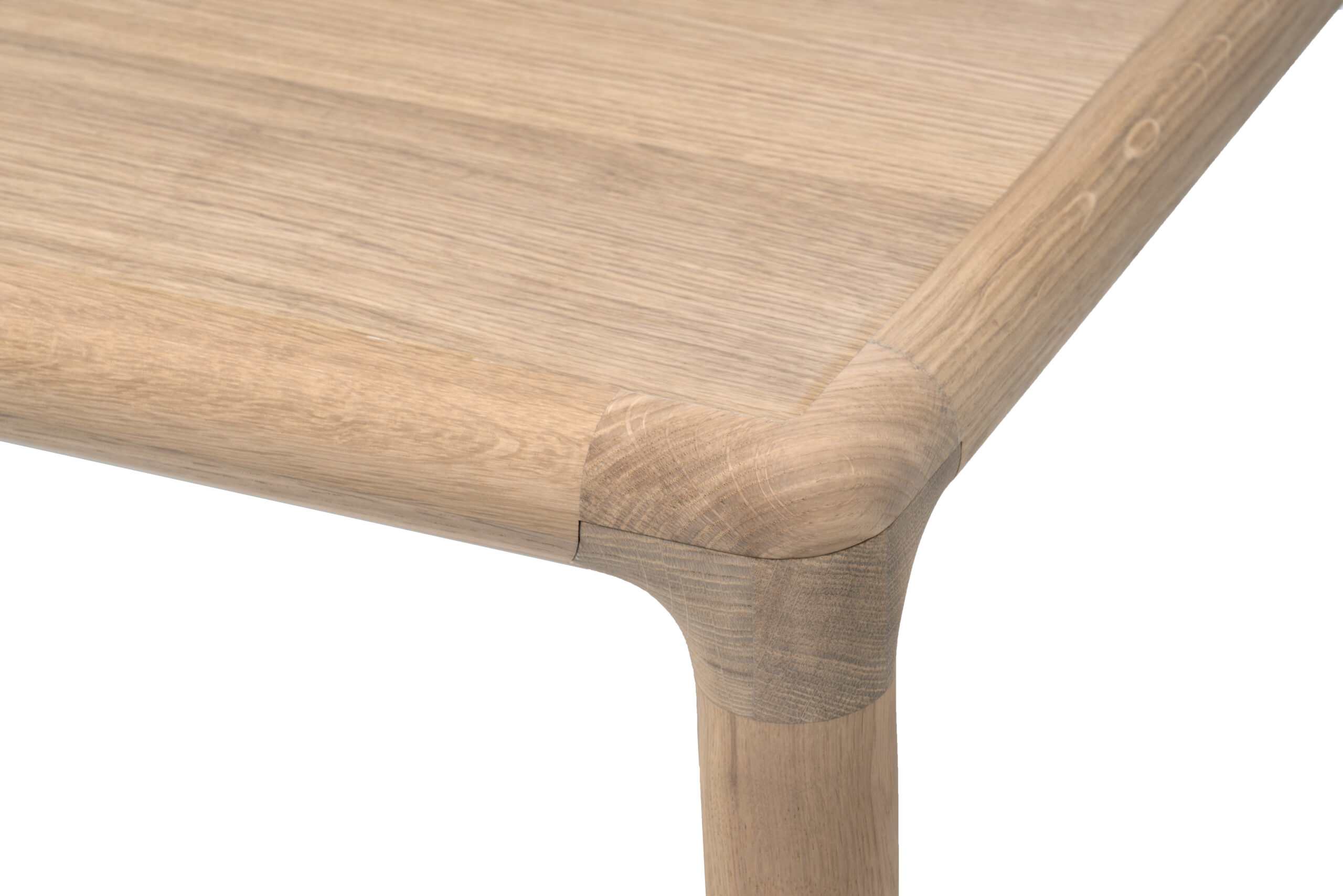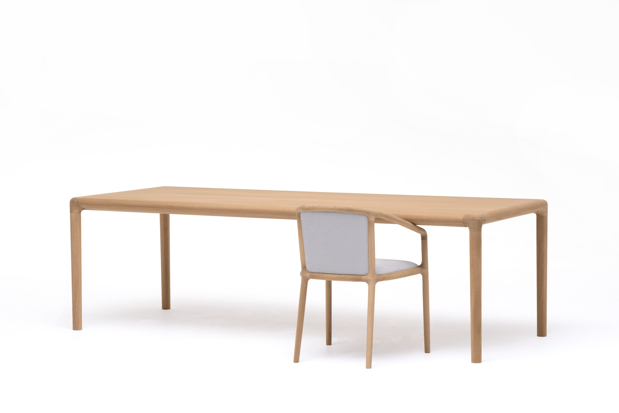 Stół jadalniany NF-DT01 charakteryzuje się prostą sylwetką i wyrafinowaną geometrią, typowymi dla kolekcji NF. Miękko zaokrąglone narożniki nawiązują do języka projektowego krzesła NF-DC01 | Dining Chair, którego opadające podłokietniki harmonijnie wsuwają się w odpowiadający im kąt na spodniej stronie blatu.
