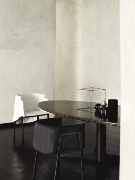 Konstrukcja trzech smukłych nóg, połączonych metalowymi prętami umieszczonymi na różnych wysokościach: zdają się gonić w grze graficznej wyznaczającej rytm stołu, oferując za każdym razem inną perspektywę.