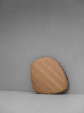 Stół ukazuje poetyckie połączenie kontrastujących form – lśniący owal blatu i podstawy zestawiono z prostolinijną, rzeźbiarską nogą z mosiądzu. Ta intrygująca kompozycja kształtów stanowi wyraz kunsztu i mistrzostwa, które stoją za procesem jego powstawania.