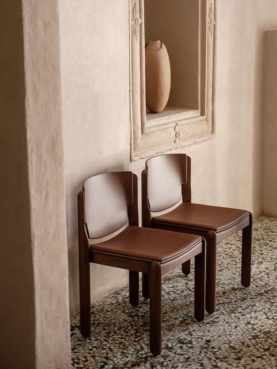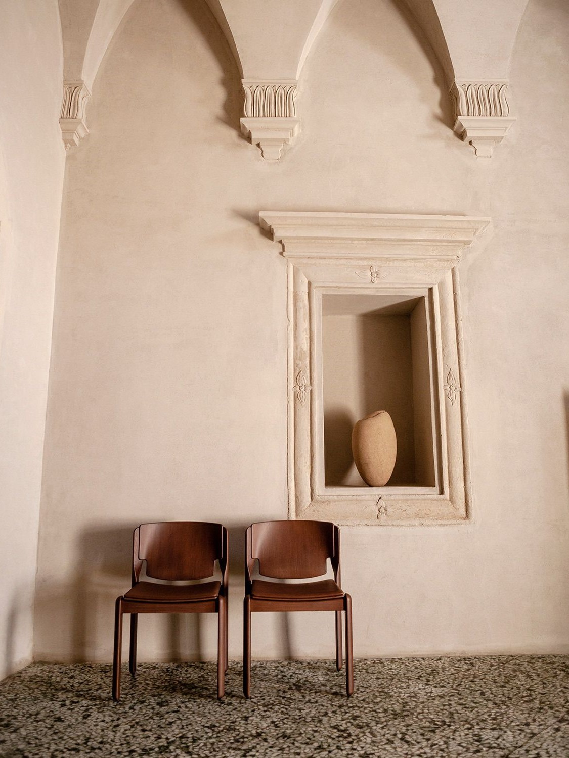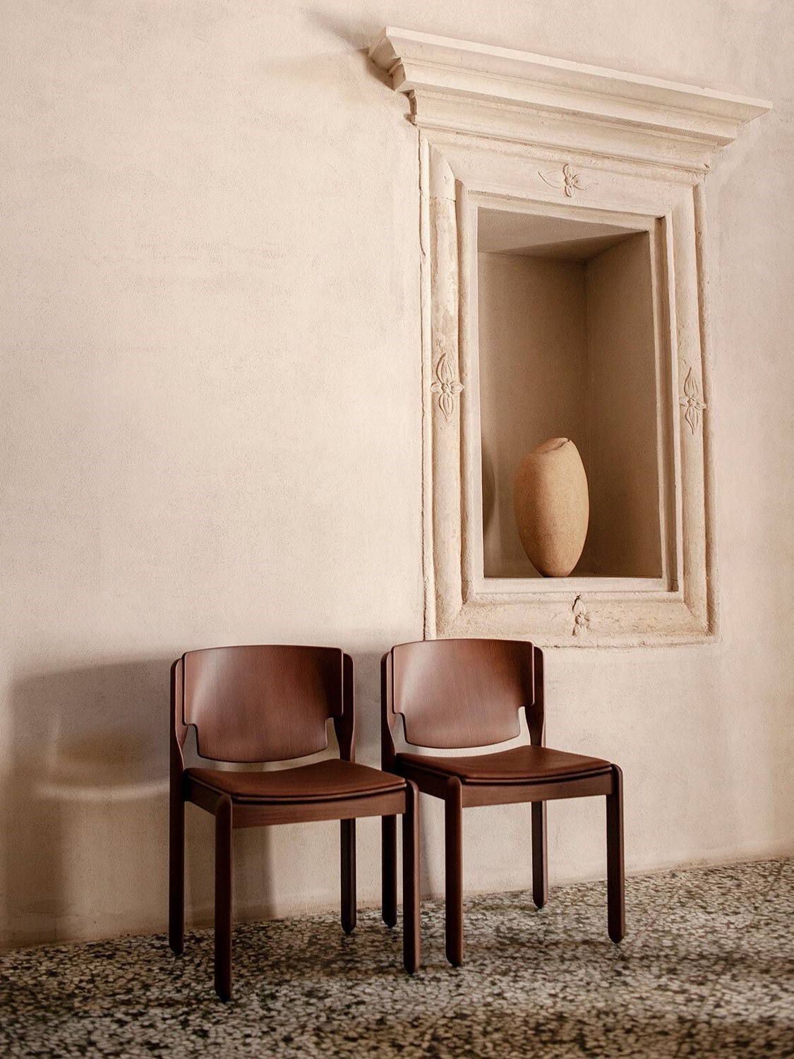 Tacchini z dumą prezentuje na nowo krzesło, które odzwierciedla dychotomię obecną w wielu pracach architekta z Lombardii: solidne i wytrzymałe, a jednocześnie sztaplowane i lekkie, co ułatwia przenoszenie. Lekki, spiralny obrót definiuje tylne nogi, które stają się podporami dla lekko pochylonego i zakrzywionego oparcia, podczas gdy miękkie, zaokrąglone linie łagodzą kształt przednich nóg w miejscu, gdzie stykają się z podstawą siedziska, która jest geometryczna i prostokątna.