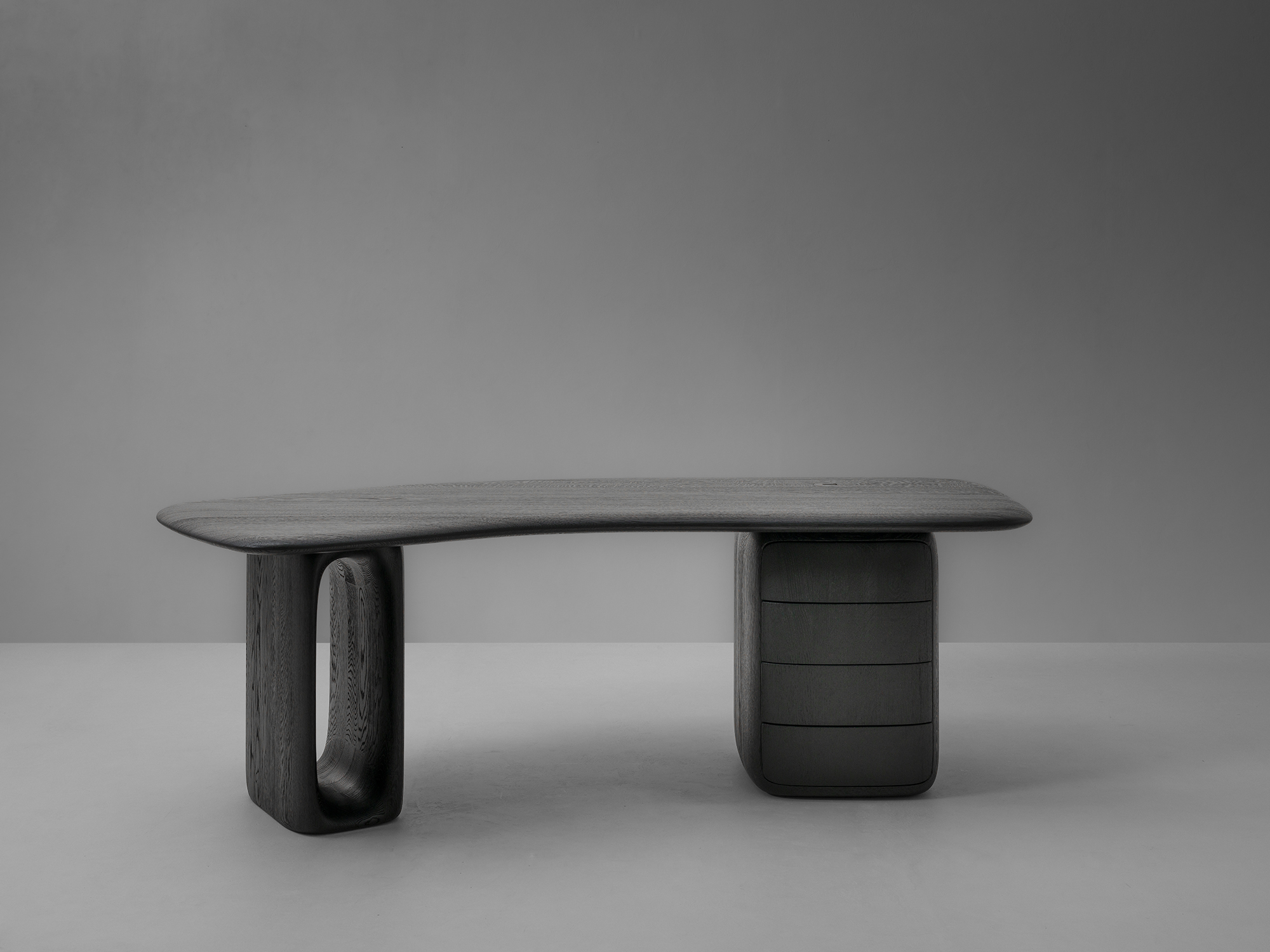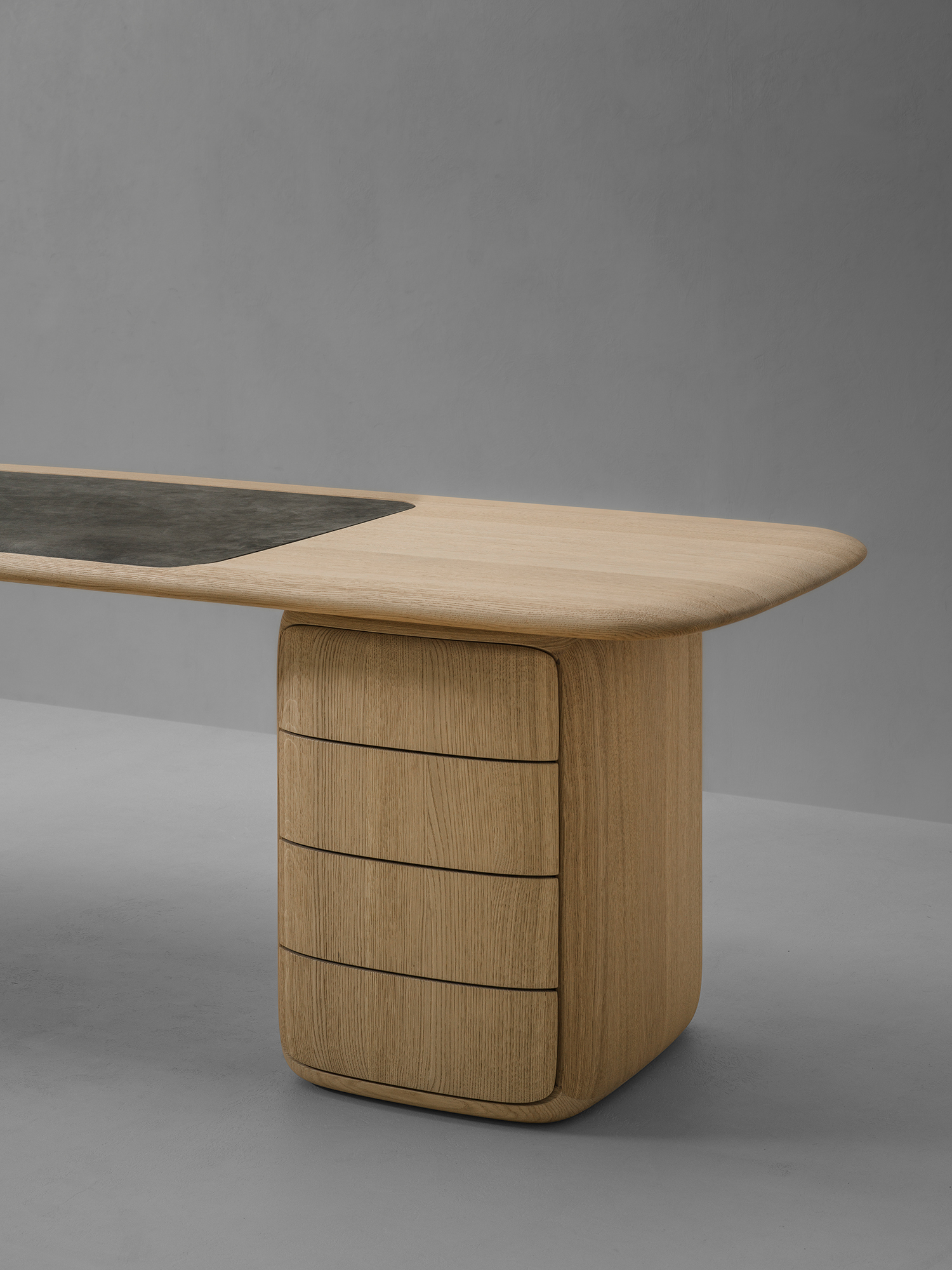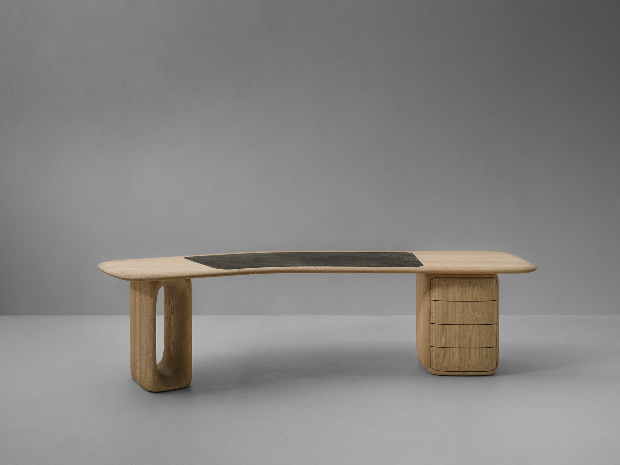 Organiczne biurko PATINE z zaokrąglonymi krawędziami. Blat jest wsparty na dwóch podłużnych nogach z owalnymi wycięciami. Dostępne we francuskim dębie, w dowolnym kolorze według wzornika producenta. Możliwa intarsja ze skóry. Wygięte krawędzie tworzą gładki, delikatny profil, który emanuje naturalną elegancją.