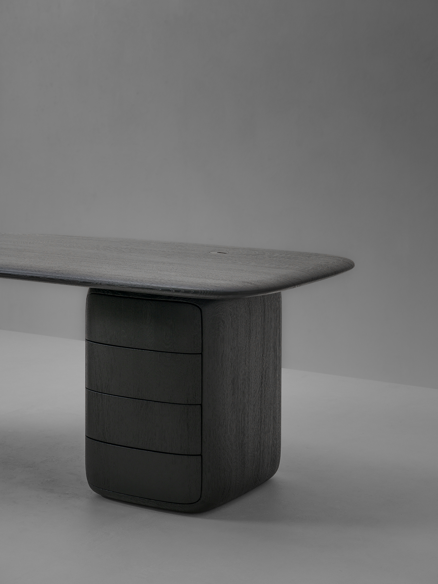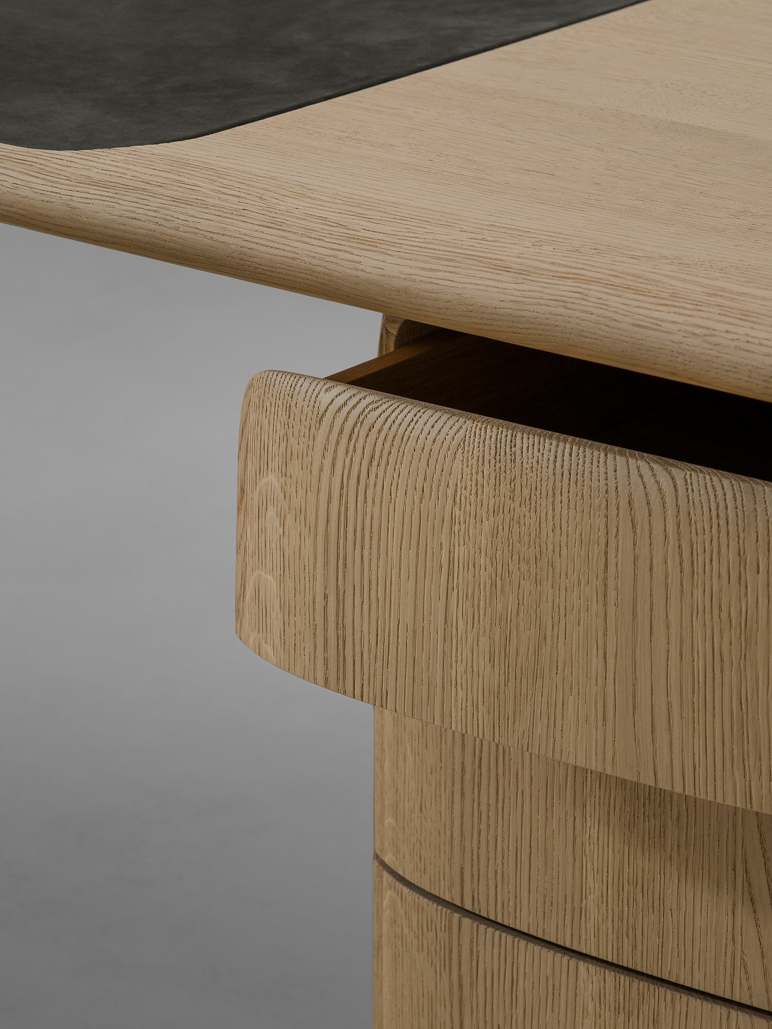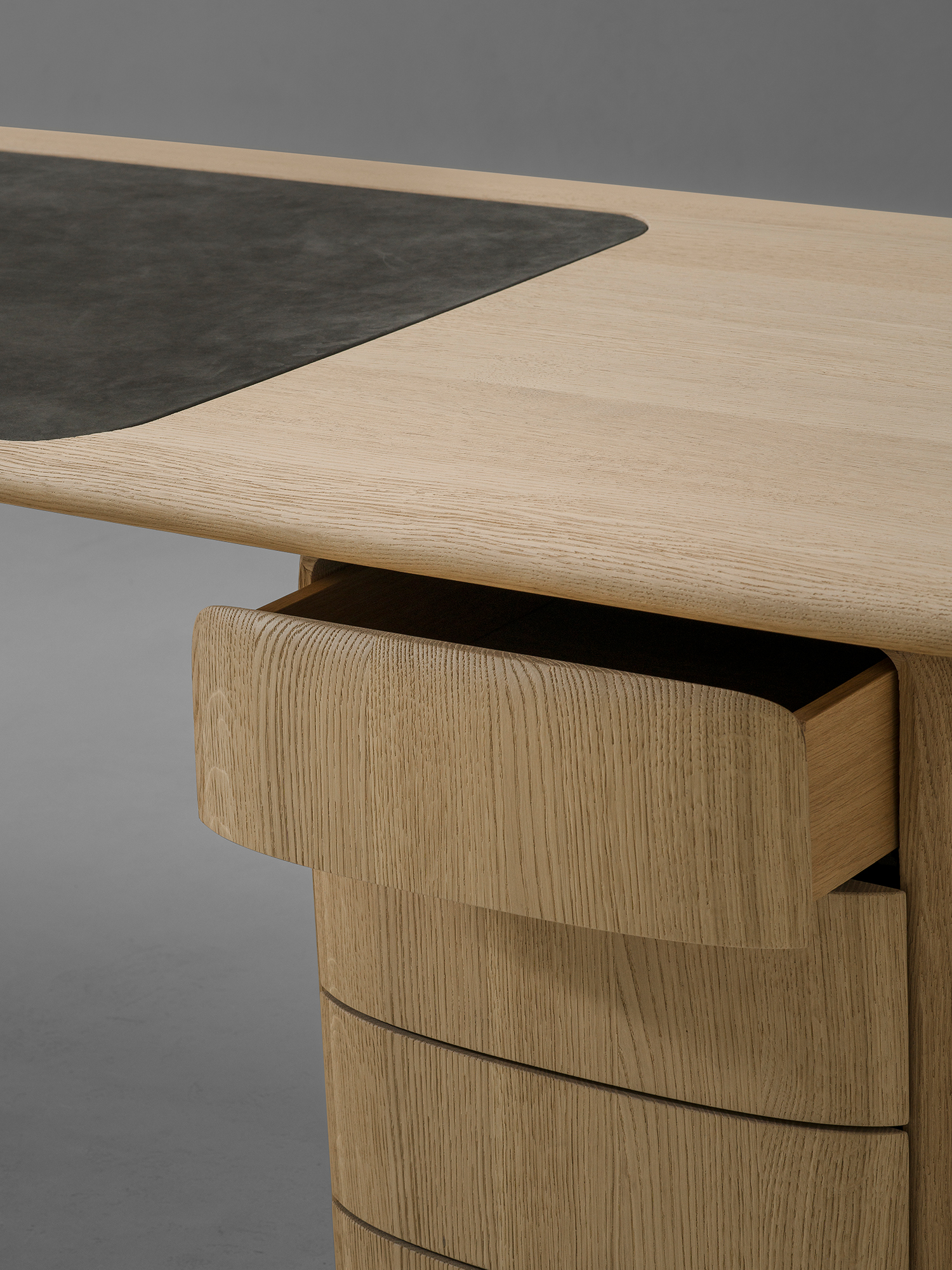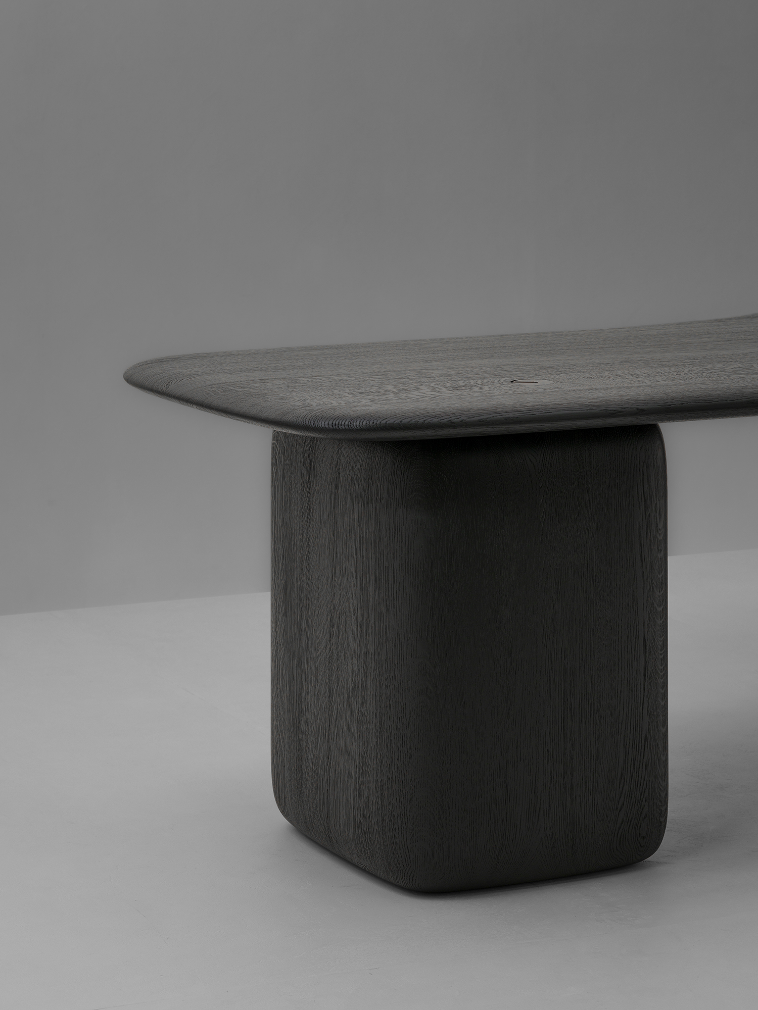 Organiczne biurko PATINE z zaokrąglonymi krawędziami. Blat jest wsparty na dwóch podłużnych nogach z owalnymi wycięciami. Dostępne we francuskim dębie, w dowolnym kolorze według wzornika producenta. Możliwa intarsja ze skóry. Wygięte krawędzie tworzą gładki, delikatny profil, który emanuje naturalną elegancją.