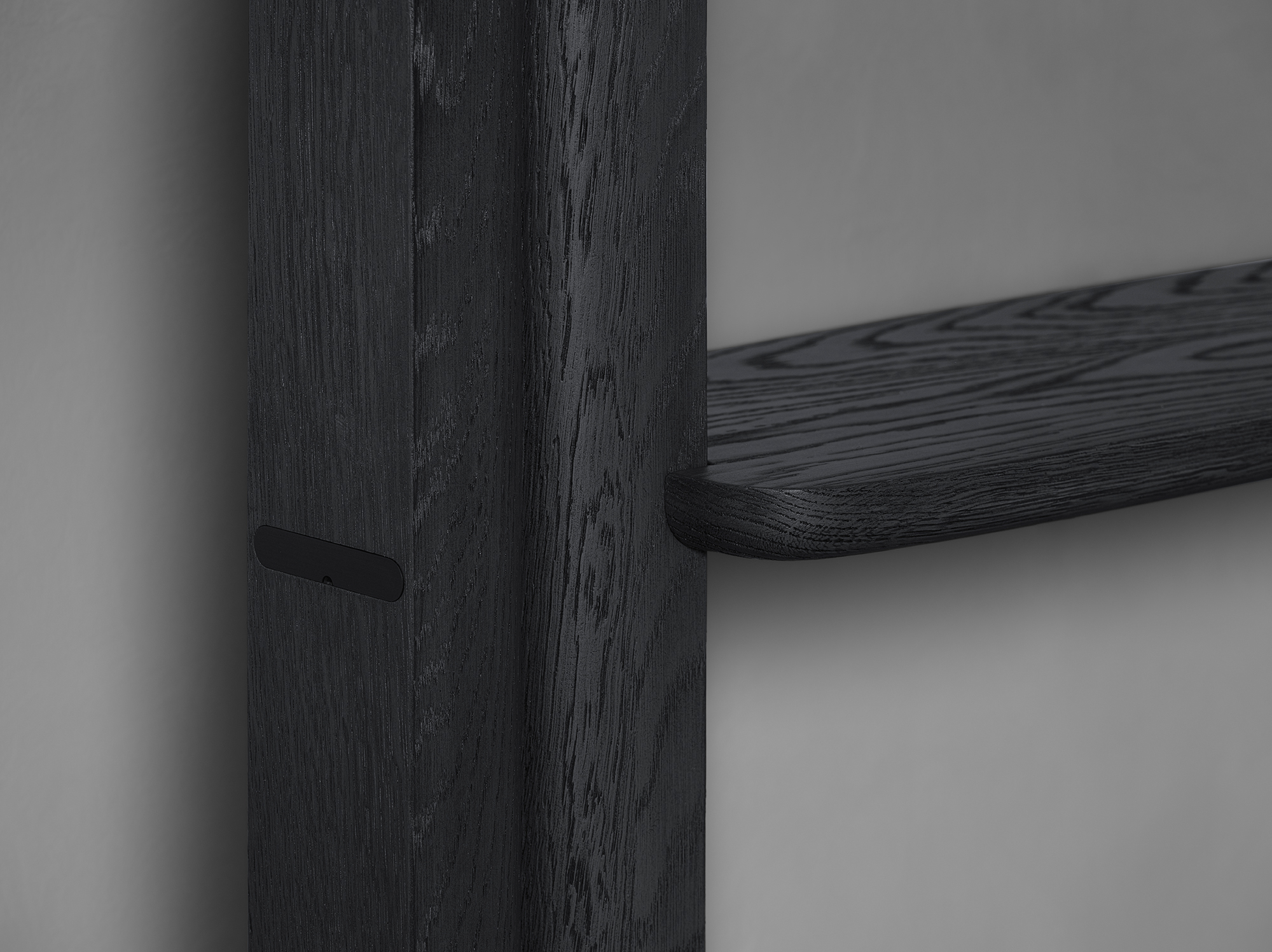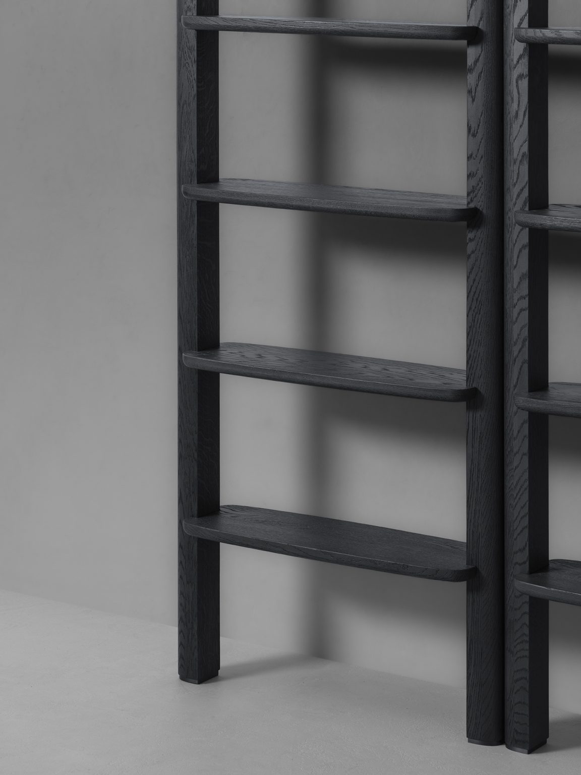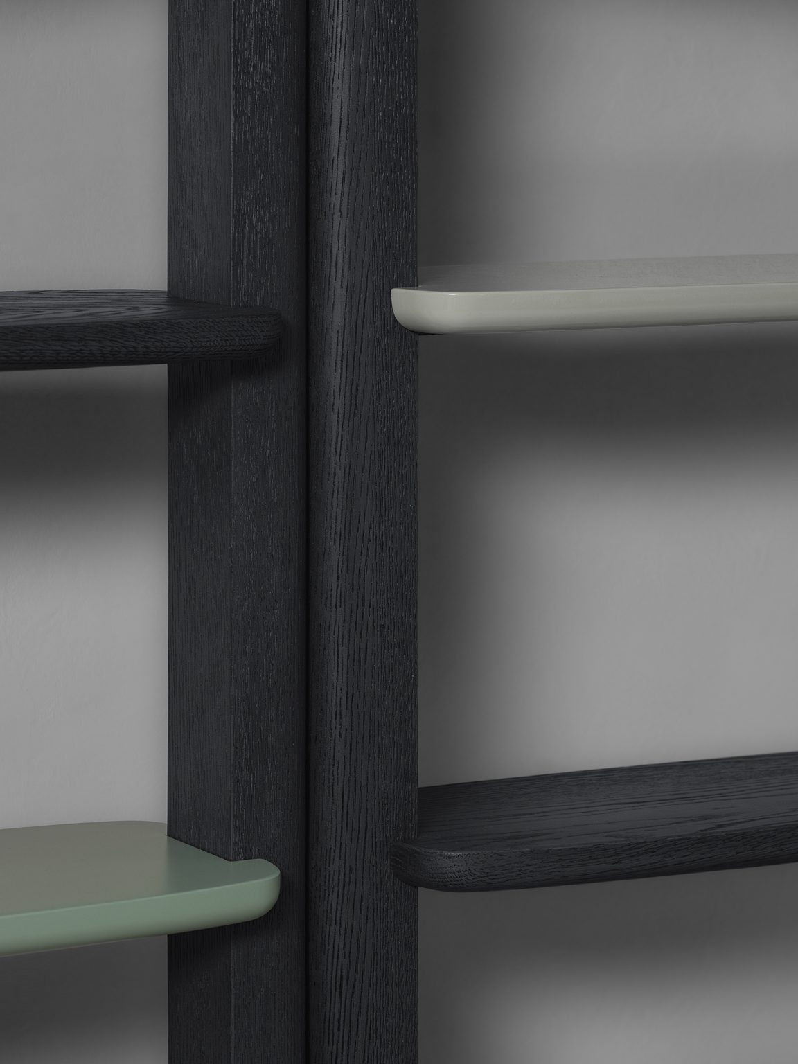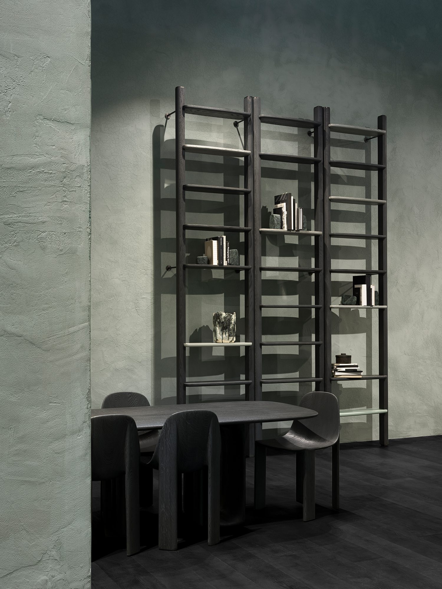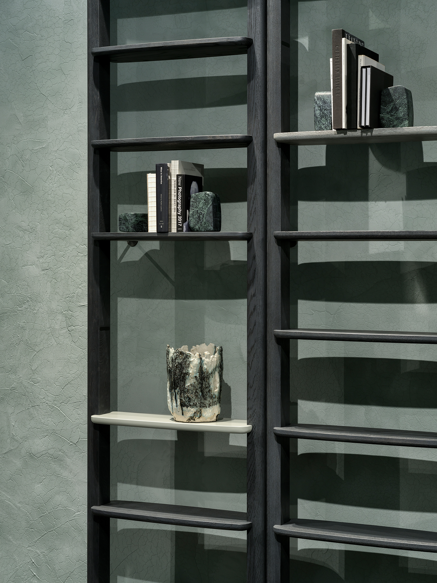 Modułowa, wolnostojąca biblioteka SCALAE, wykonana z litego drewna ze zintegrowanym systemem półek, który zawiera subtelne detale ze stali lub mosiądzu. Można ją przymocować do ściany, podłogi lub sufitu. Półki są dostępne we francuskim dębie lub lakierze wykończeniu ultramatowym i na wysoki połysk.