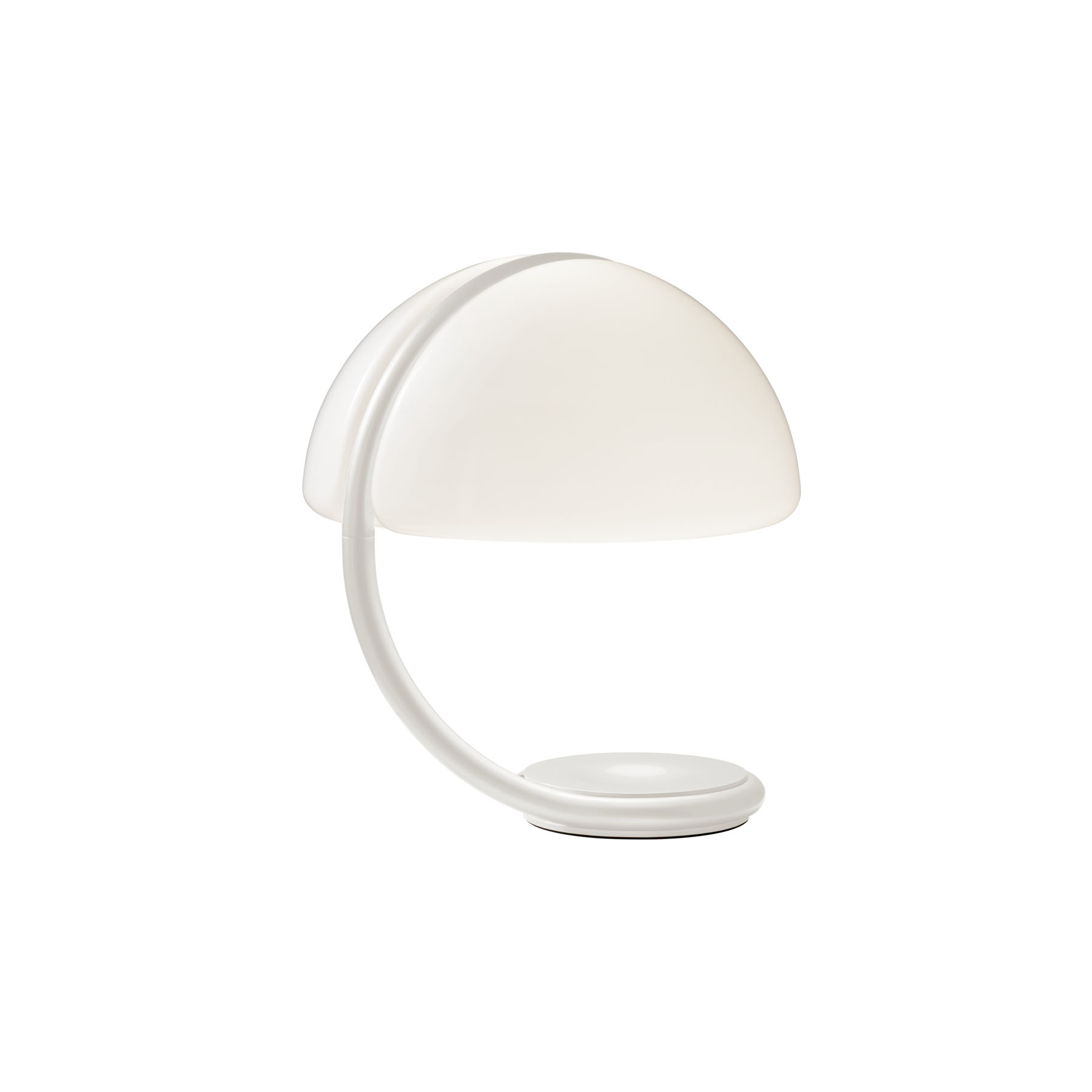Lampa stołowa Serpente jest doskonałym przykładem projektowania oświetlenia inspirowanego naturą i stanowi wybitny projekt XX wieku. Obrotowe ramię wysuwa się z centralnej podstawy, aby unieść się i podeprzeć kopułowy klosz zapewniający rozproszone oświetlenie. Rzuca piękne, rozproszone światło z obrotowego ramienia z białym, opalowym kloszem z metakrylanu, a metalowa lakierowana konstrukcja jest dostępna w kolorze białym lub złotym. Specjalna złota wersja jest dostępna w limitowanej edycji 100 sztuk dla upamiętnienia 50. rocznicy wprowadzenia Serpente. Lampa stołowa Serpente znajduje się w stałej kolekcji Metropolitan Museum of Art w Nowym Jorku