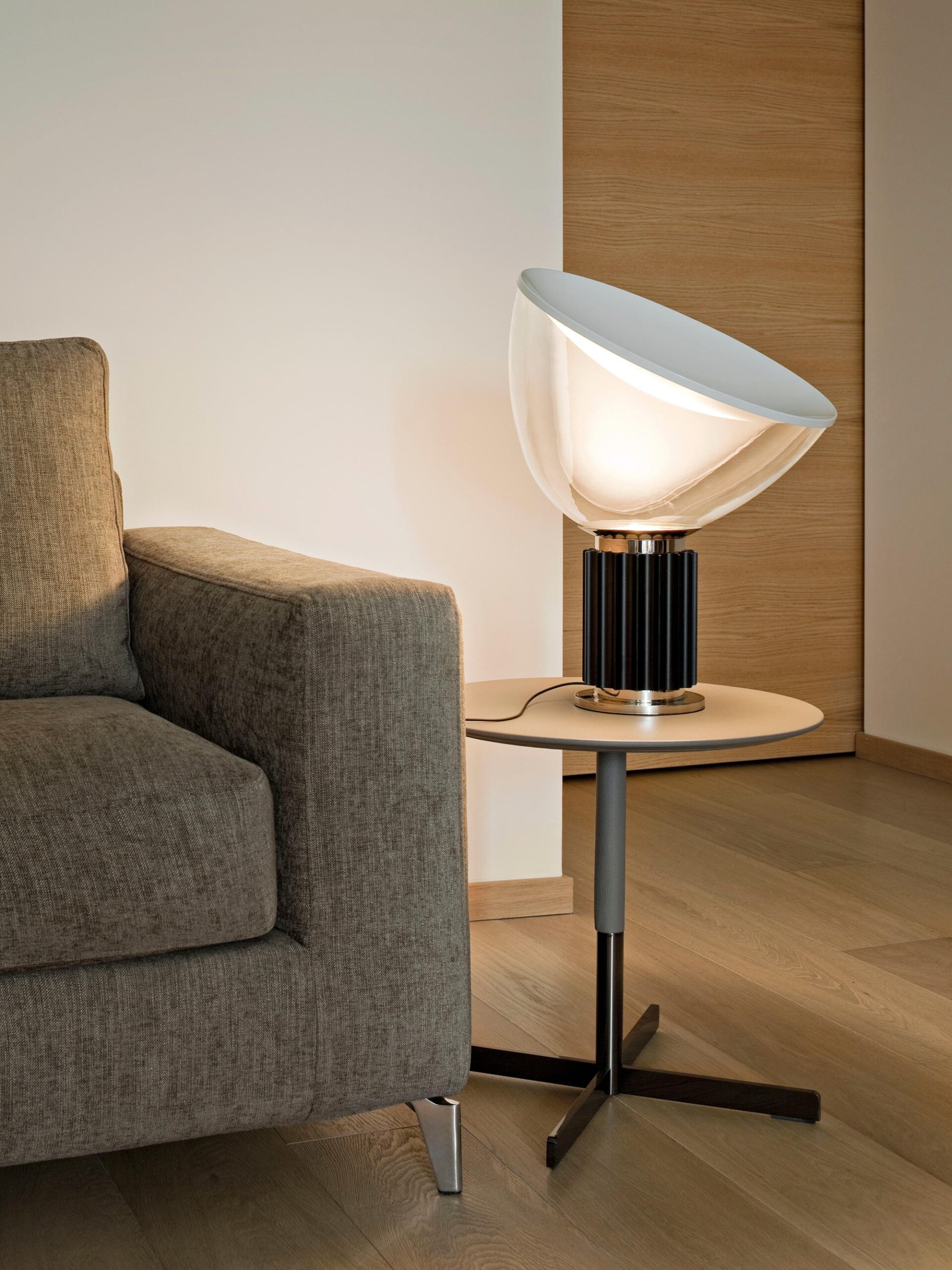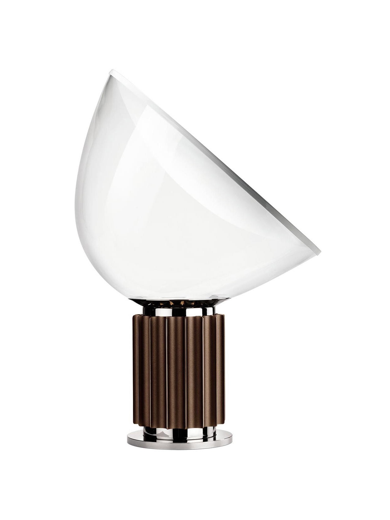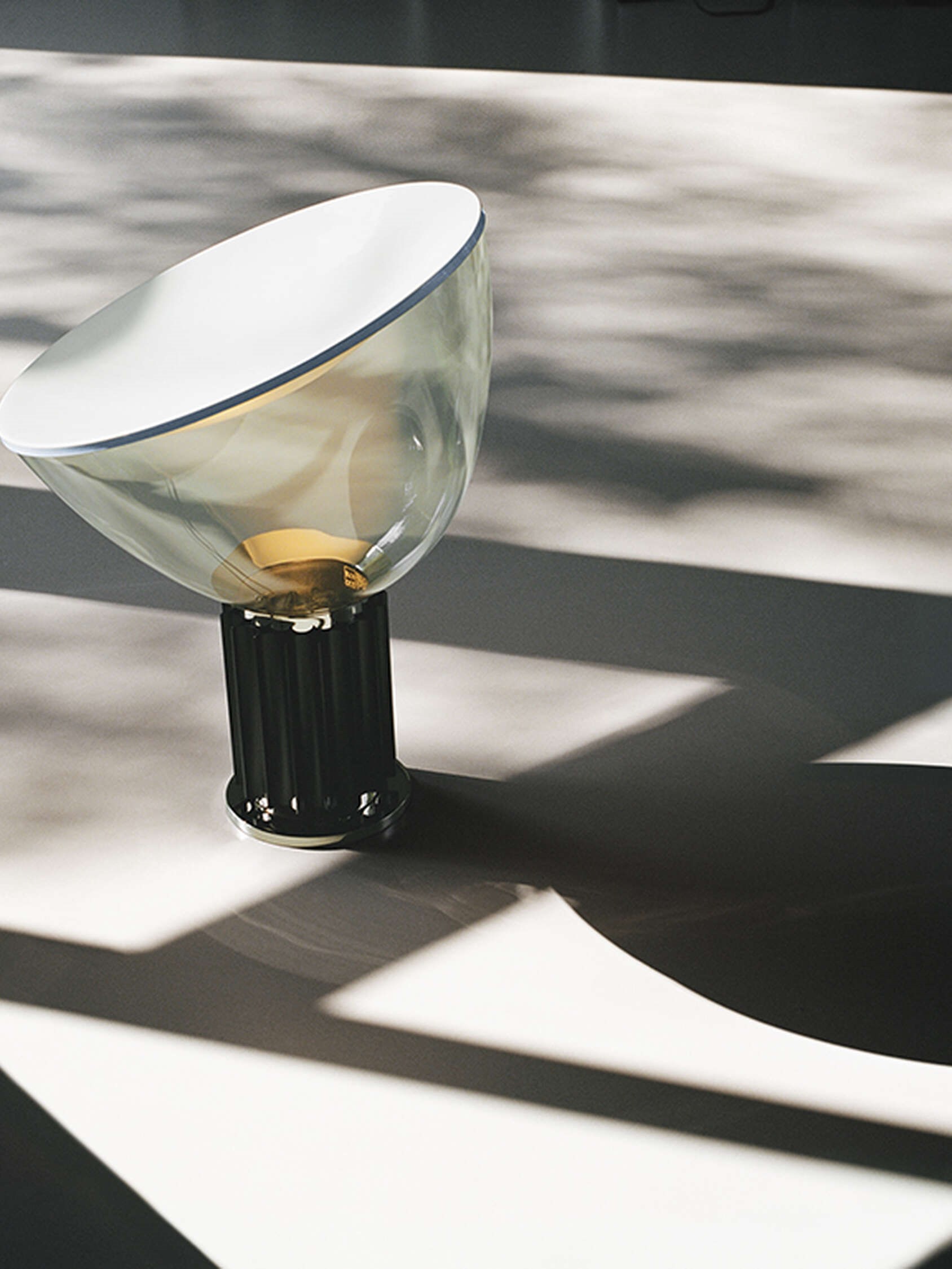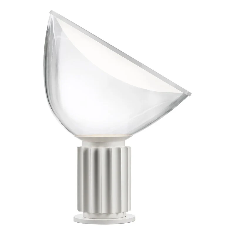 Oryginalny projekt Taccia z 1958 roku był wykonany z przezroczystego plastiku – pomysł został jednak odrzucony, ponieważ ciepło źródła światła go odkształcało. W 1962 roku Taccia została wyprodukowana przez firmę Flos ze słynną misą z dmuchanego szkła. Dzięki światłu LED można powrócić do oryginalnej koncepcji. Lampa stołowa zapewnia światło pośrednie i odbite
