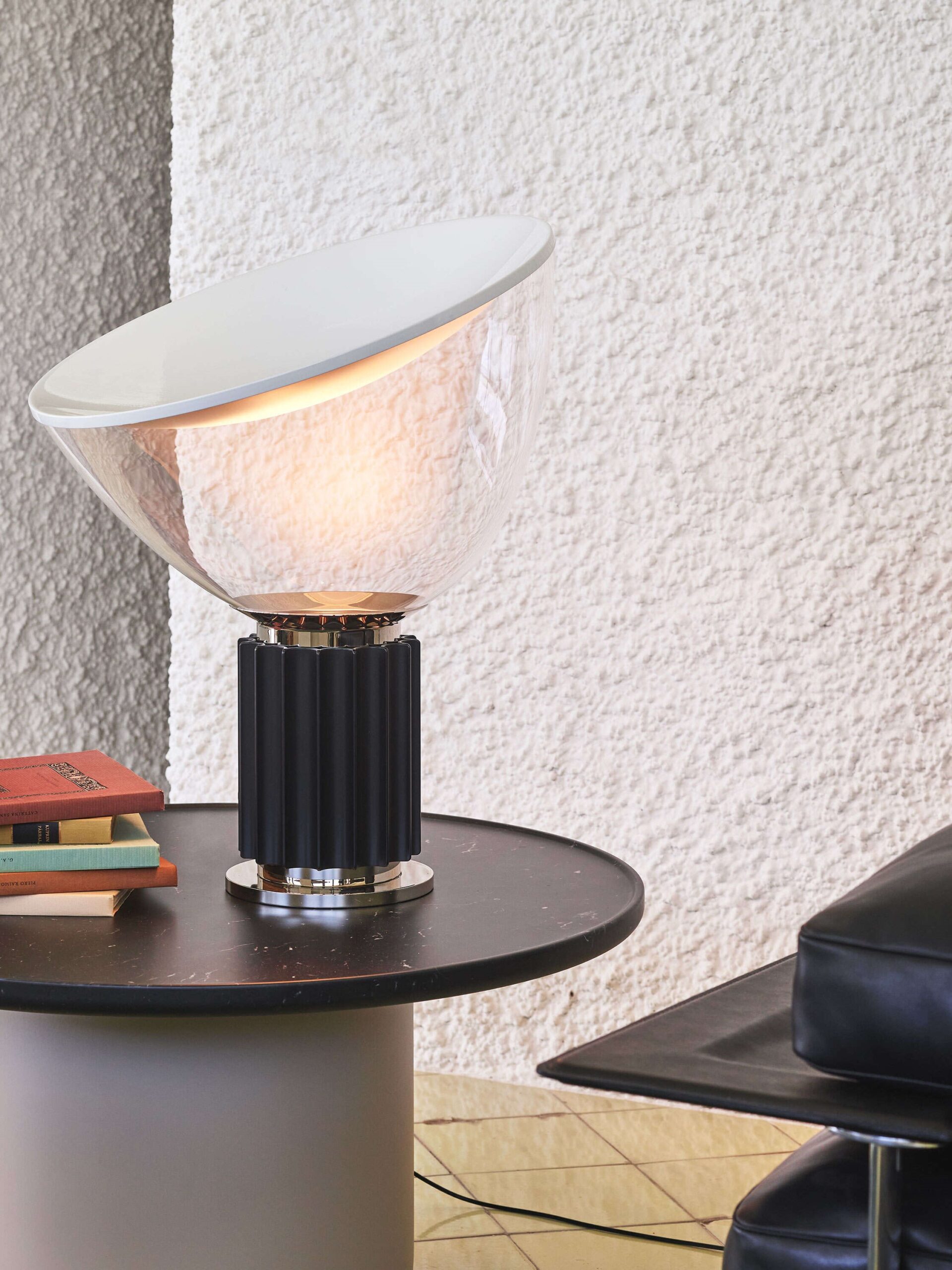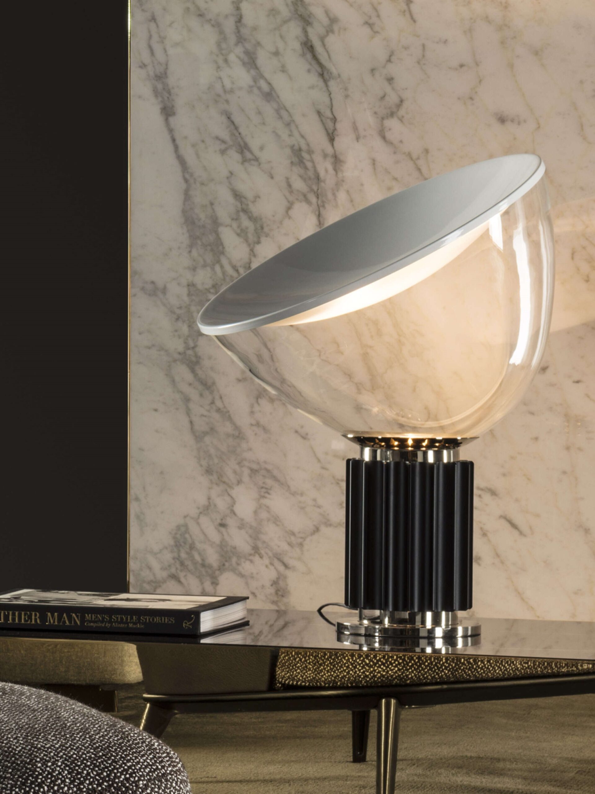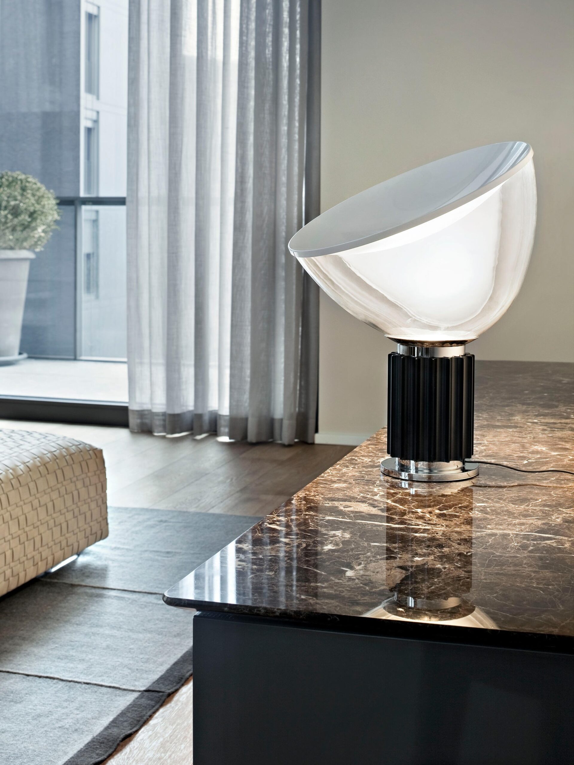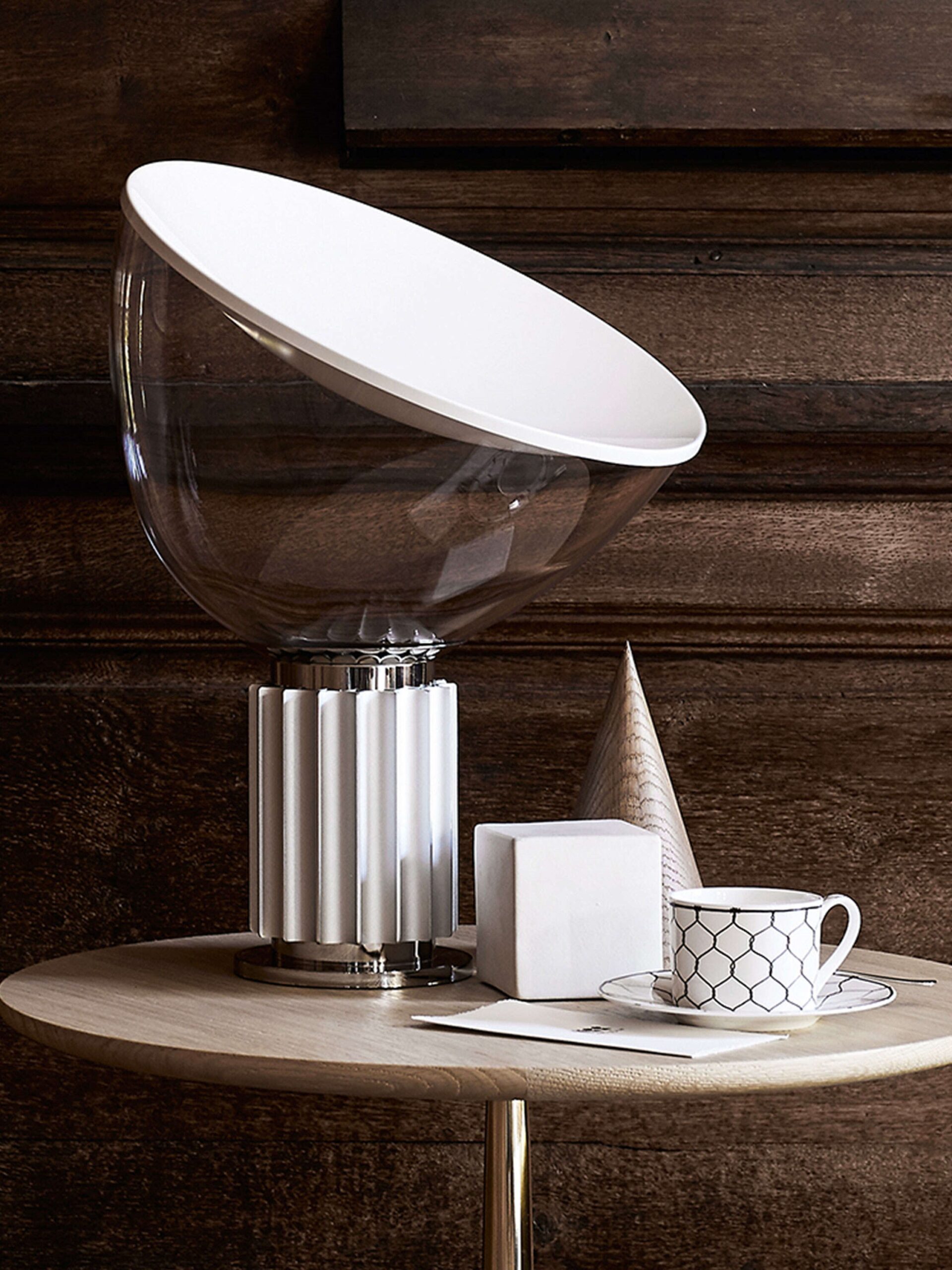 Oryginalny projekt Taccia z 1958 roku był wykonany z przezroczystego plastiku – pomysł został jednak odrzucony, ponieważ ciepło źródła światła go odkształcało. W 1962 roku Taccia została wyprodukowana przez firmę Flos ze słynną misą z dmuchanego szkła. Dzięki światłu LED można powrócić do oryginalnej koncepcji. Lampa stołowa zapewnia światło pośrednie i odbite