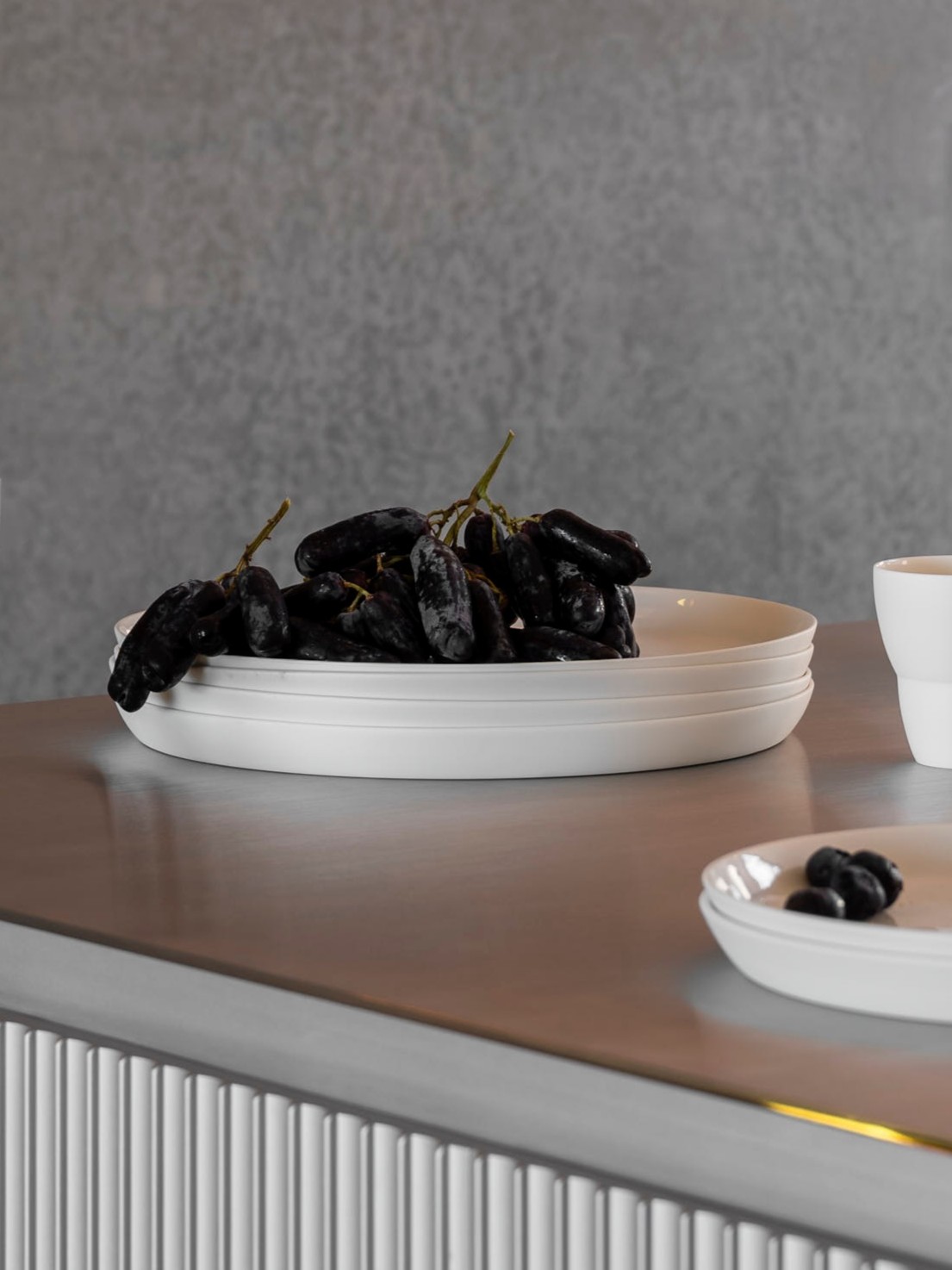 Talerz obiadowy Vipp jest ręcznie odlewany z wysokiej jakości porcelany.