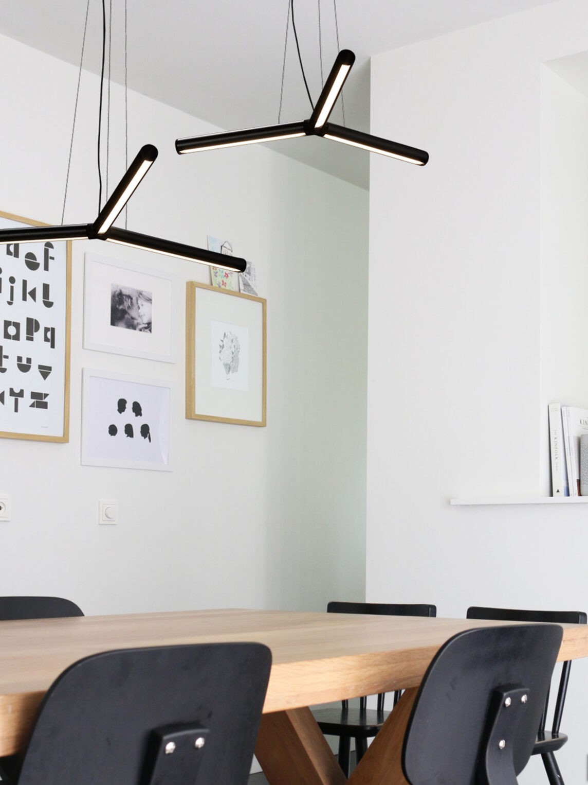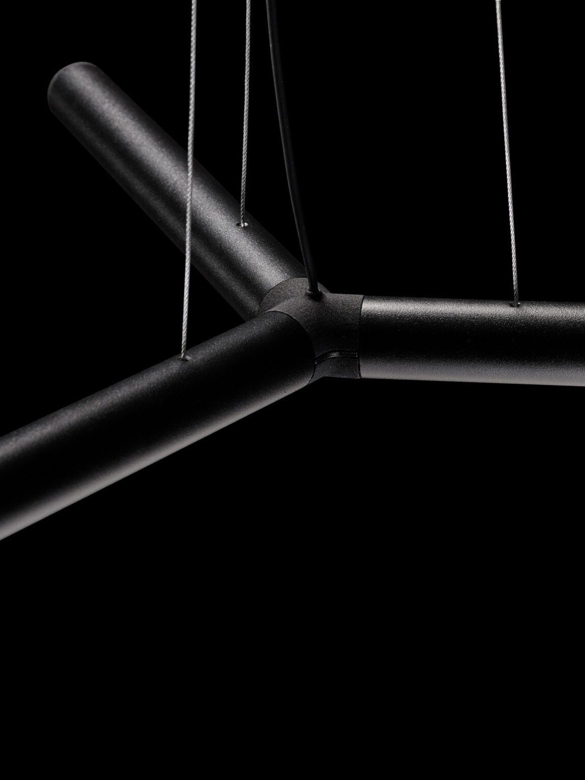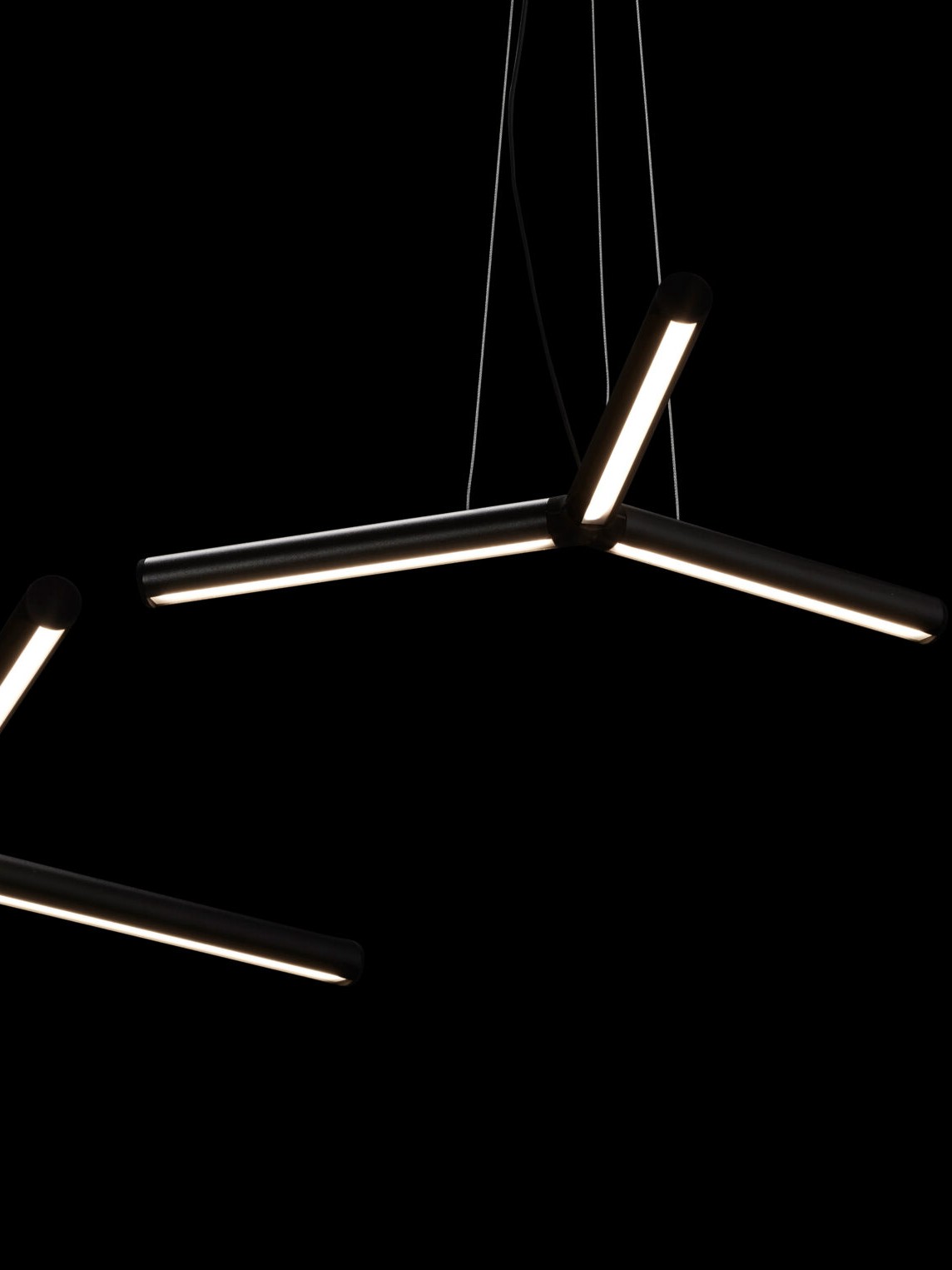 Nazwa Ypso nawiązuje do litery Ipsilon, która zainspirowała jej kształt. Światło rozchodzi się w trzech kierunkach, tworząc rozległą powierzchnię oświetlenia. Zainstalowana w grupie zdaje się tworzyć konstelacje w powietrzu. Wydrukowany w 3D element łączący utrzymuje rury na miejscu i stanowi elegancki element dekoracyjny. Ypso jest wyposażona w 3 stalowe linki, dzięki czemu można ją zamontować poziomo lub ukośnie, regulując każdy kabel osobno. Ta efektowna lampa wisząca posiada wysokowydajny pasek LED i jest dostępna w dwóch rozmiarach, w kolorze czarnym i białym.